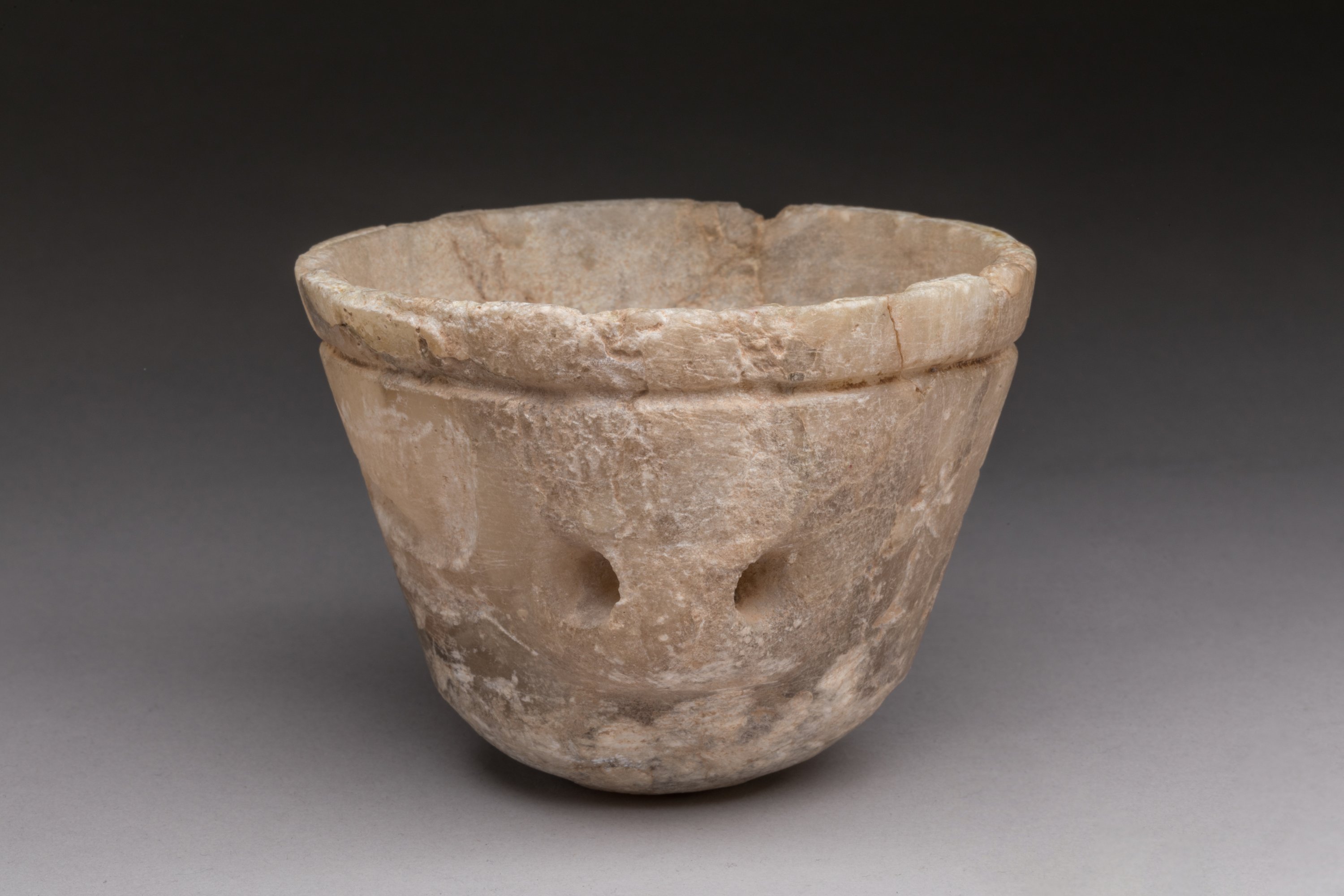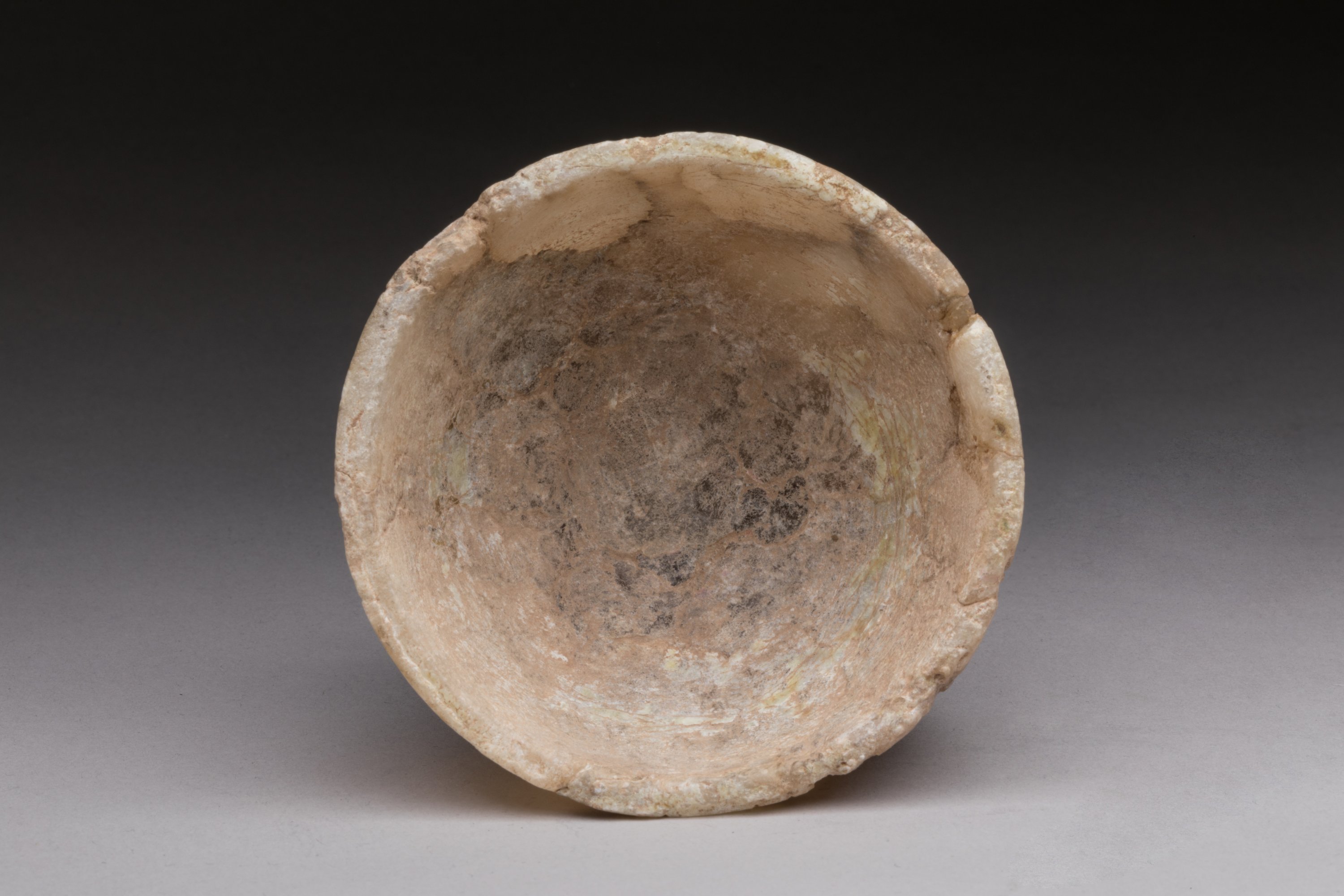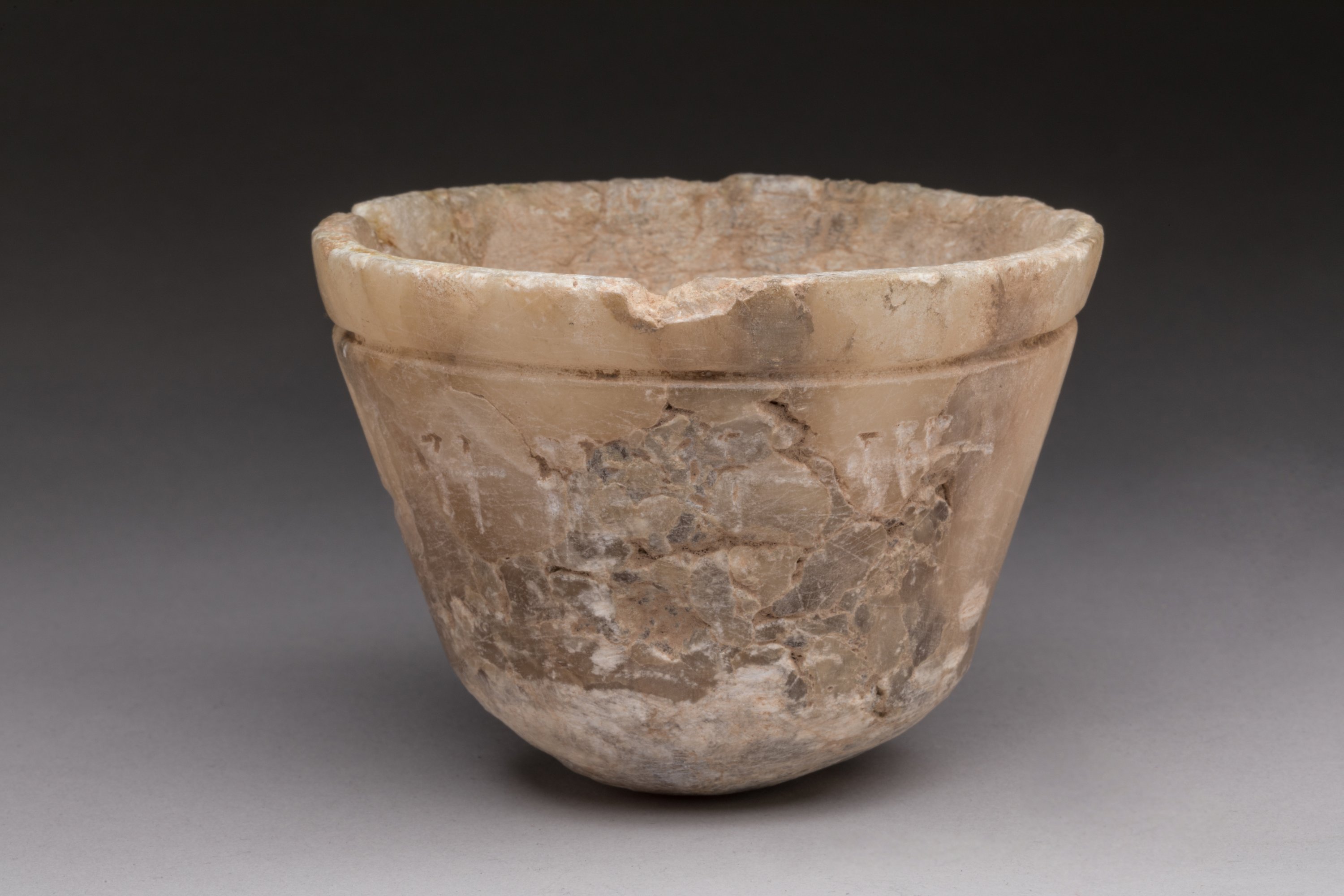 VASE en albâtre avec une inscription cunéiforme et un personnage trônant gravés ultérieurement. Base modifiée.