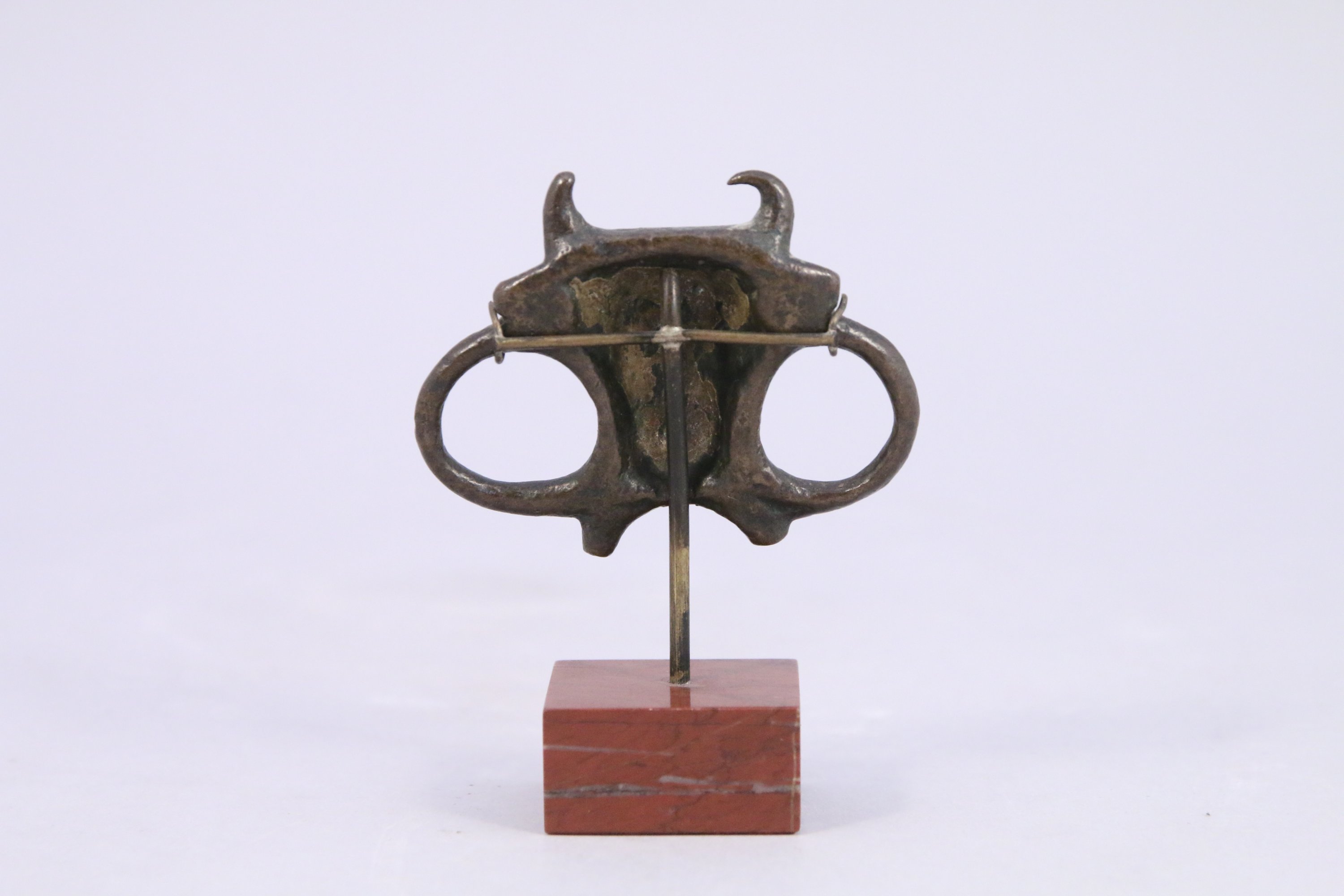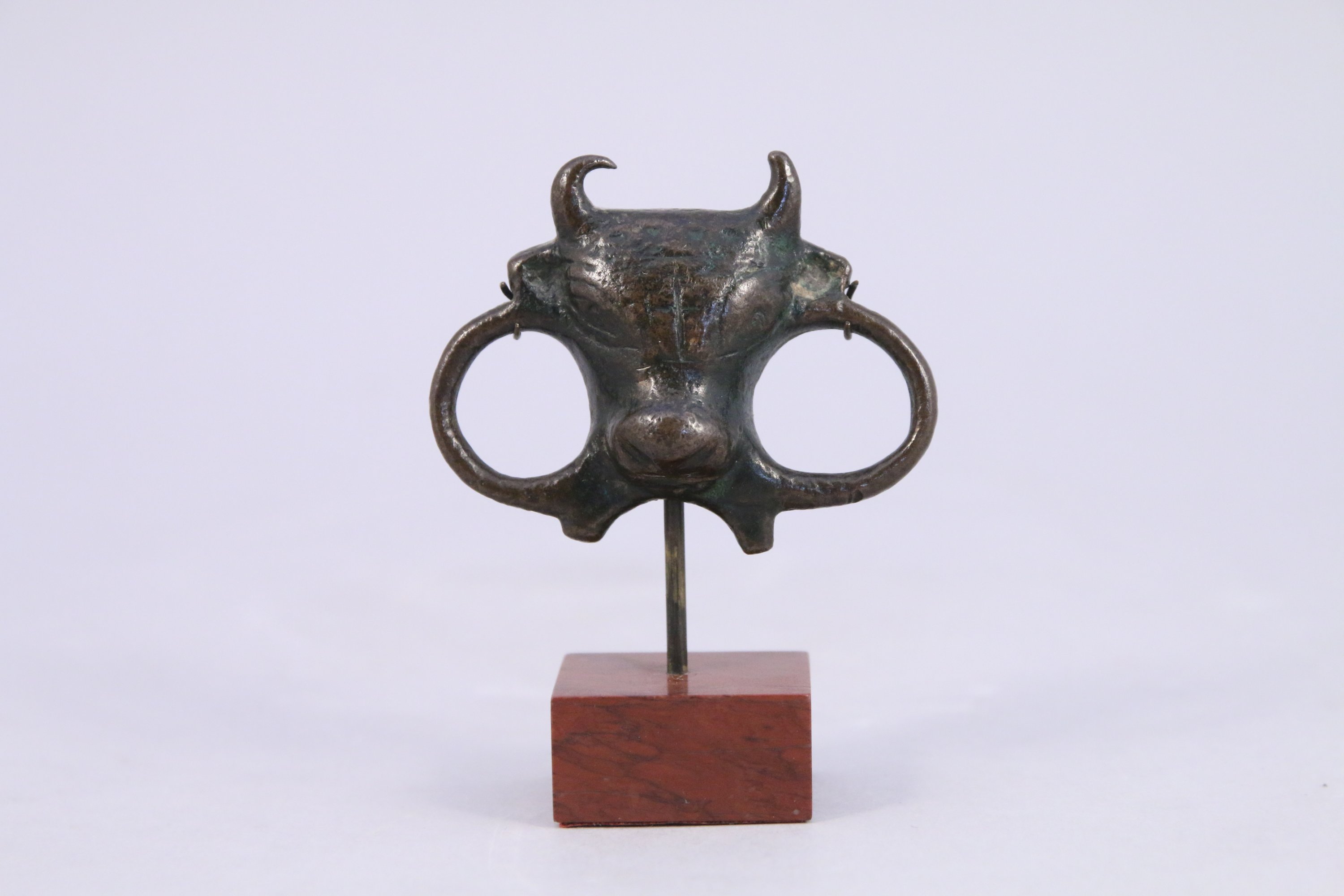 ÉLÉMENT d’HARNACHEMENT en bronze figurant une tête de taureau de face avec trois cercles. Ancien numéro de collection sous le socle.