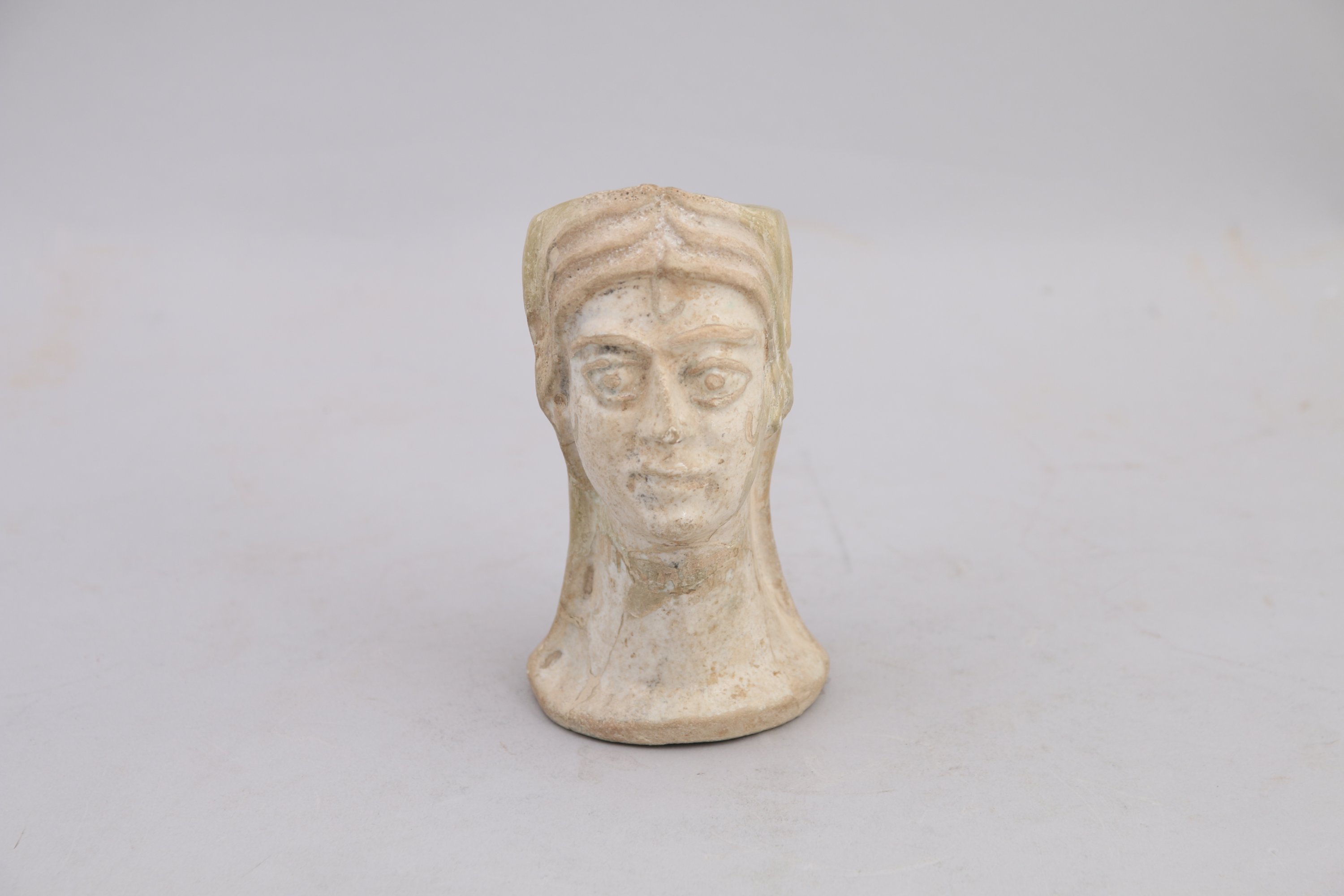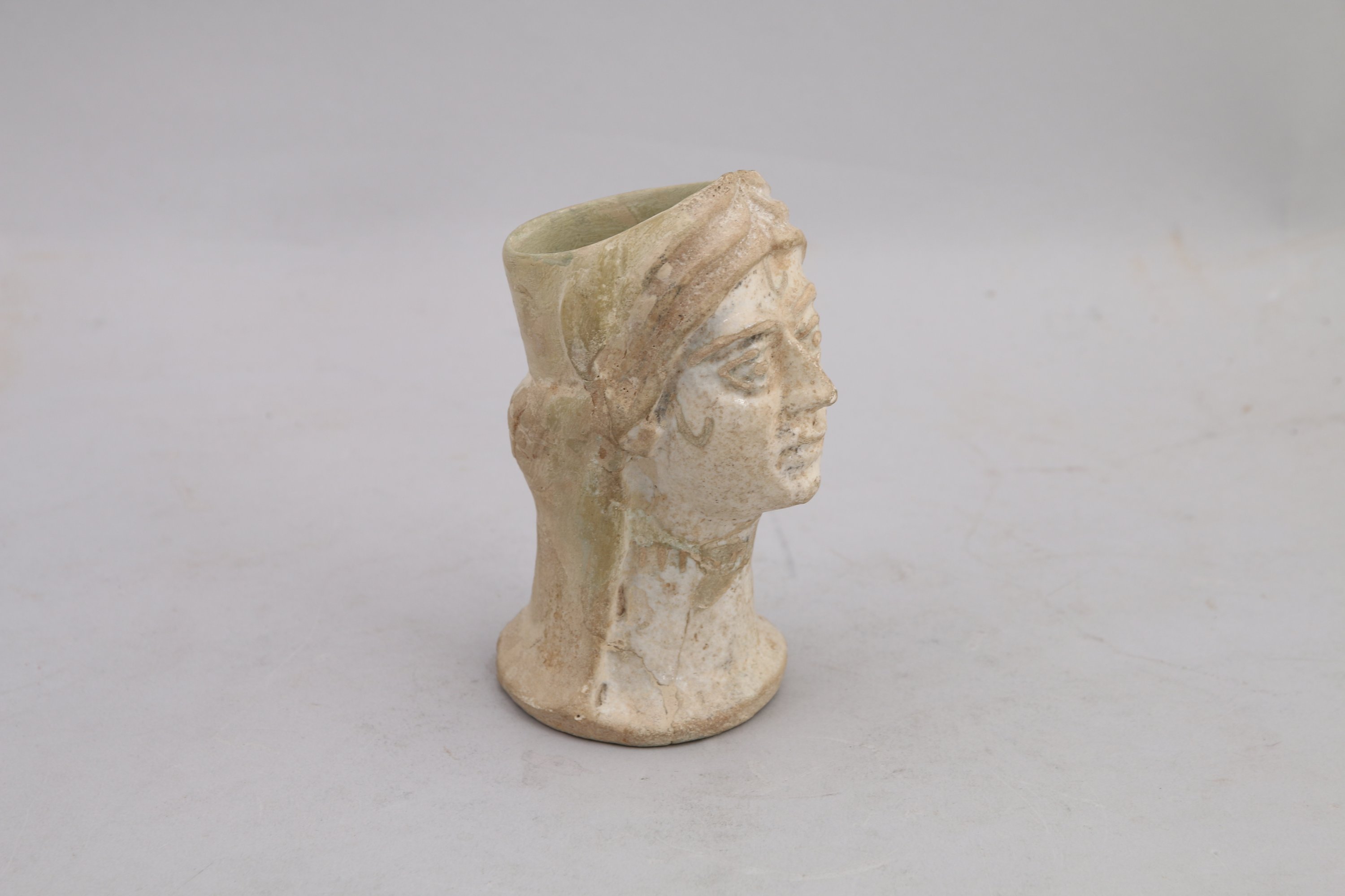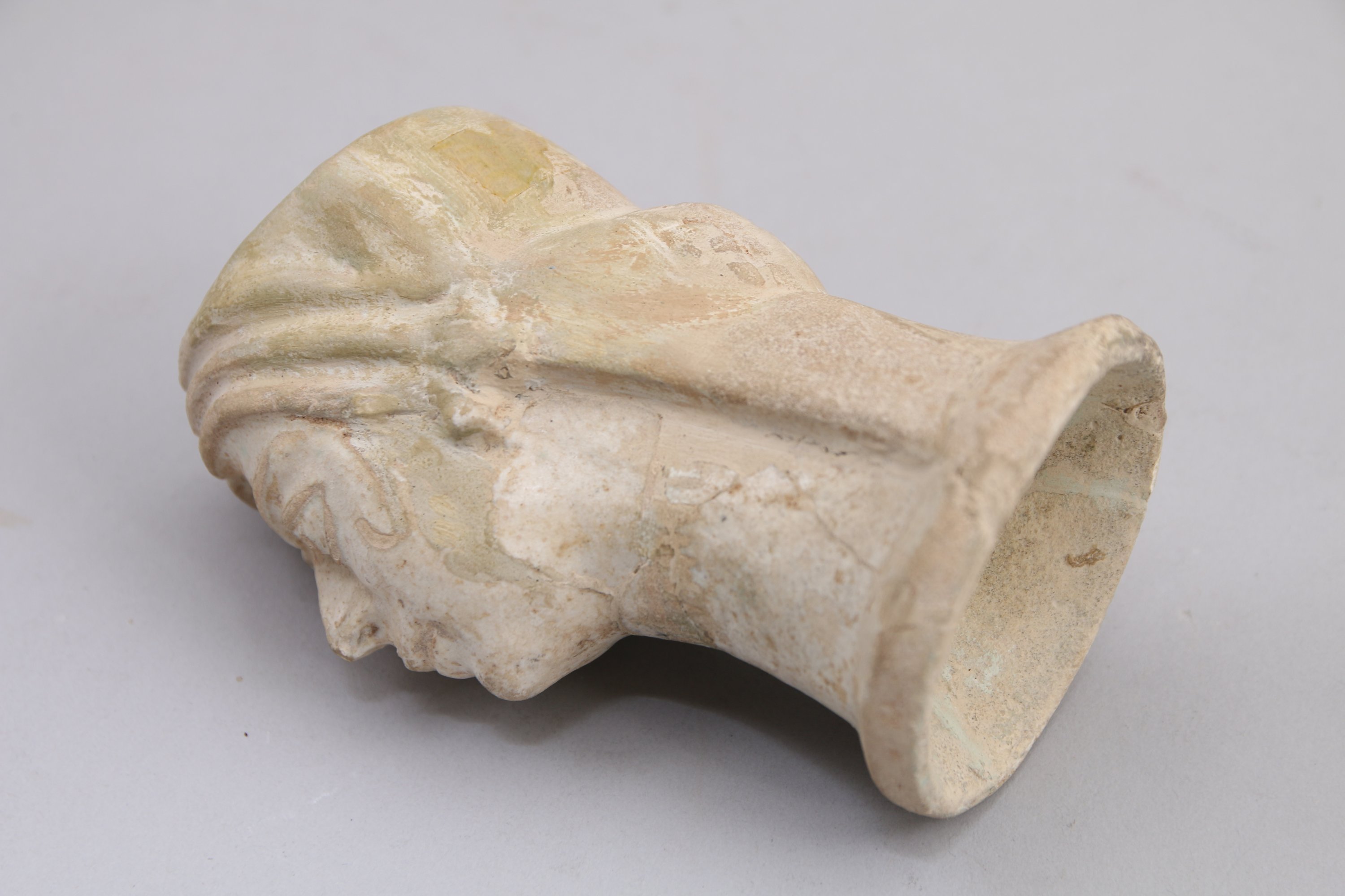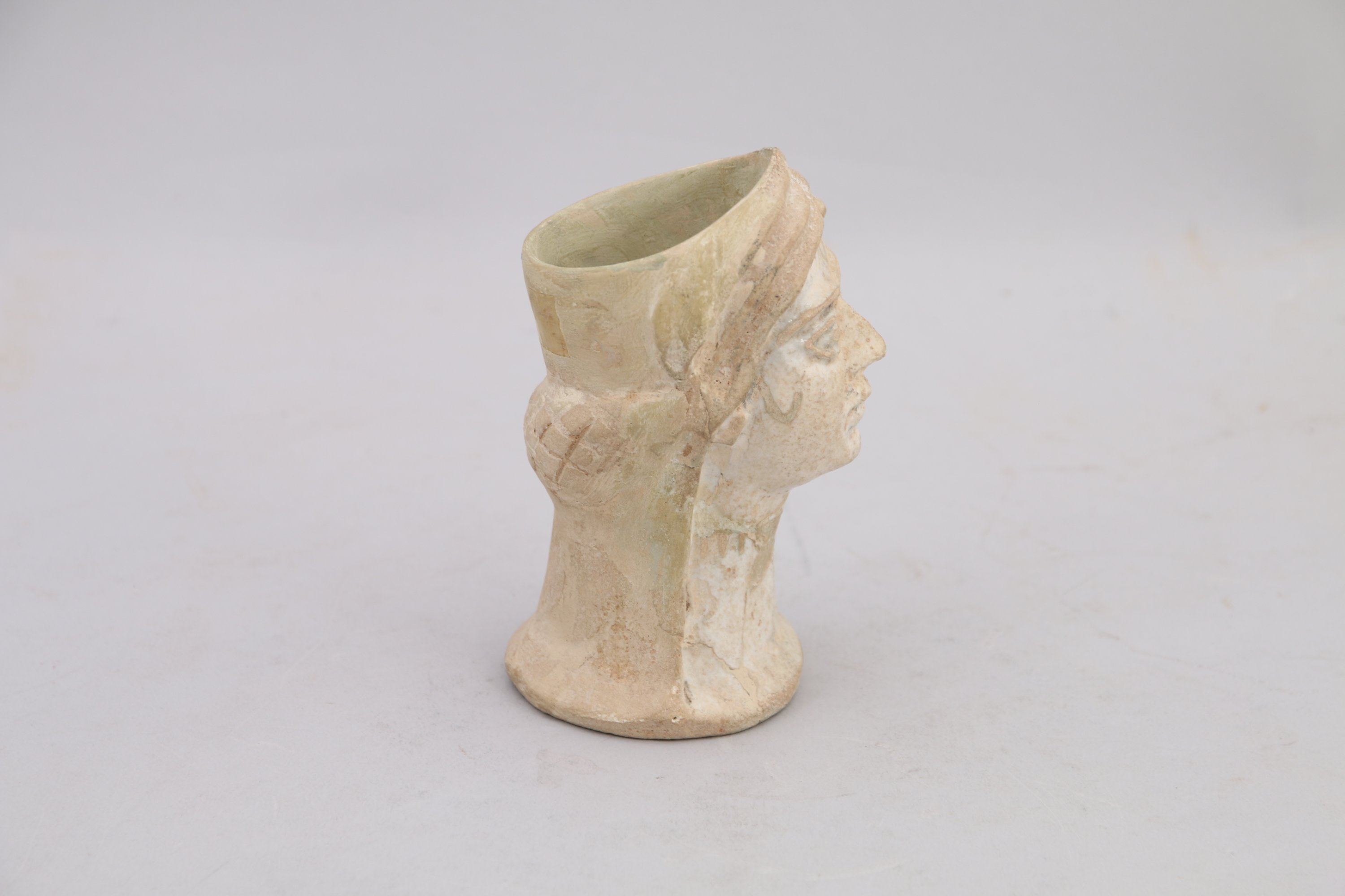 Rare GOBELET en faïence à décor de visage féminin en relief. Le fond blanc contrastait avec les couleurs, désormais disparues, qui soulignaient les yeux, les sourcils et les trois mèches de cheveux en forme d « accroche cur » sur le front et les joues. De même pour le collier et la coiffe à cornes, typique des divinités du Proche-Orient.