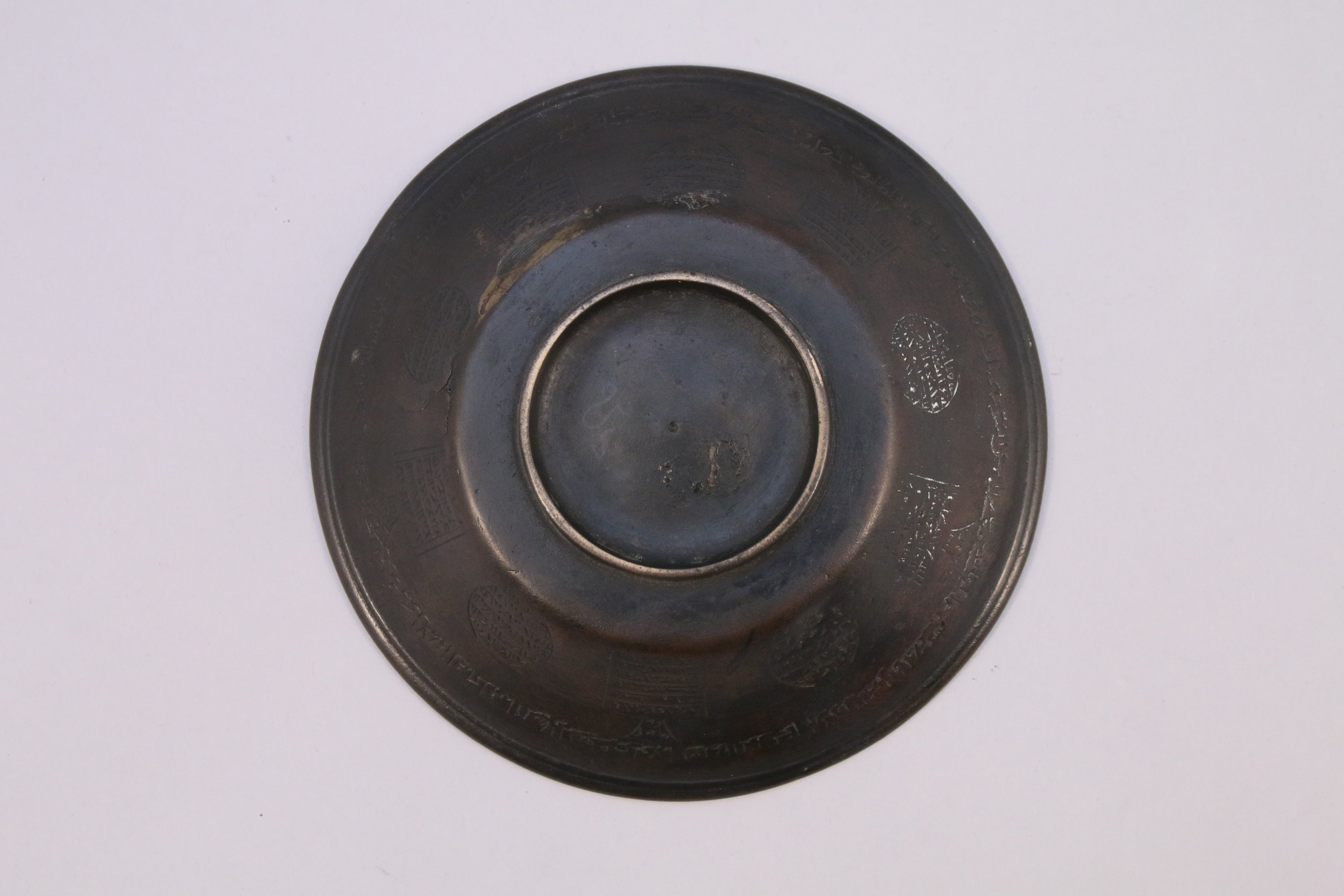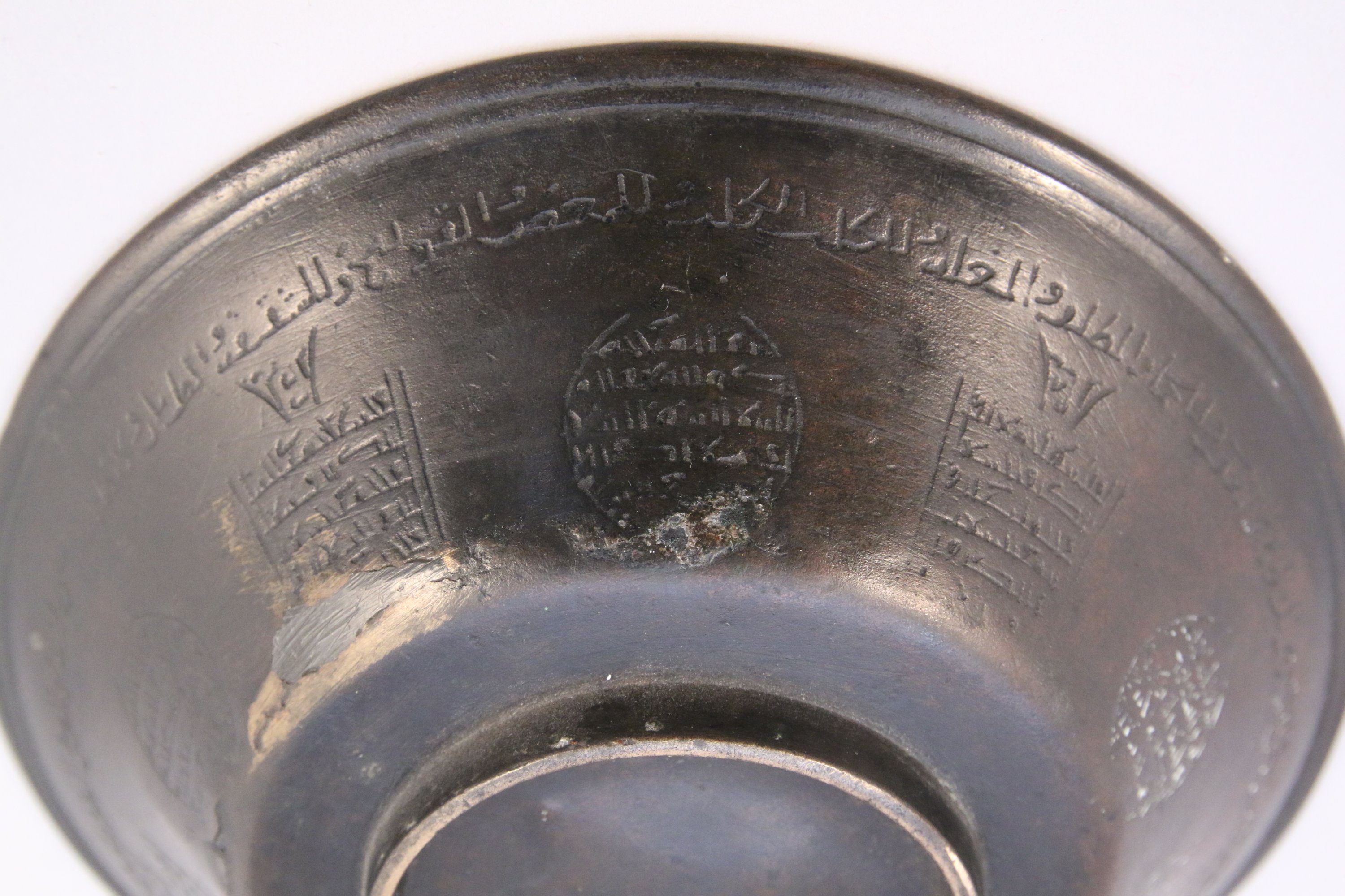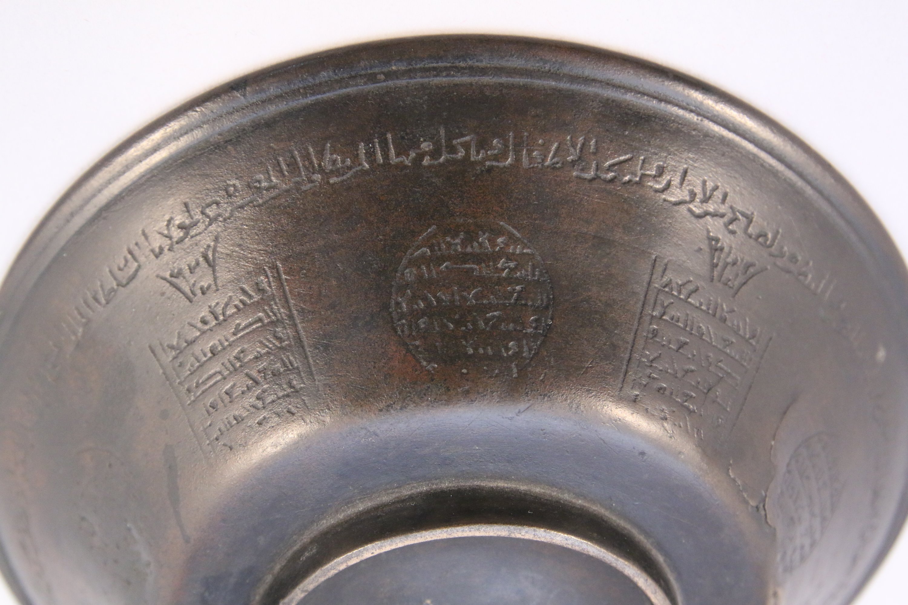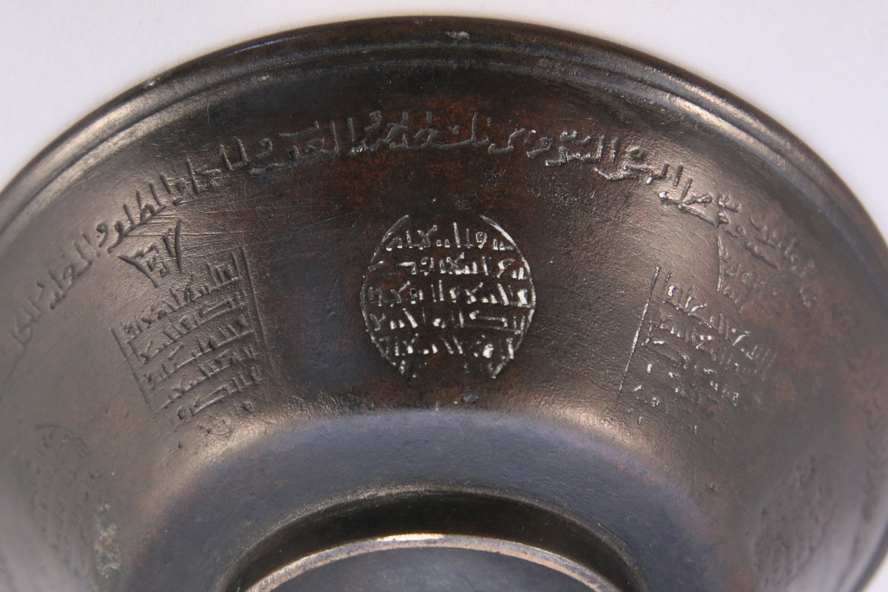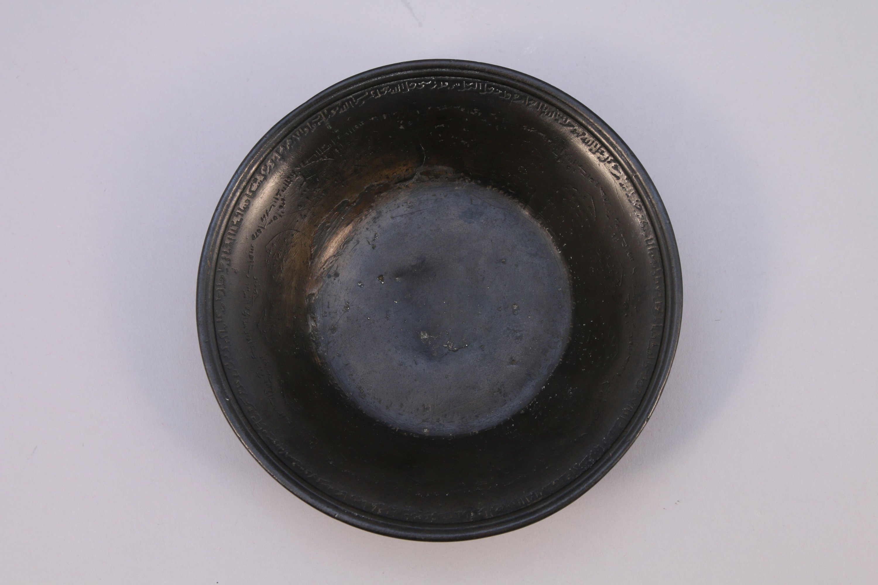 COUPE MAGIQUE en bronze, de forme évasée sur petit pied circulaire à décor gravé sur ses parois interne et externe d’inscriptions en arabe et de signes non identifiés, certains contenus dans des médaillons ou des cartouches.