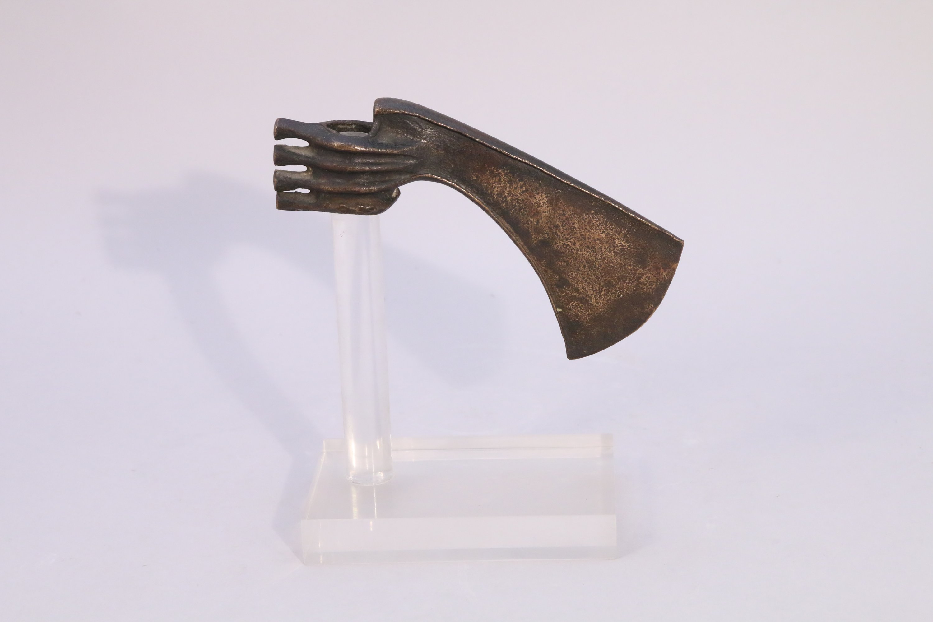 HACHE en bronze à lame incurvée et bords moulurés, prolongée sur le talon par quatre courtes digitations tronconiques.