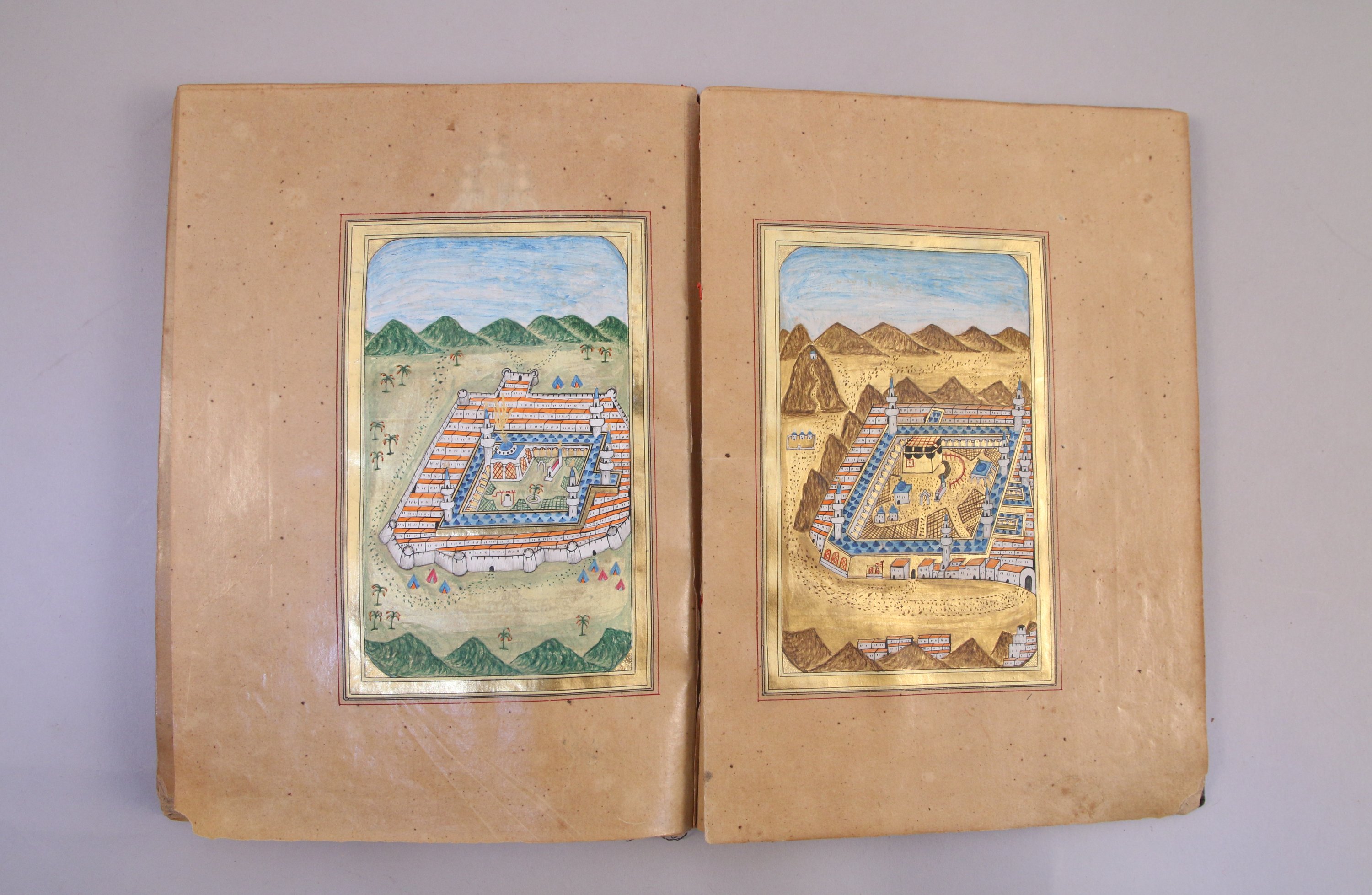 MANUSCRIT sur papier de 11 lignes de texte par page en arabe, en calligraphie cursive à l'encre noire. Frontispice enluminé à l'or et en polychromie d'une arcature florale intégrant palmettes enroulées et bouquets, le titre inscrit en lettres blanches sur fond d'or au centre. Plusieurs enluminures sous forme de cartouches à décor floral autour des titres de sections ou de rosettes rythmant le texte. Au cœur de l'ouvrage, double page illustrée à l'or et en polychromie des sanctuaires de la Mecque et de Médine. Colophon final encadré de deux cartouches enluminés à composition florale donnant la signature du copiste, Muhammad Amin Shawkat Turab, élève de al 'Hajj Mustafa 'azzat Hamid Allah et daté 1286 H /1869. Reliure en cuir noir à décor peint aux ors d'un médaillon losangique et d'écoinçons à garniture florale.