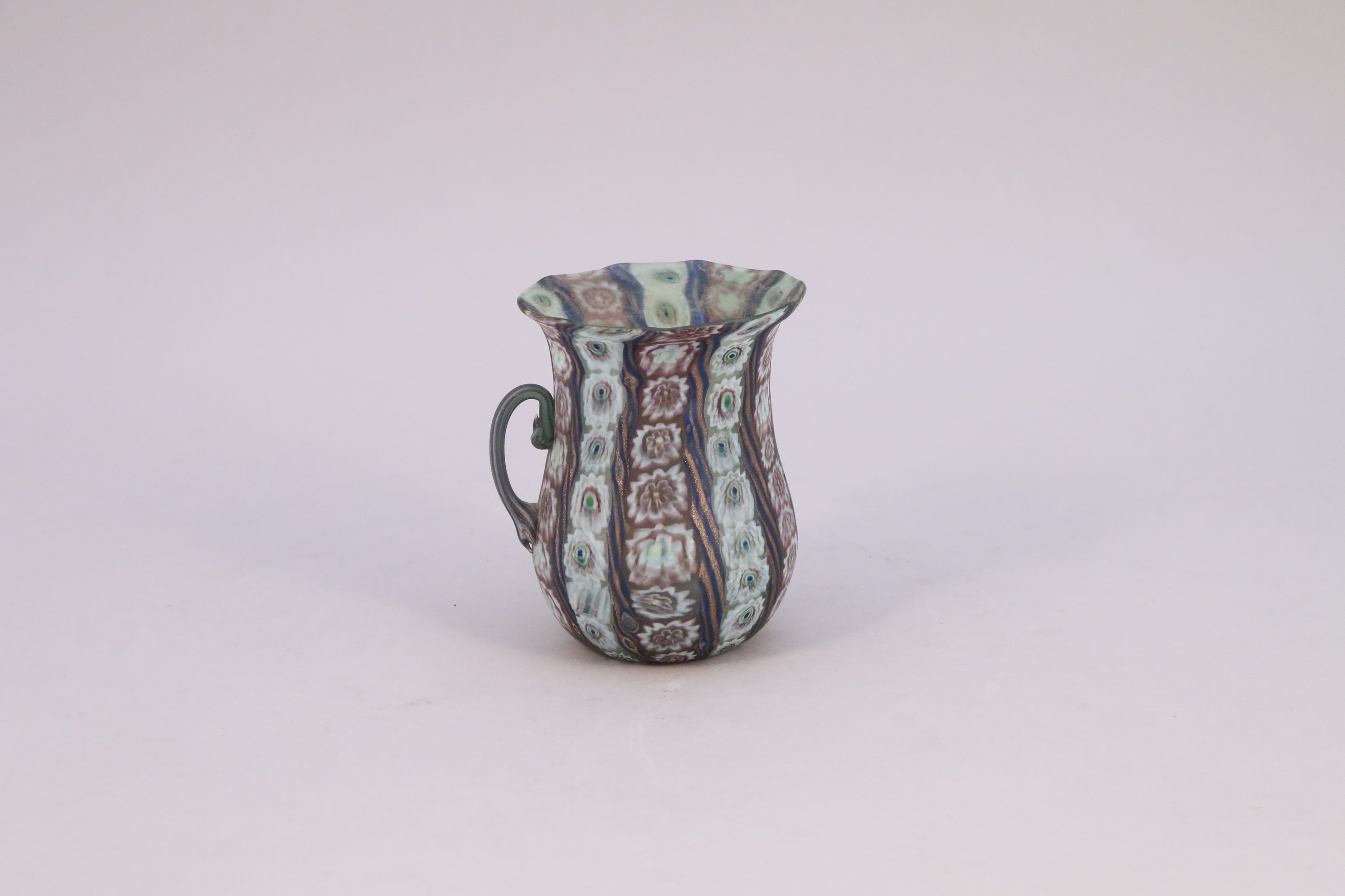 Tasse en verre mosaïqué / millefiori polychrome avec une anse. Cette technique se développa en Egypte durant la période hellénistique avant d’être reprise par les romains au début de l’Empire puis plus récemment.