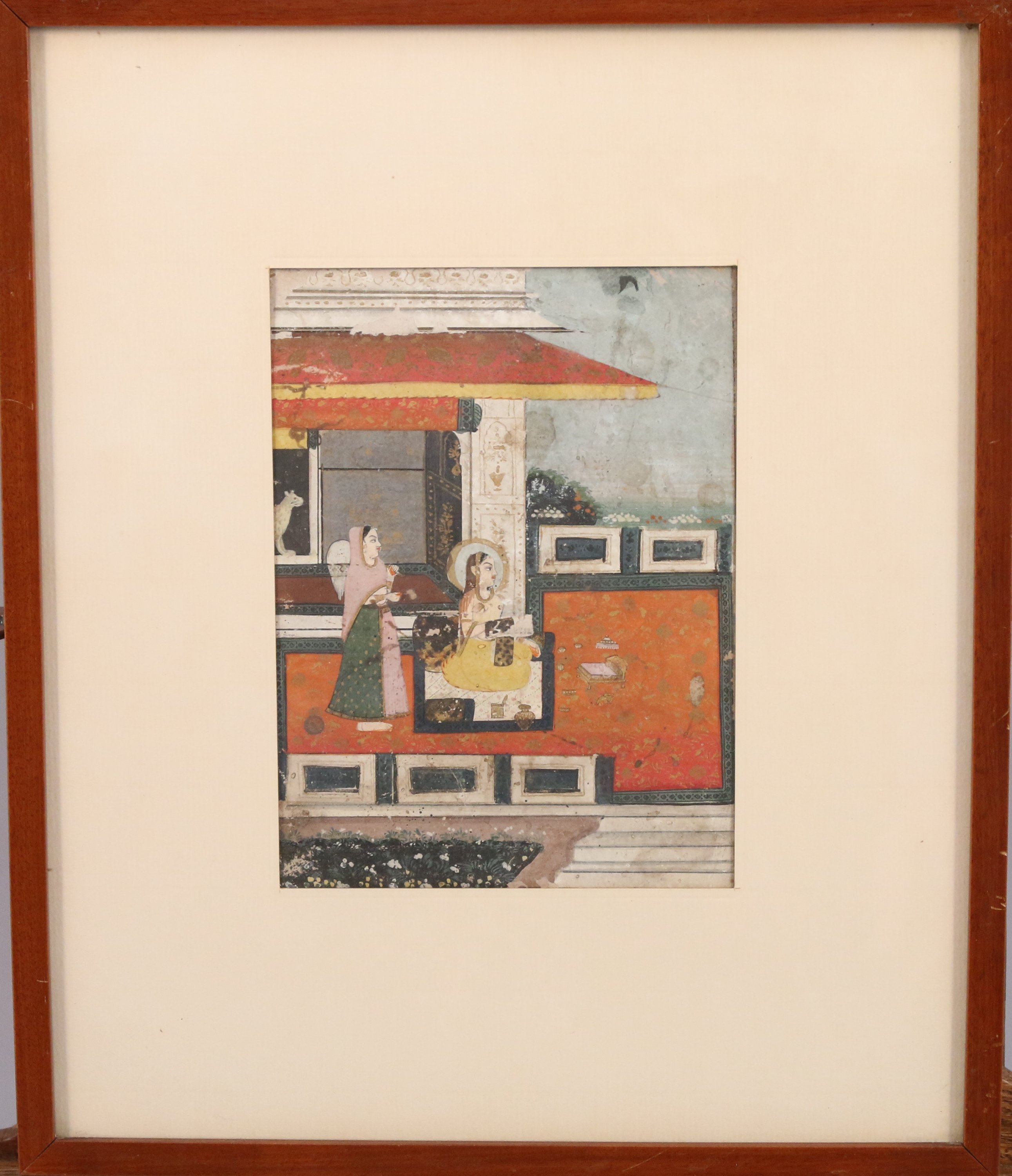 Une jeune femme assise sur la terrasse d'un pavillon devant un parterre de fleurs dessine le portrait de son amoureux absent, une servante debout derrière elle tenant un éventail, morshal.