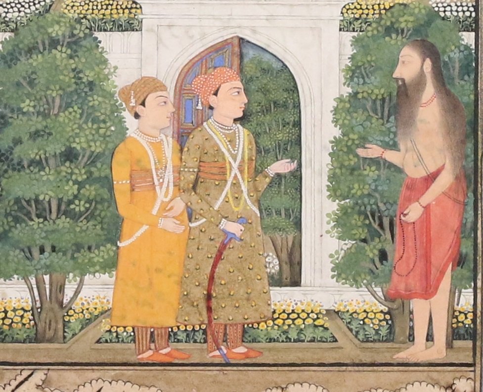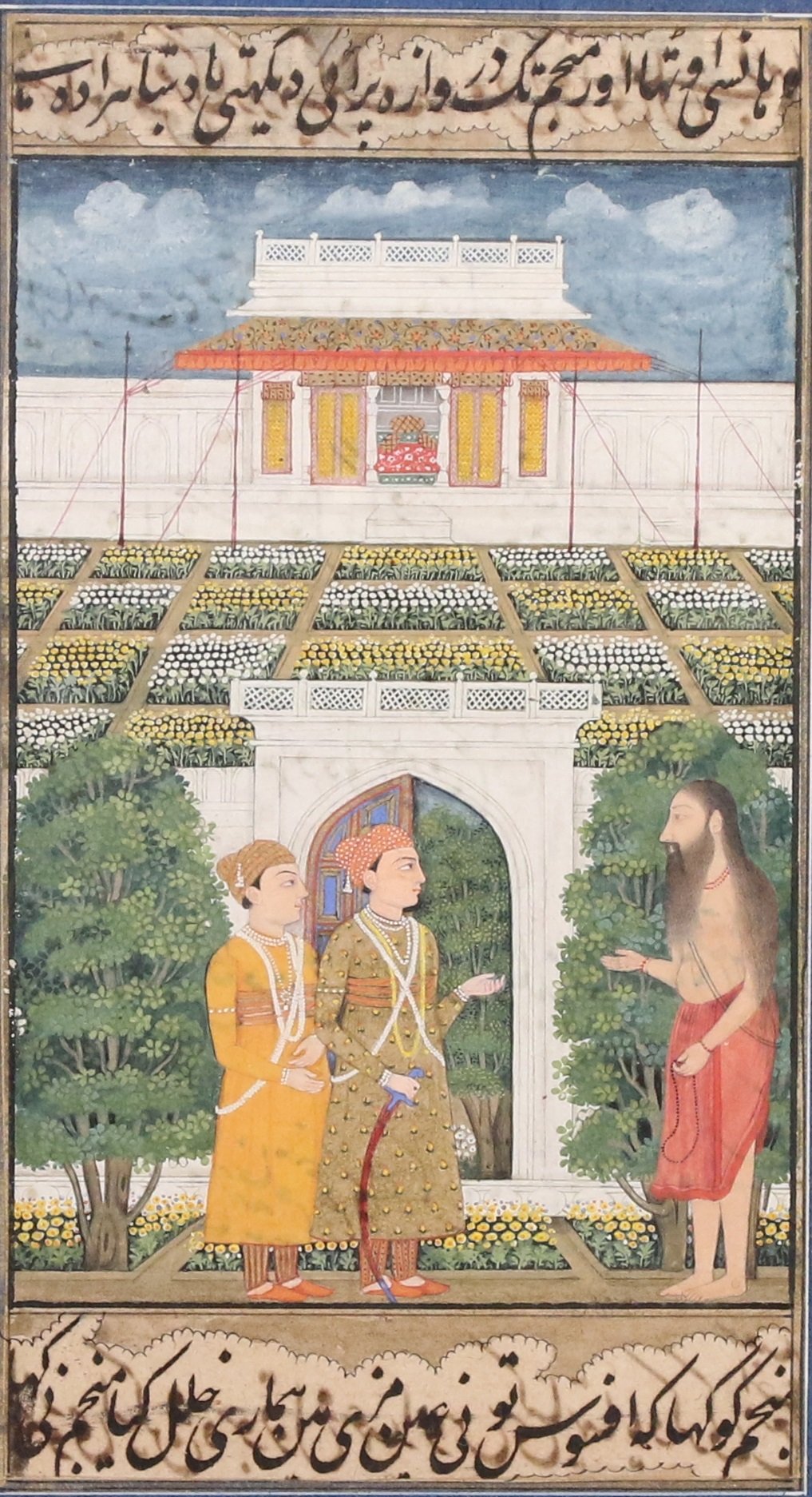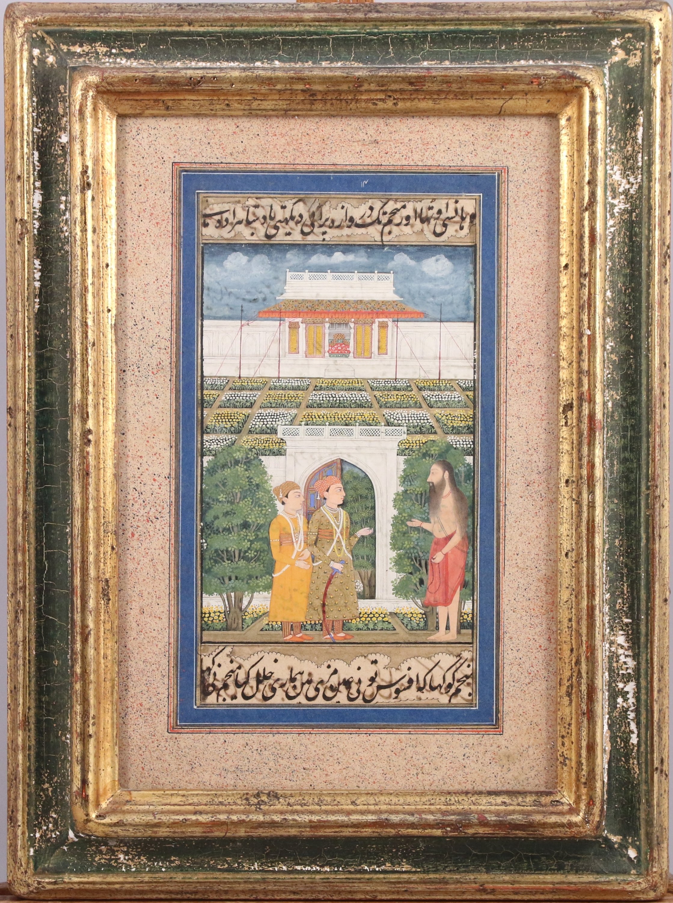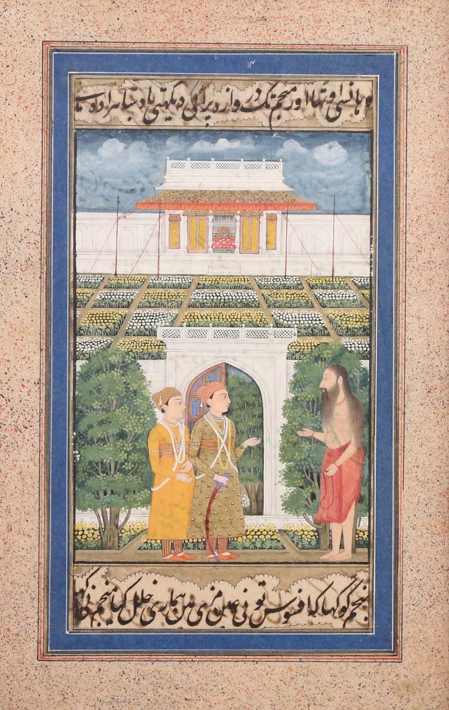 Ascète en conversation avec un prince devant l'entrée d'un jardin fleuri. Encadré par deux lignes de texte et marges mouchetées. Provient du même manuscrit que le lot suivant.