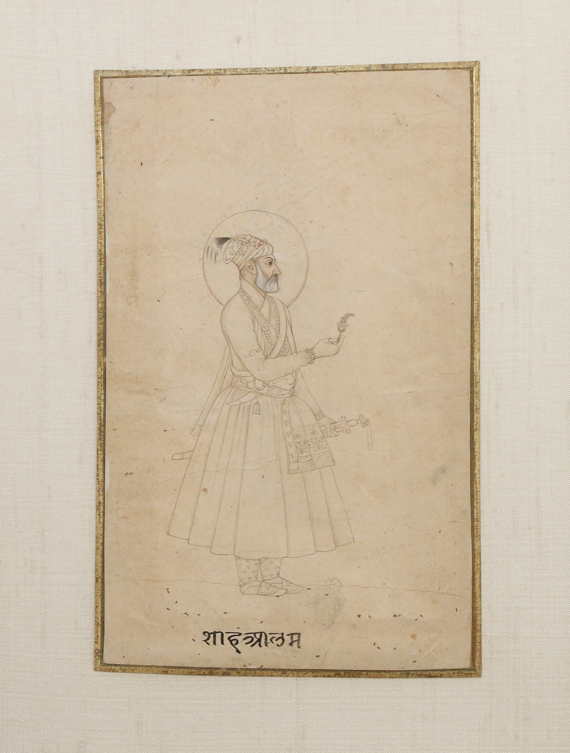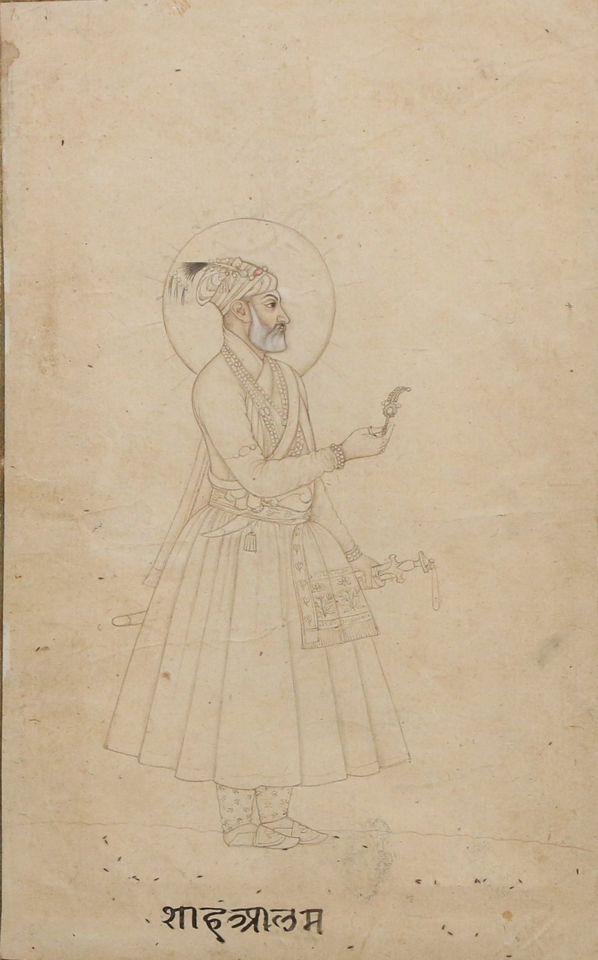 Portrait de Shah Alam (1759-1806) d'empereur moghol, debout de profil, vêtu d'une robe et d'un pantalon jama et tenant une aigrette. Inscription en nagari.