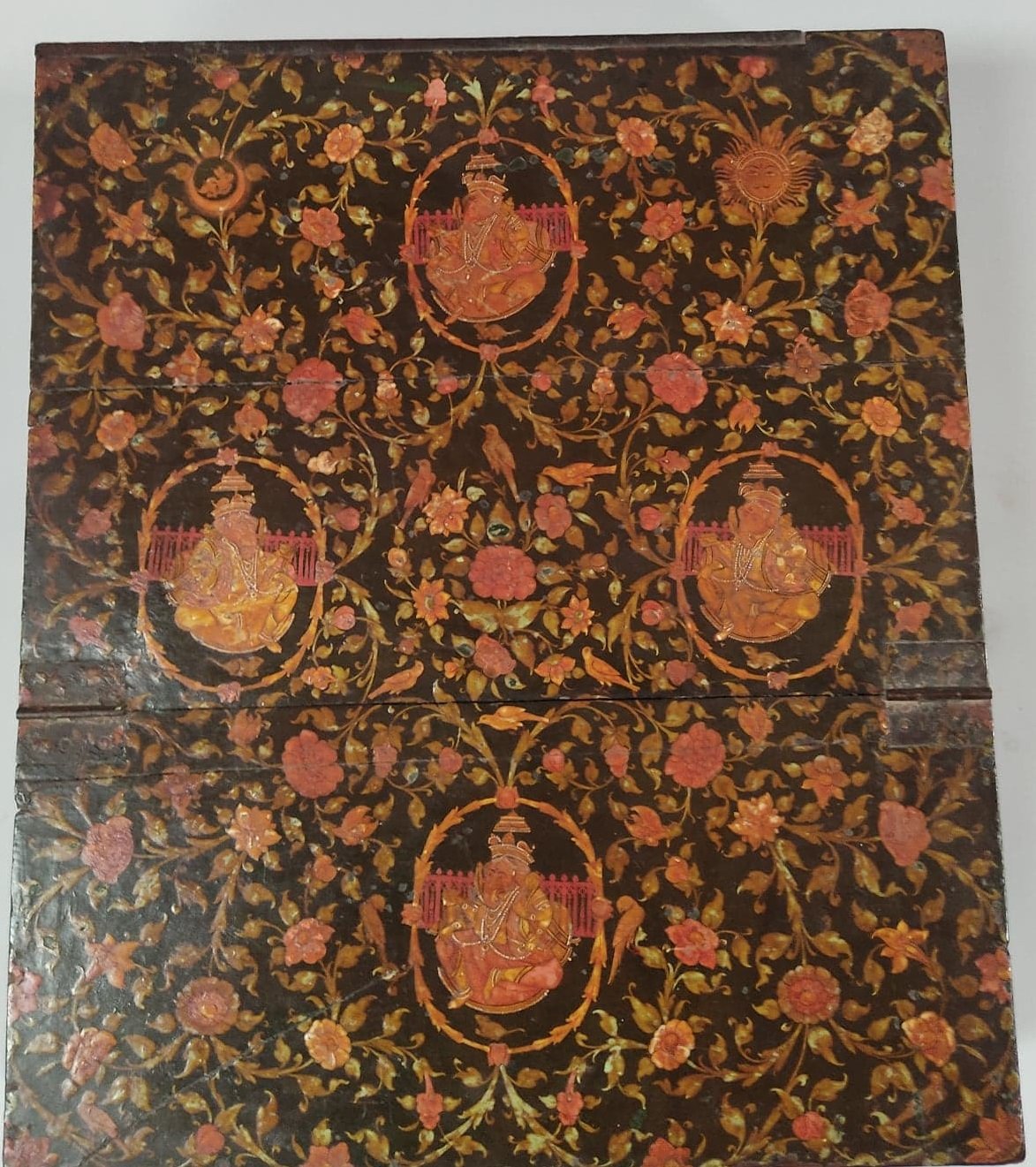 COFFRET à décor peint et laqué, de forme rectangulaire, à couvercle articulé et tiroir, et posé sur quatre pieds métalliques. En bois peint en polychromie rehaussée de dorure d’un décor de rinceaux floraux intégrant des figures de Ganesh dans des médaillons.