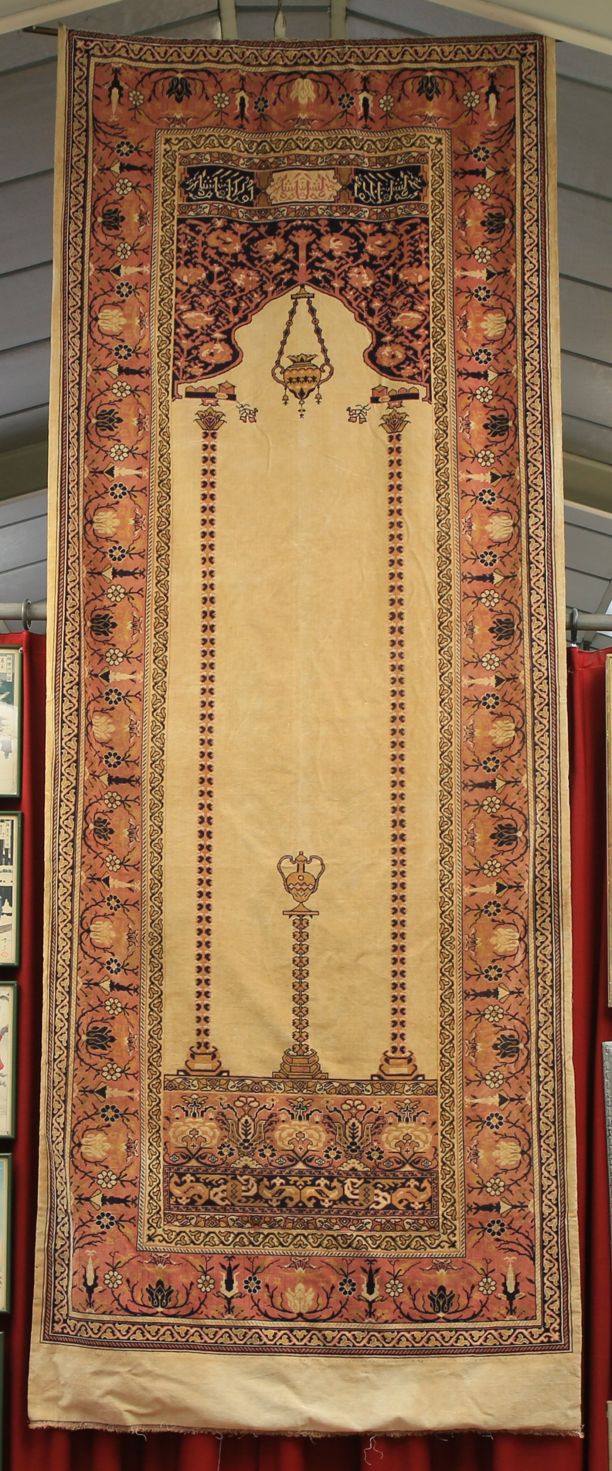 TENTURE de MOSQUÉE en tissage Jacquard, en velours crème, décor d’une lampe de mosquée entre deux colonnes soutenant une arcature fleurie avec inscriptions islamiques, bordure prune de rinceaux de fleurs Shah Abbas