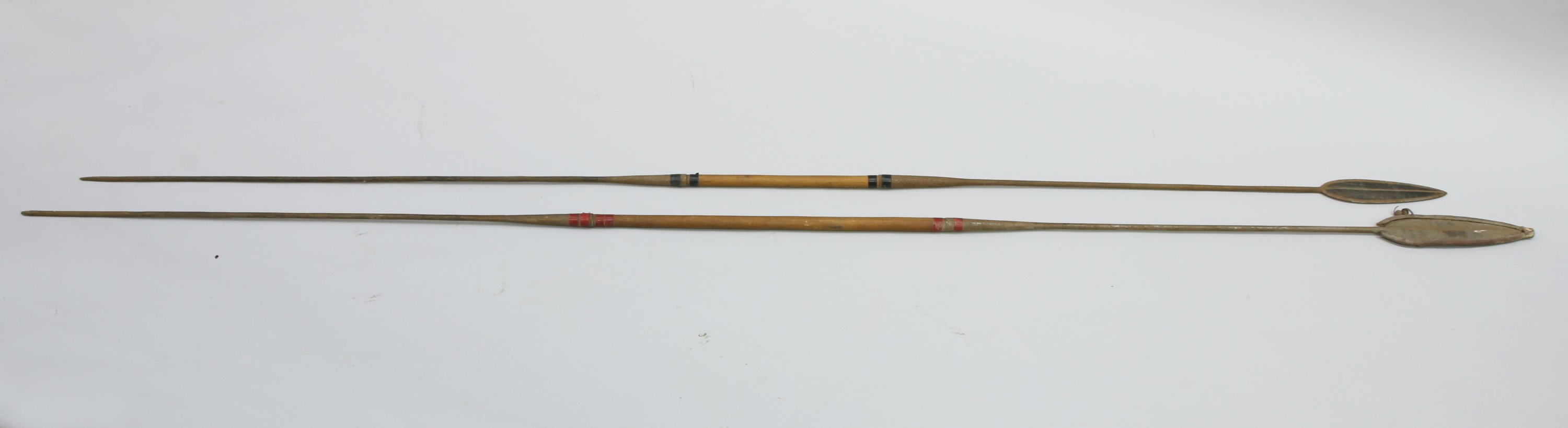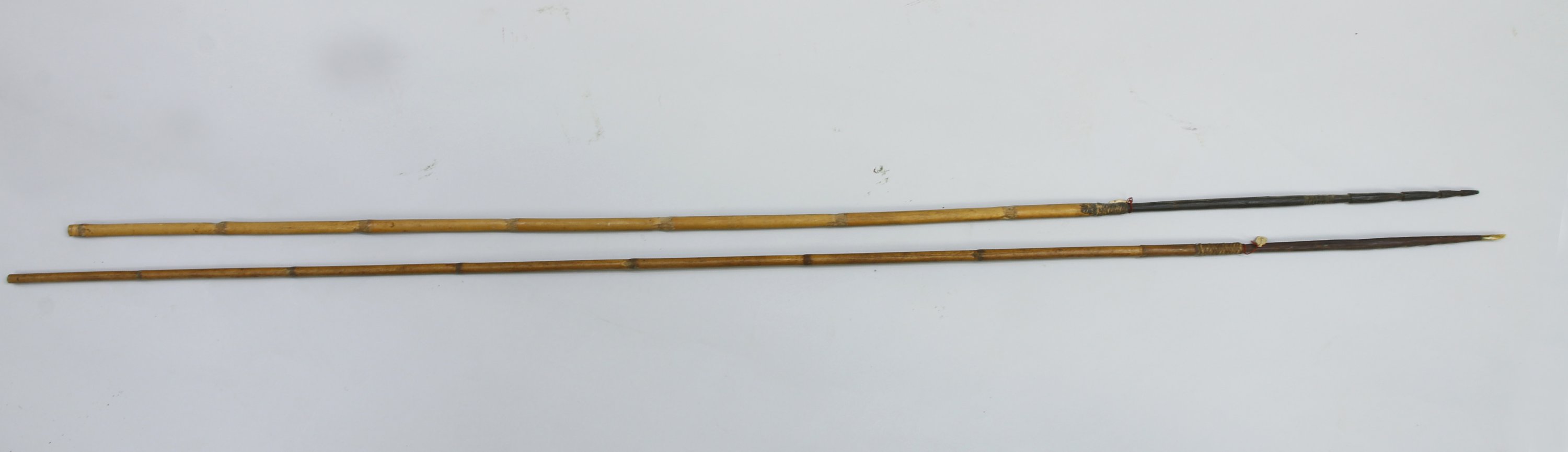 - Deux petits harpons, manche en roseau, pointe dentelée en bois. Long 150 et 144 cm.