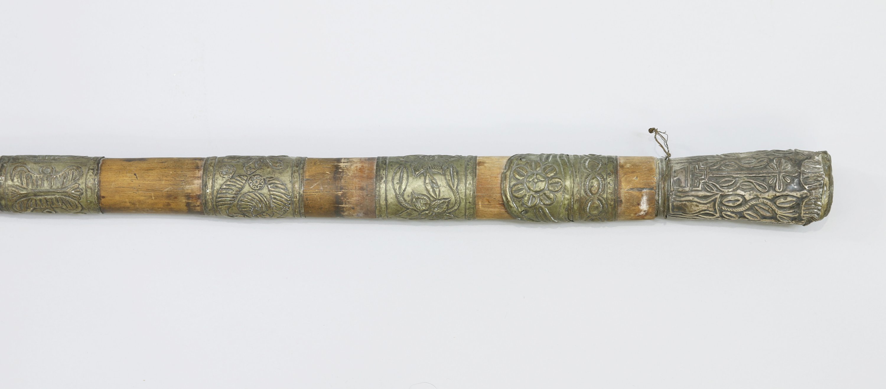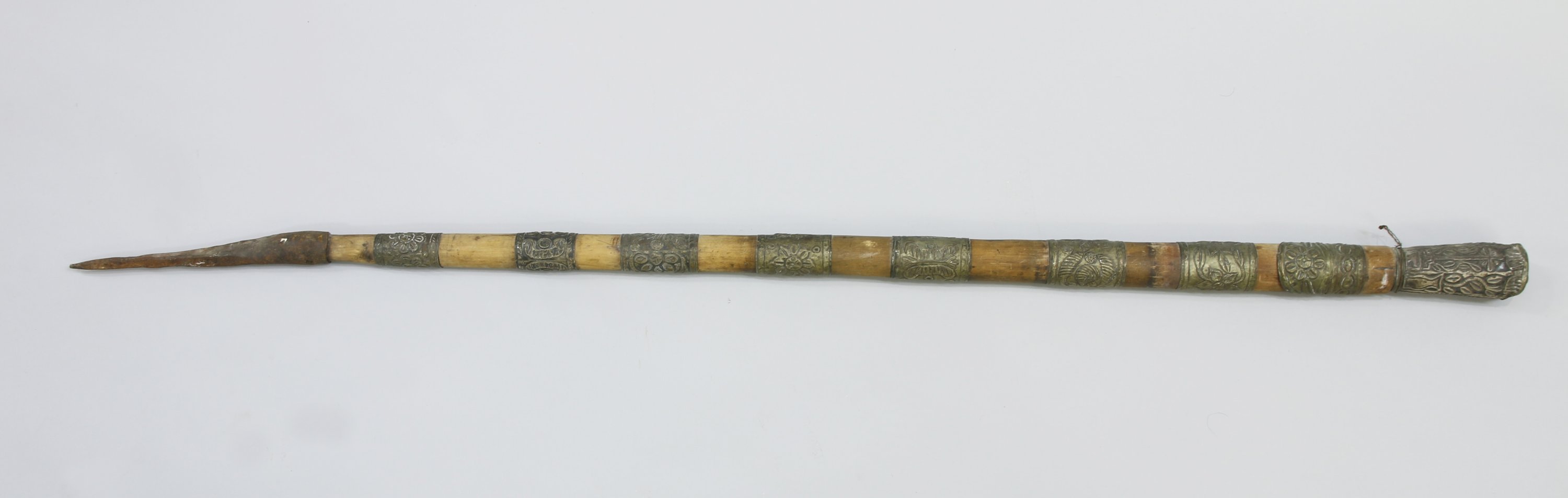 - Canne à garnitures métalliques repoussées. Queue en fer. Long. 122 cm.