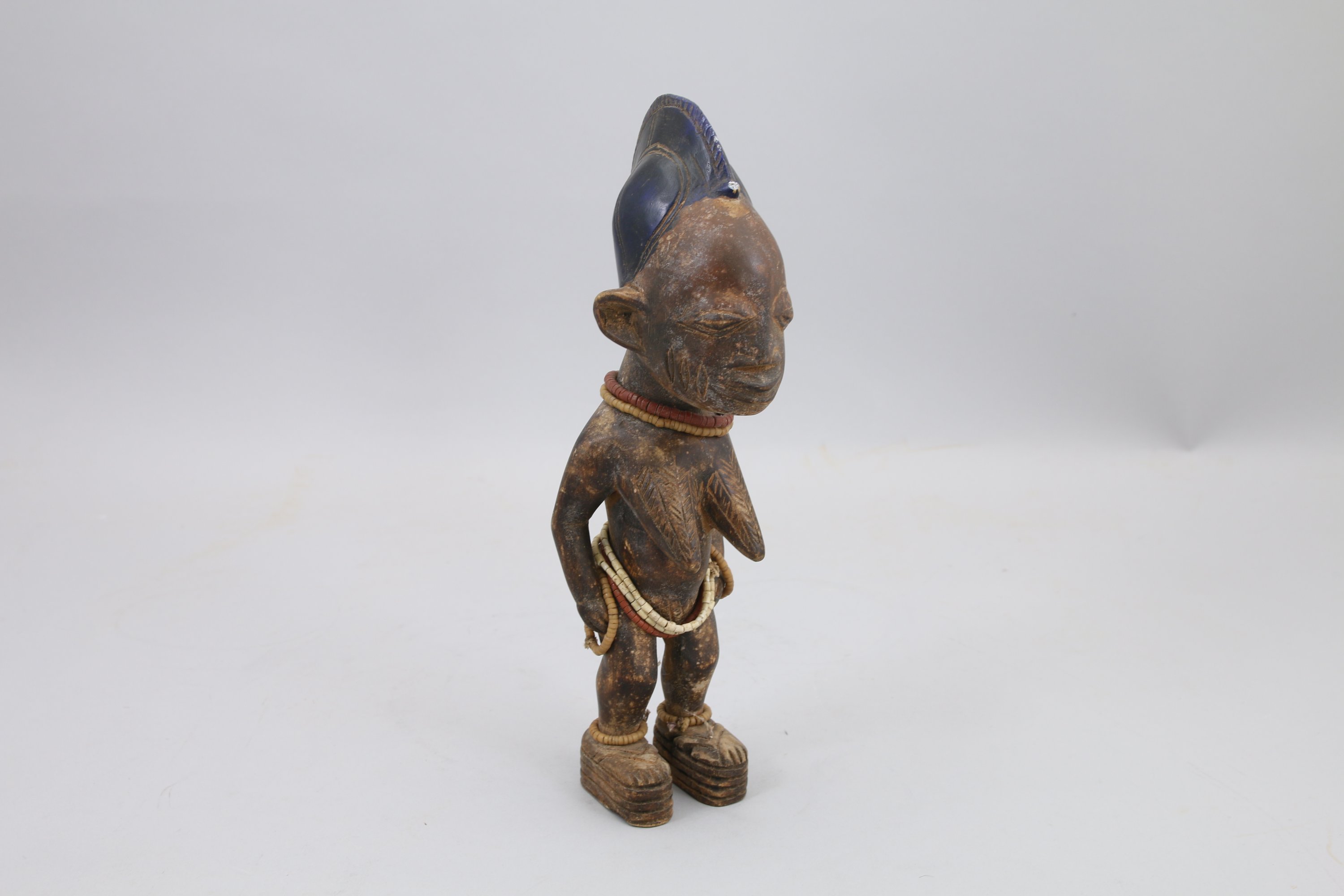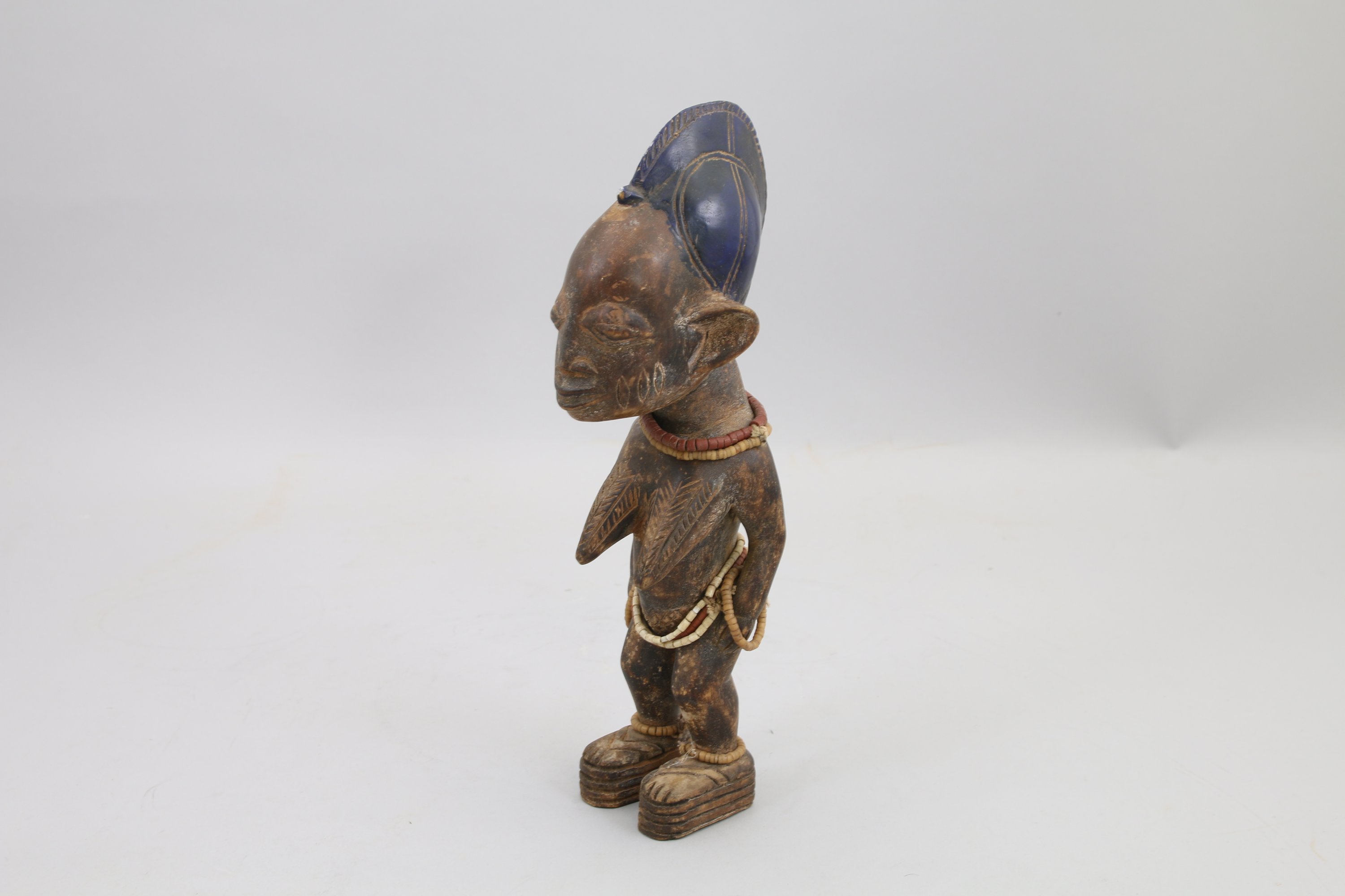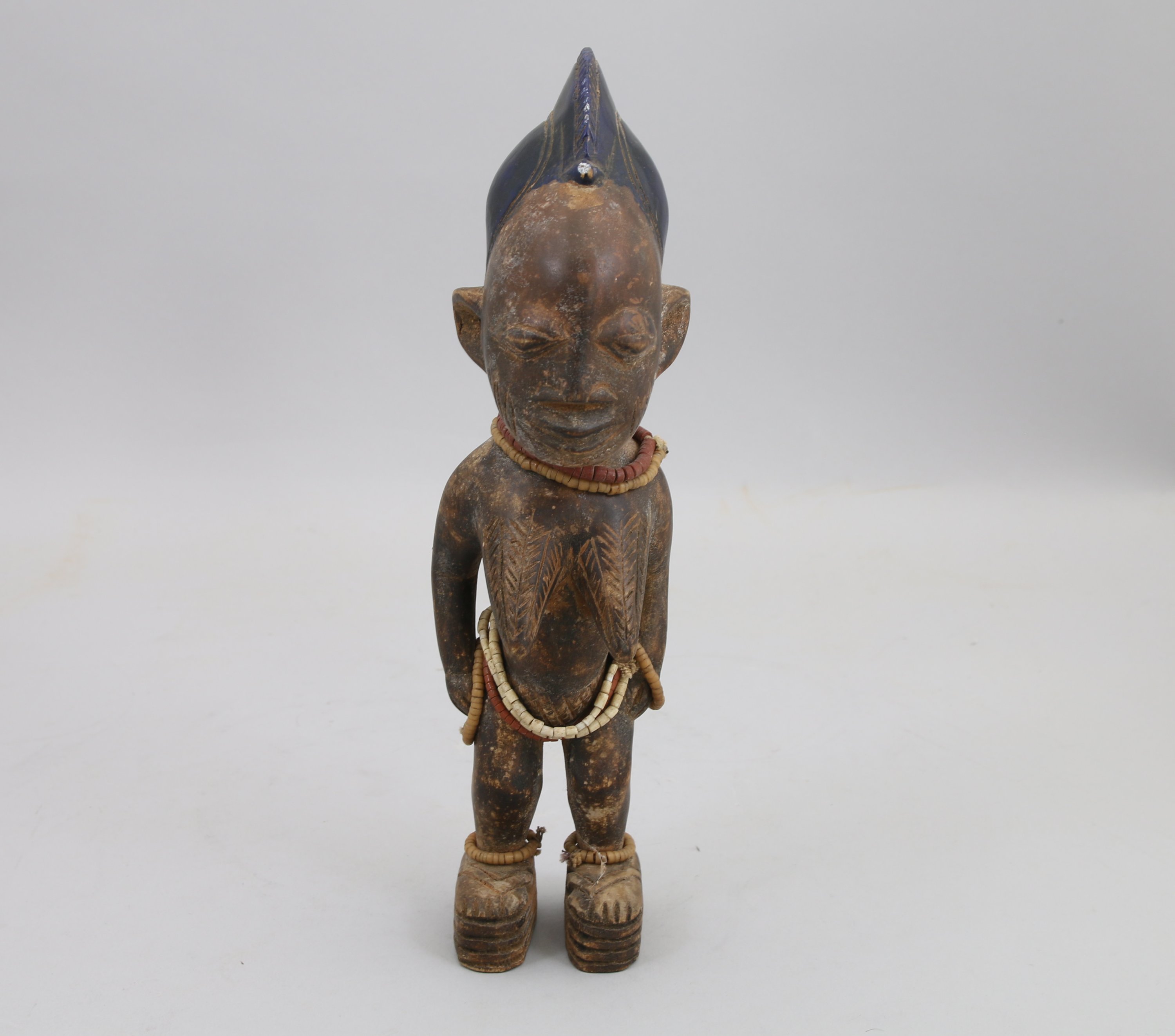IBEJI en bois sculpté et incisé, la coiffe peinte en bleue, collier de perles.