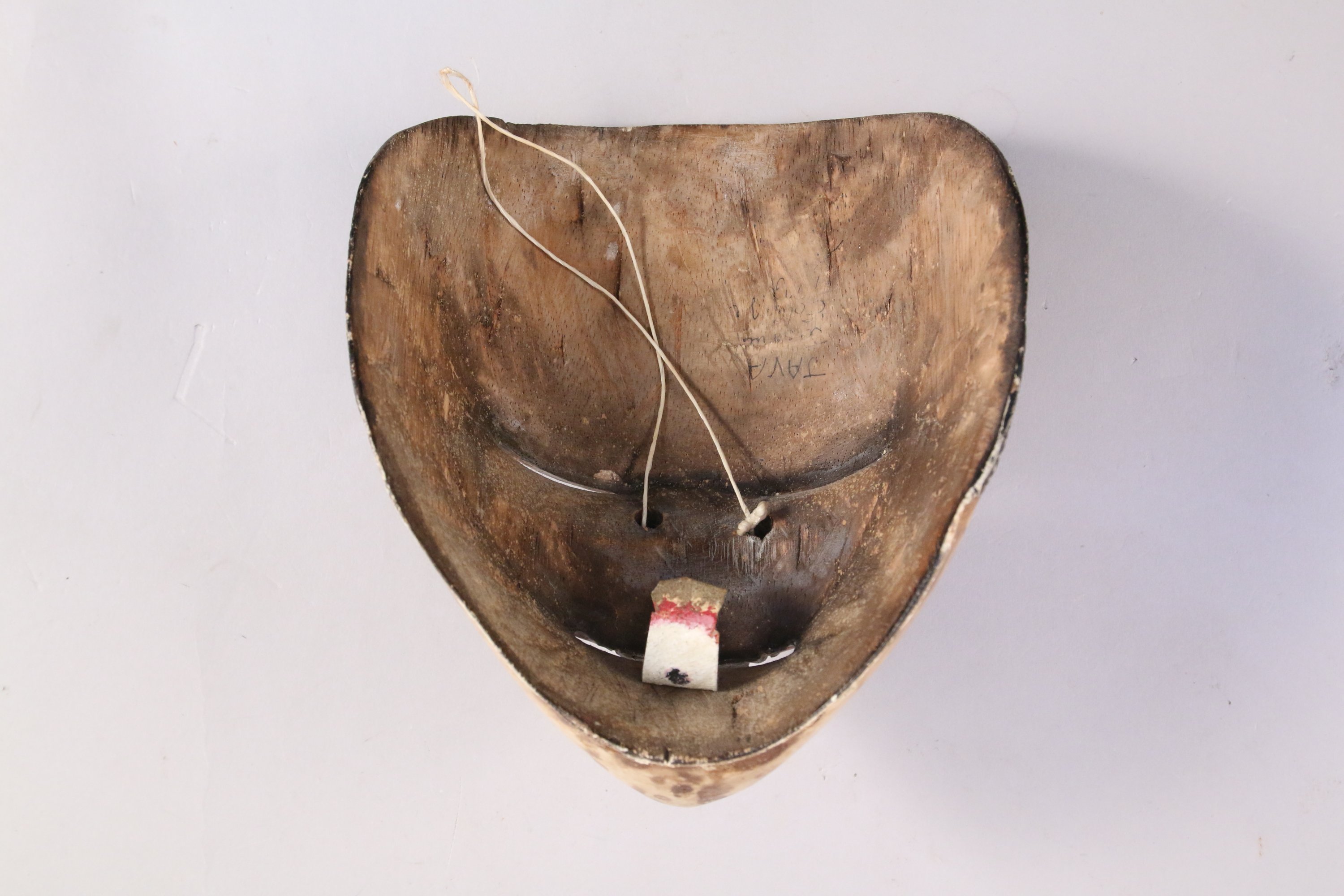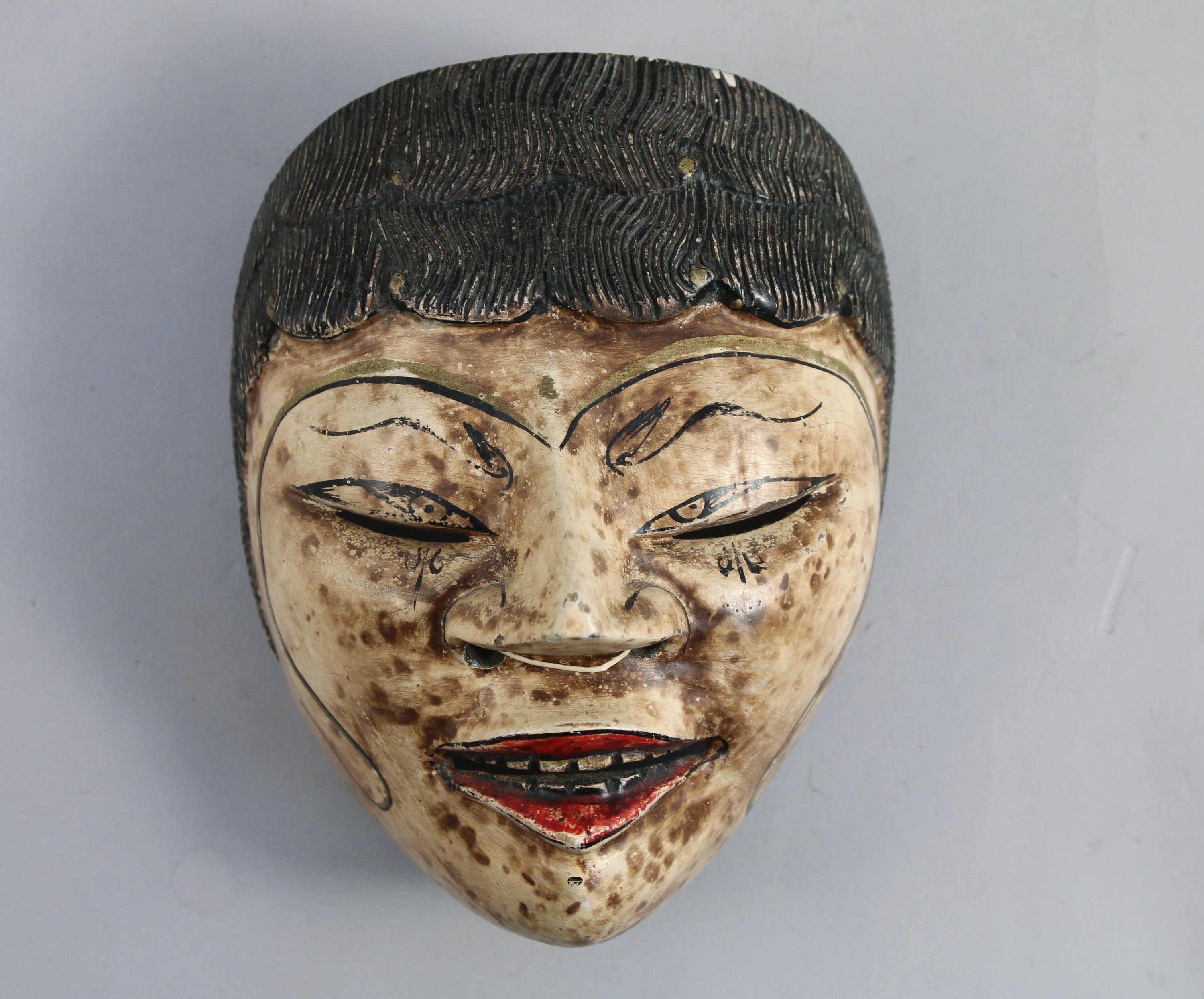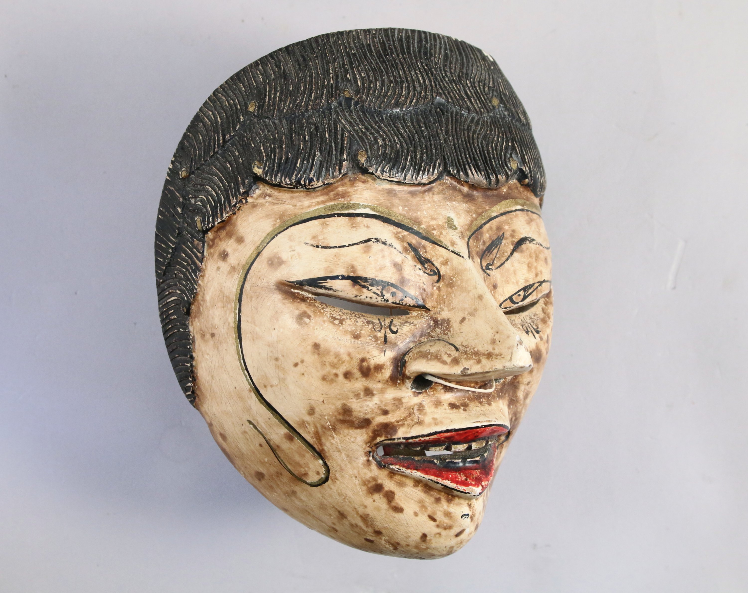 En bois polychrome. Figurant probablement Dewi Siti Sundari (fiancée d'Abhimanyu, fille de Batara Kresna dans le récit du Mahâbhârata). Le visage blanc, les lèvres rehaussées de rouge, les sourcils peints en noir et en doré. La coiffure finement sculptée. Une languette interne en cuir sur le verso du masque semble indiquer que le masque a été dansé.