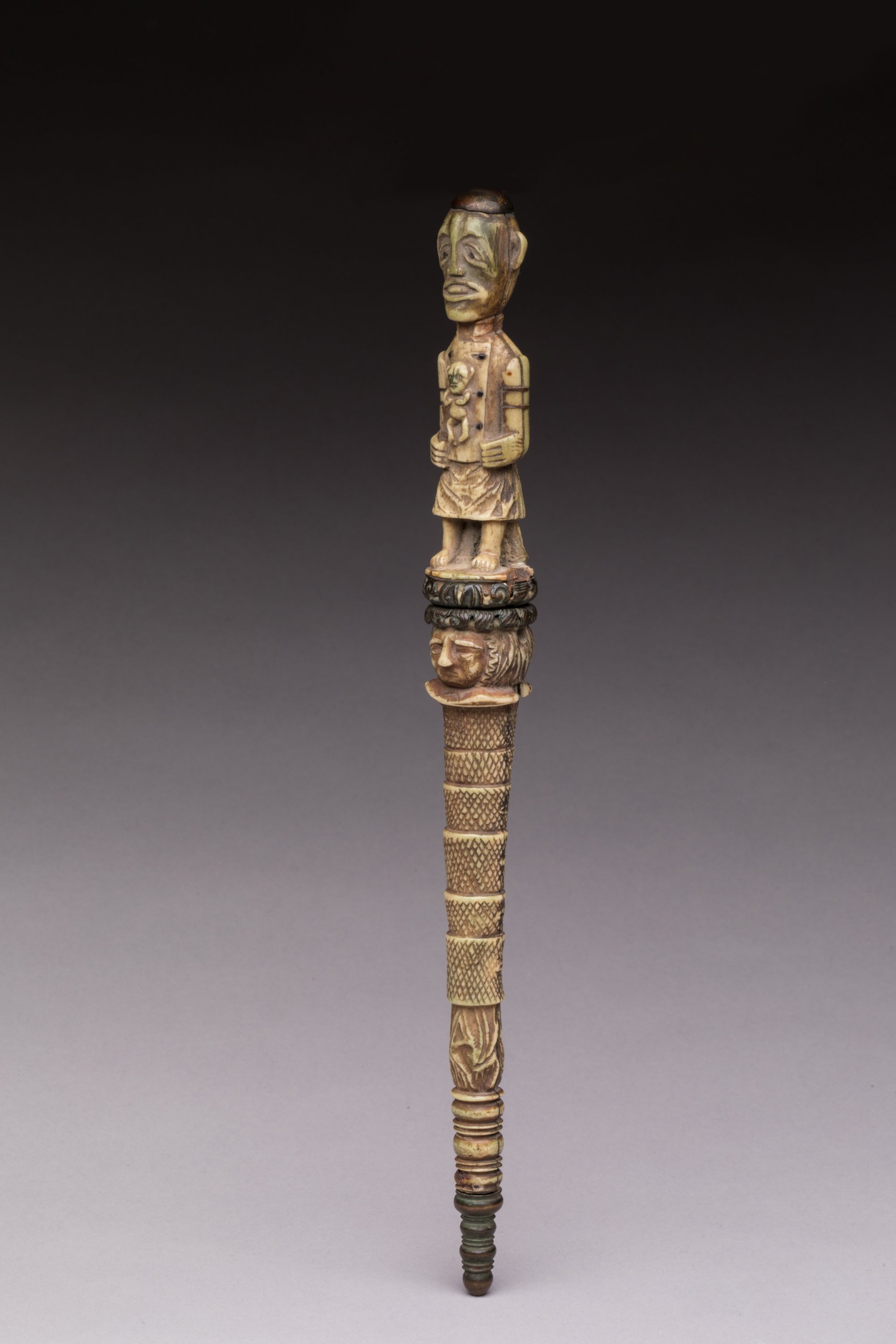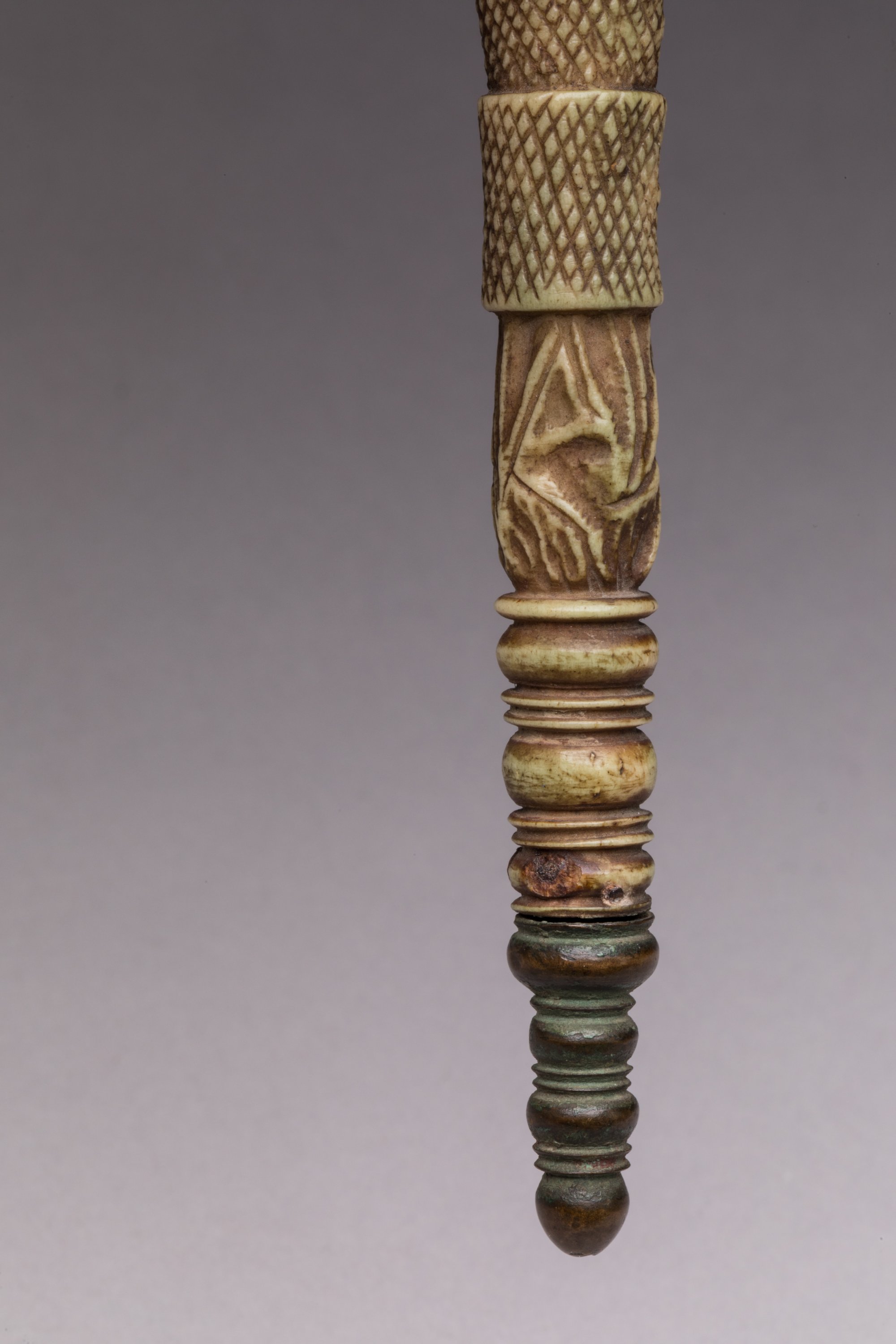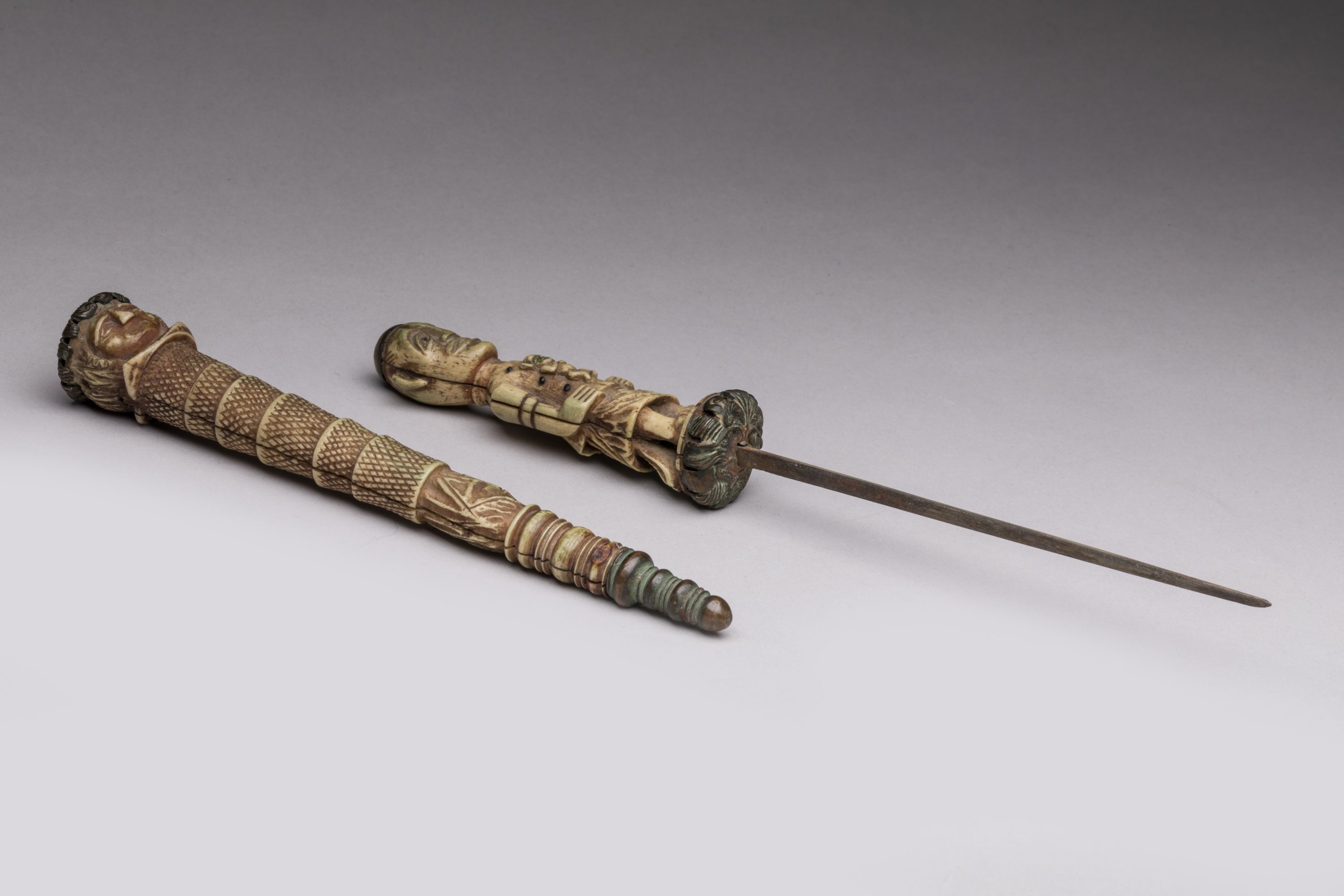 Stylet à fine lame effilée en acier, manche et fourreau en os à décor de personnages, dont