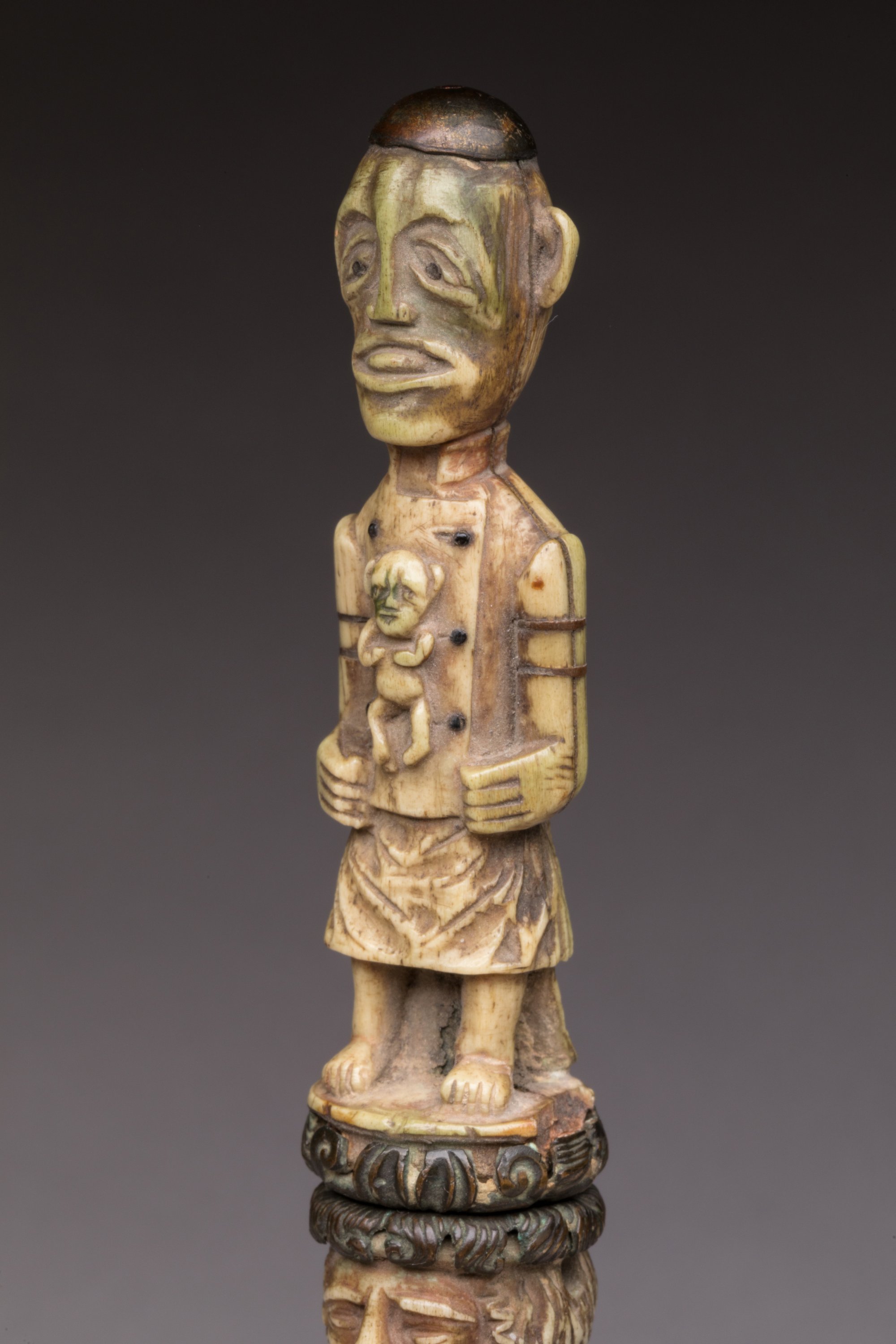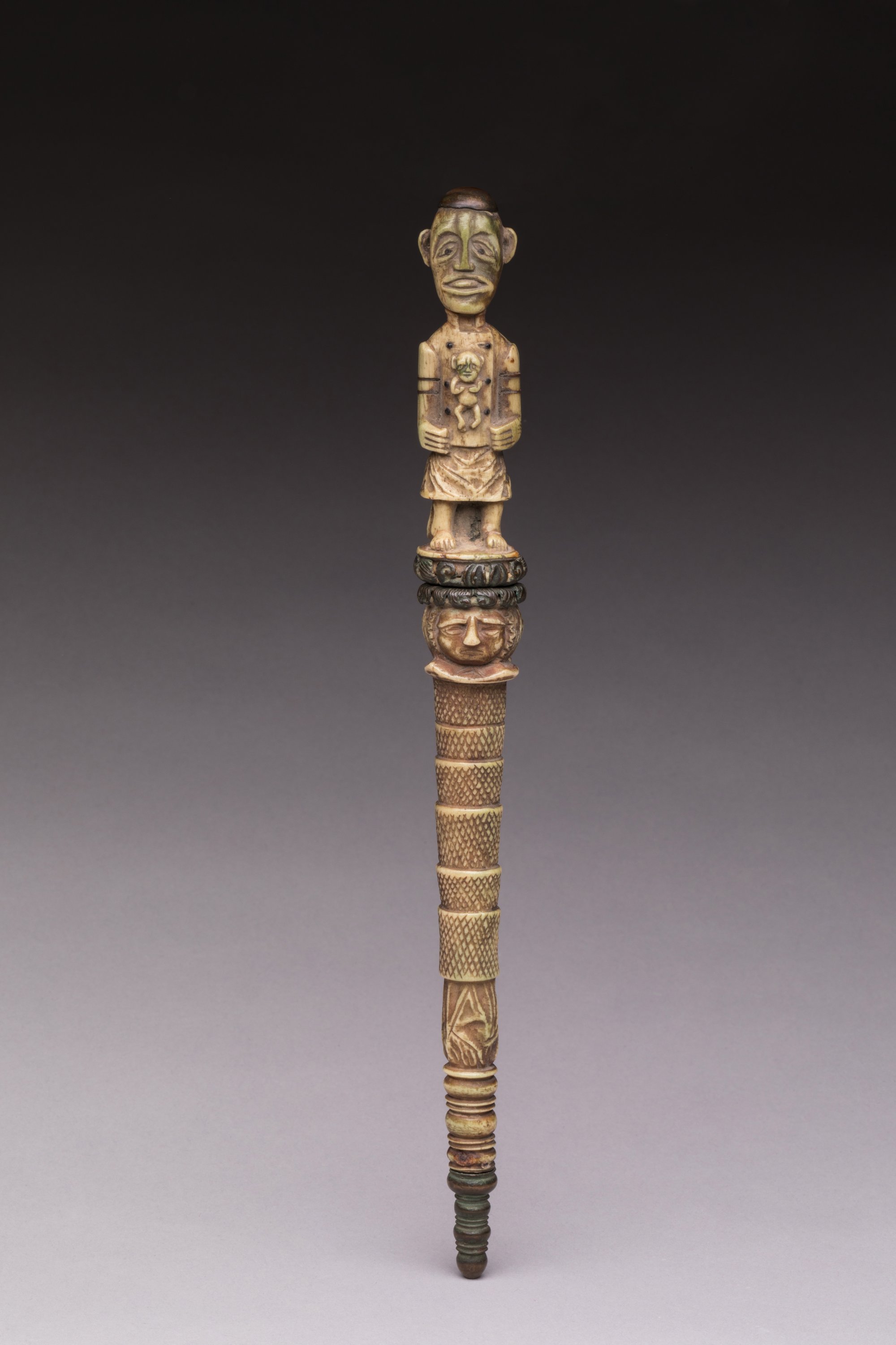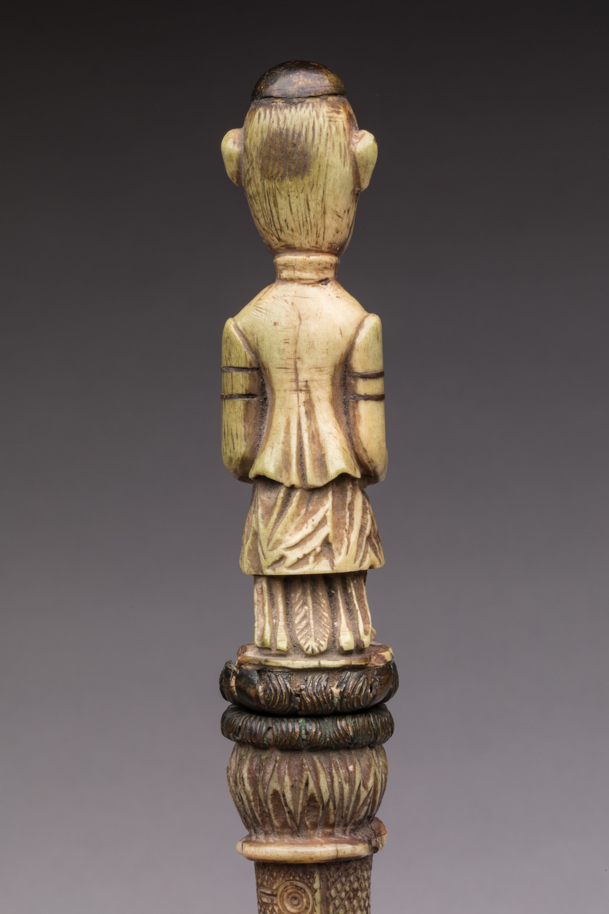 Stylet à fine lame effilée en acier, manche et fourreau en os à décor de personnages, dont