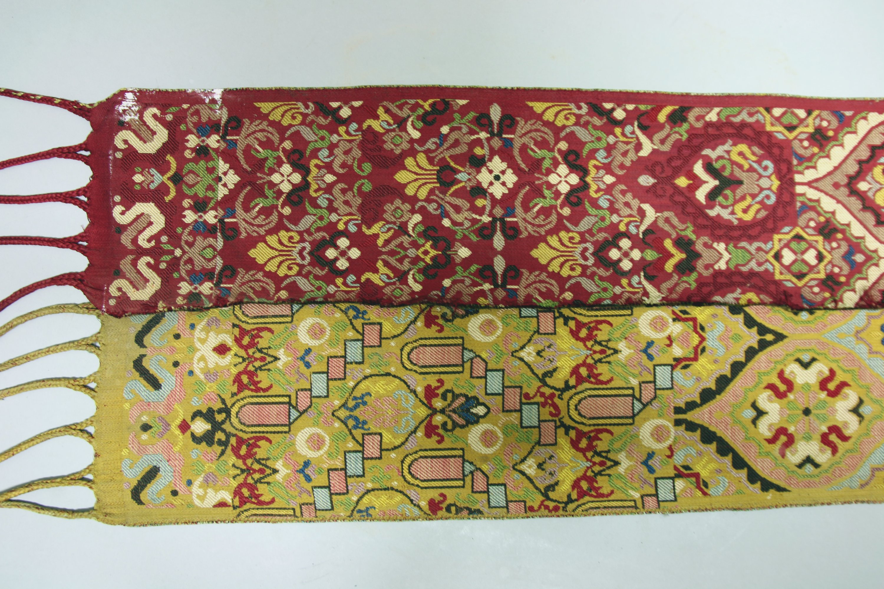 Demi ceinture de Fès, Maroc, brocatelle, fond alternativement rouge ou jaune, décor de mandorle, motifs géométriques, fleurs (coupée en deux dans la longueur).