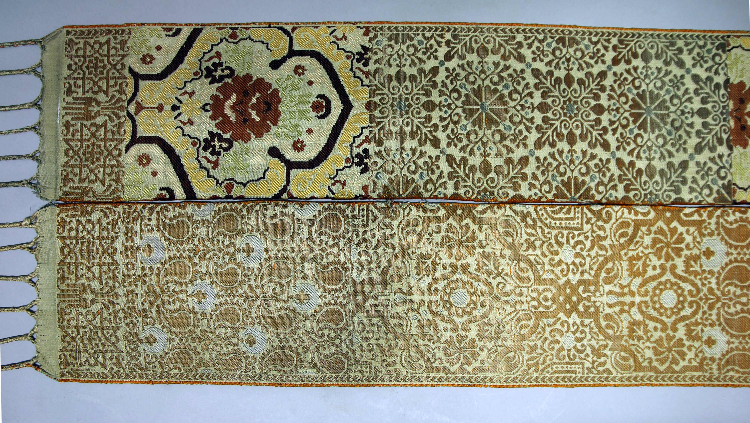 Demi ceinture de Fès, Maroc, brocatelle, fond crème décor cuivre de palmes et rinceaux, fond crème rouge et vert de fleurs dans ds polylobes, extrémités avec main de fatima et croix chérifiennes.