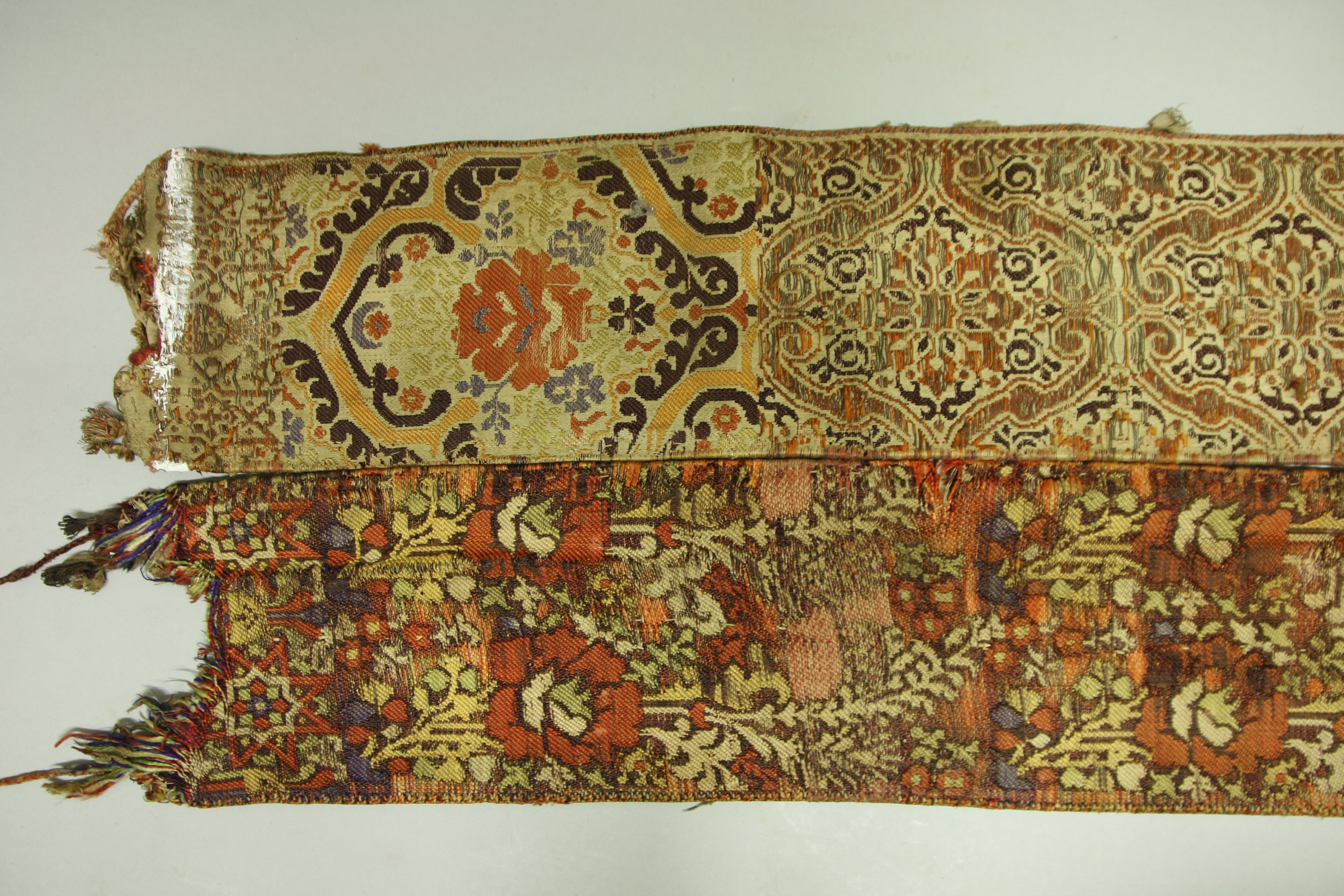 Demi ceinture de Fès, Maroc, brocatelle, fond crème décor de fleurs dans des polylobes, fond noir décor polychrome de fleurs et graminées, fond crème décor cuivre de fleurs dans des polylobes, usures et manques aux extrémités.