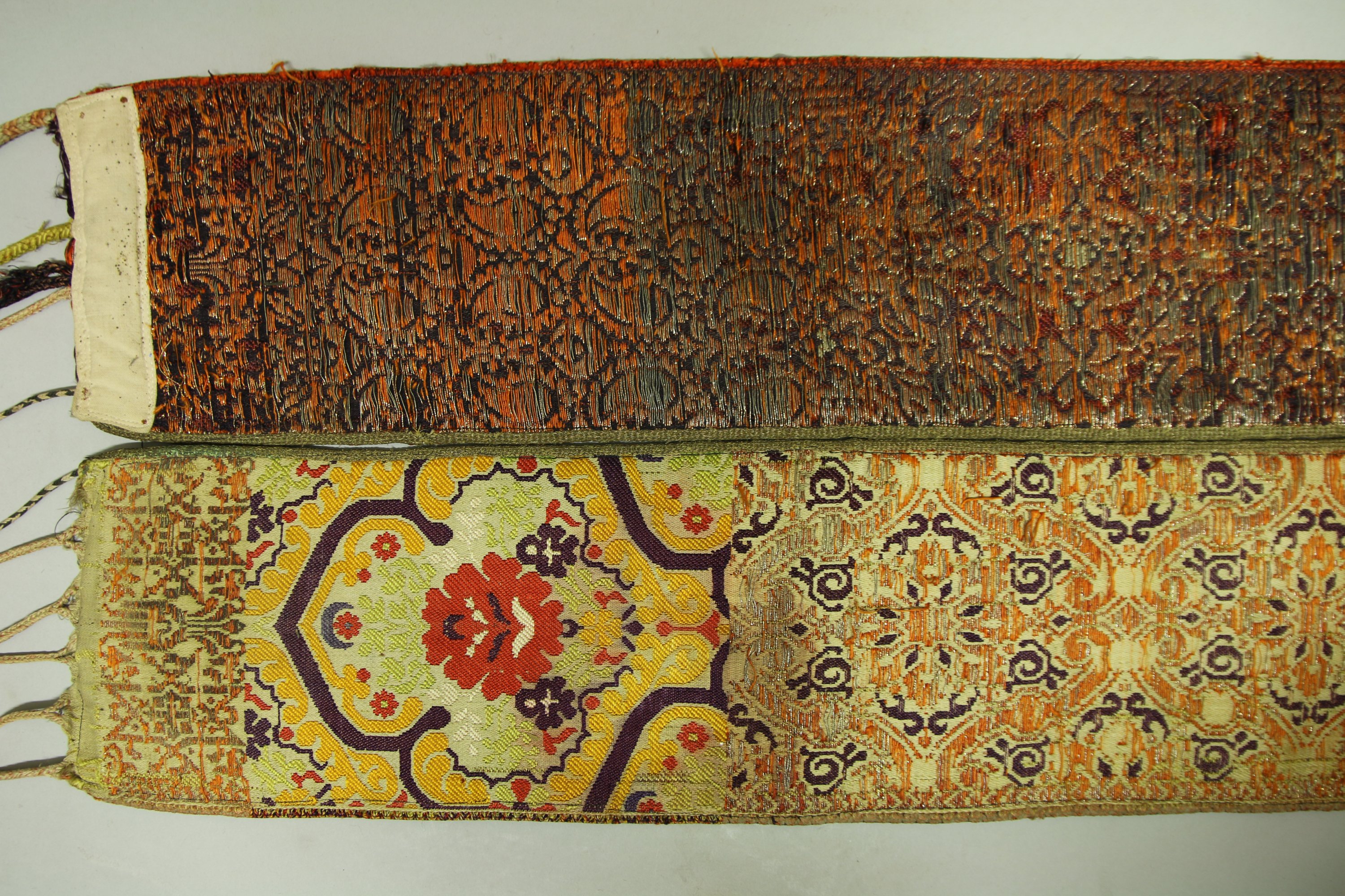 Deux demi ceintures de Fès, Maroc, brocatelle crème, décor polychrome de fleurs dans un polylobe, tramé cuivre de fleurs ou de palmes.