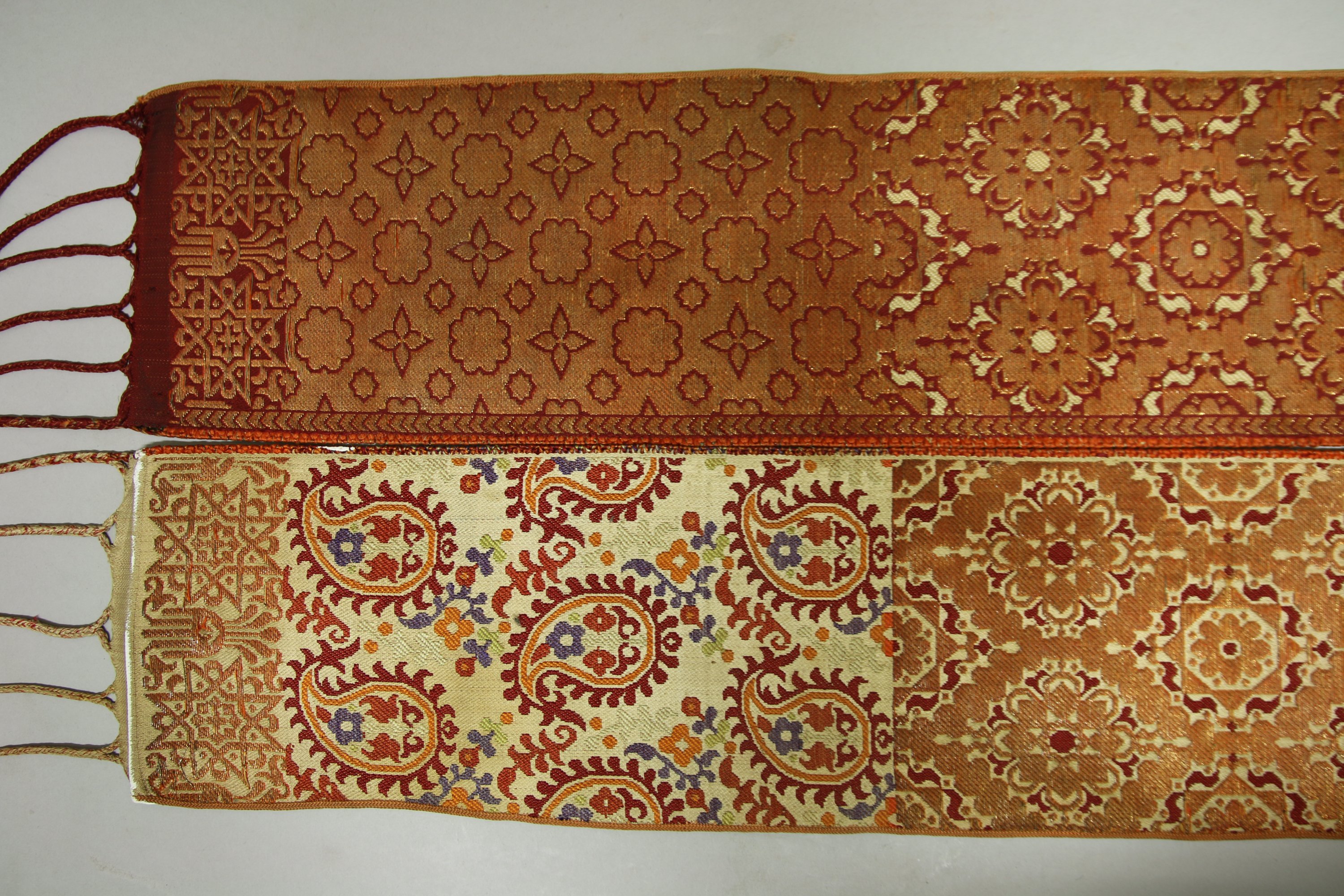 Demi ceinture de Fès, Maroc, brocatelle, fond crème décor de palmes mille fleurs et tramé cuivre de fleurs et étoiles, extrémités avec croix chérifiennes et mains de fatima.