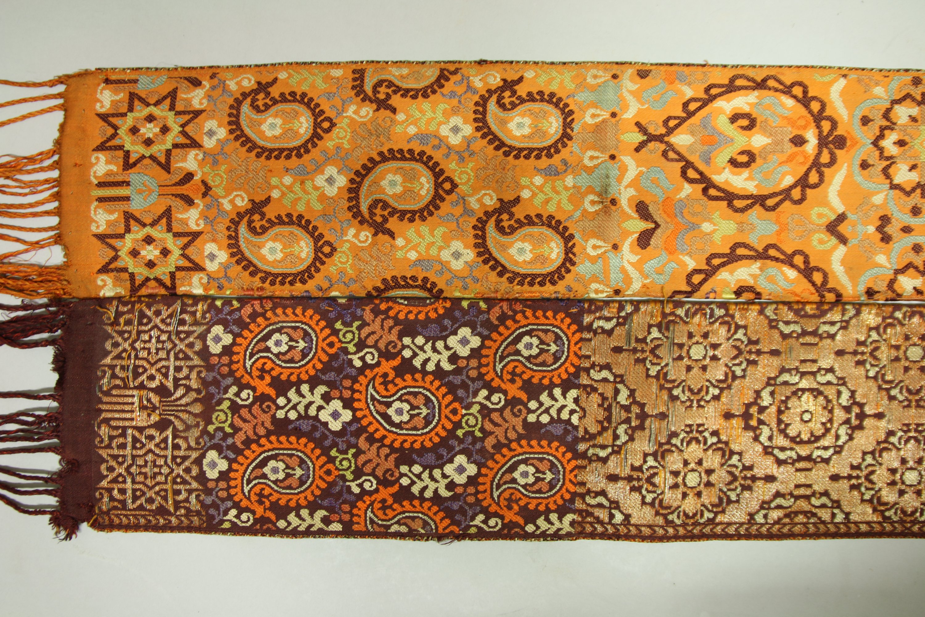 Demi ceinture de Fès, Maroc, brocatelle, fond orange ou violet décor de palmes mille fleurs, tramé cuivre de fleurs, extrémité avec croix chérifienne et mains de fatima.
