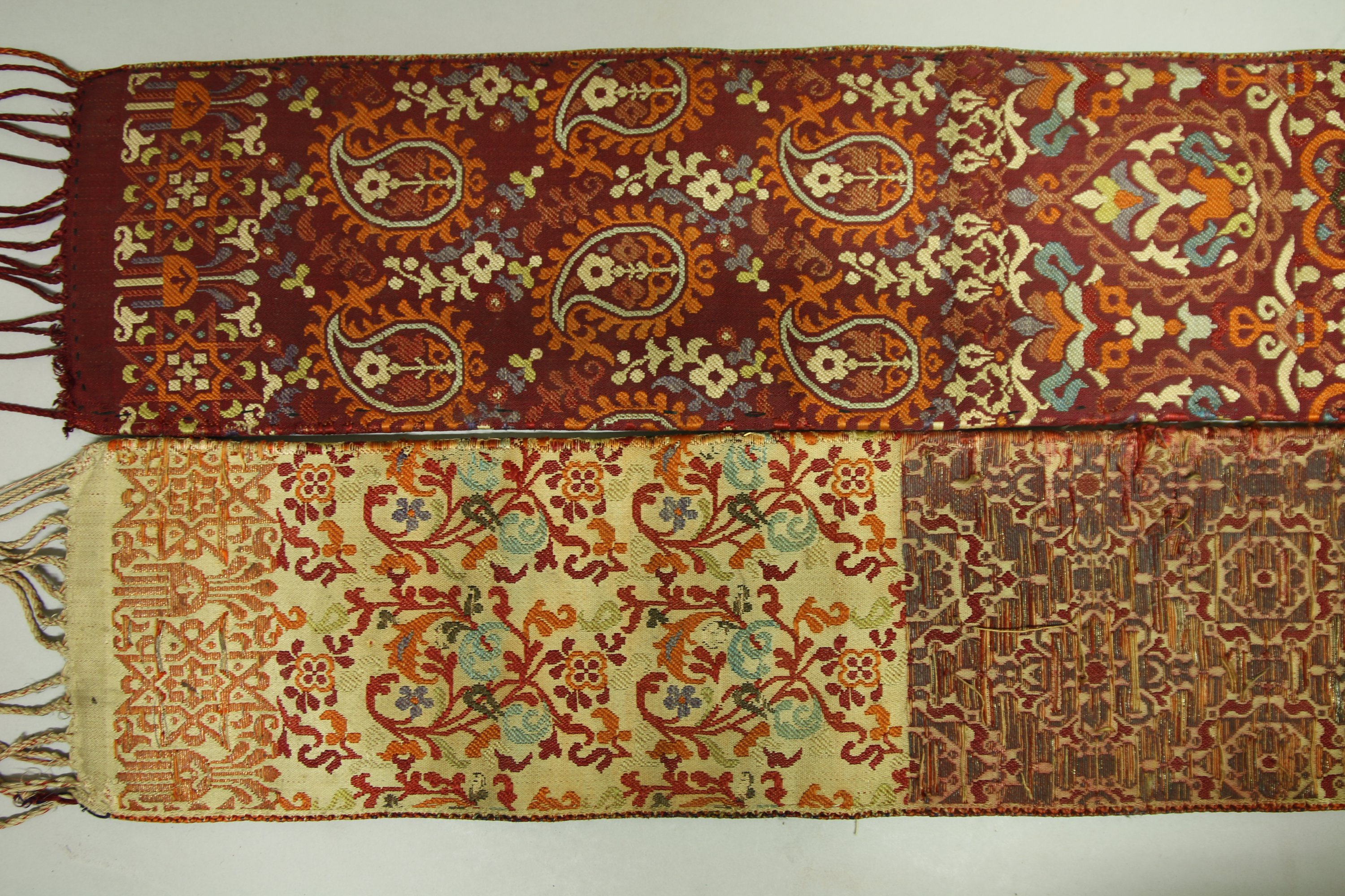 Demi ceinture de Fès, Maroc, brocatelle, fond crème décor de rinceaux fleuris à dominante rouge, tramé cuivre de fleurs stylisées, et fond violet décor de palmes mille fleurs, croix chérifiennes et main de fatima aux extrémités.