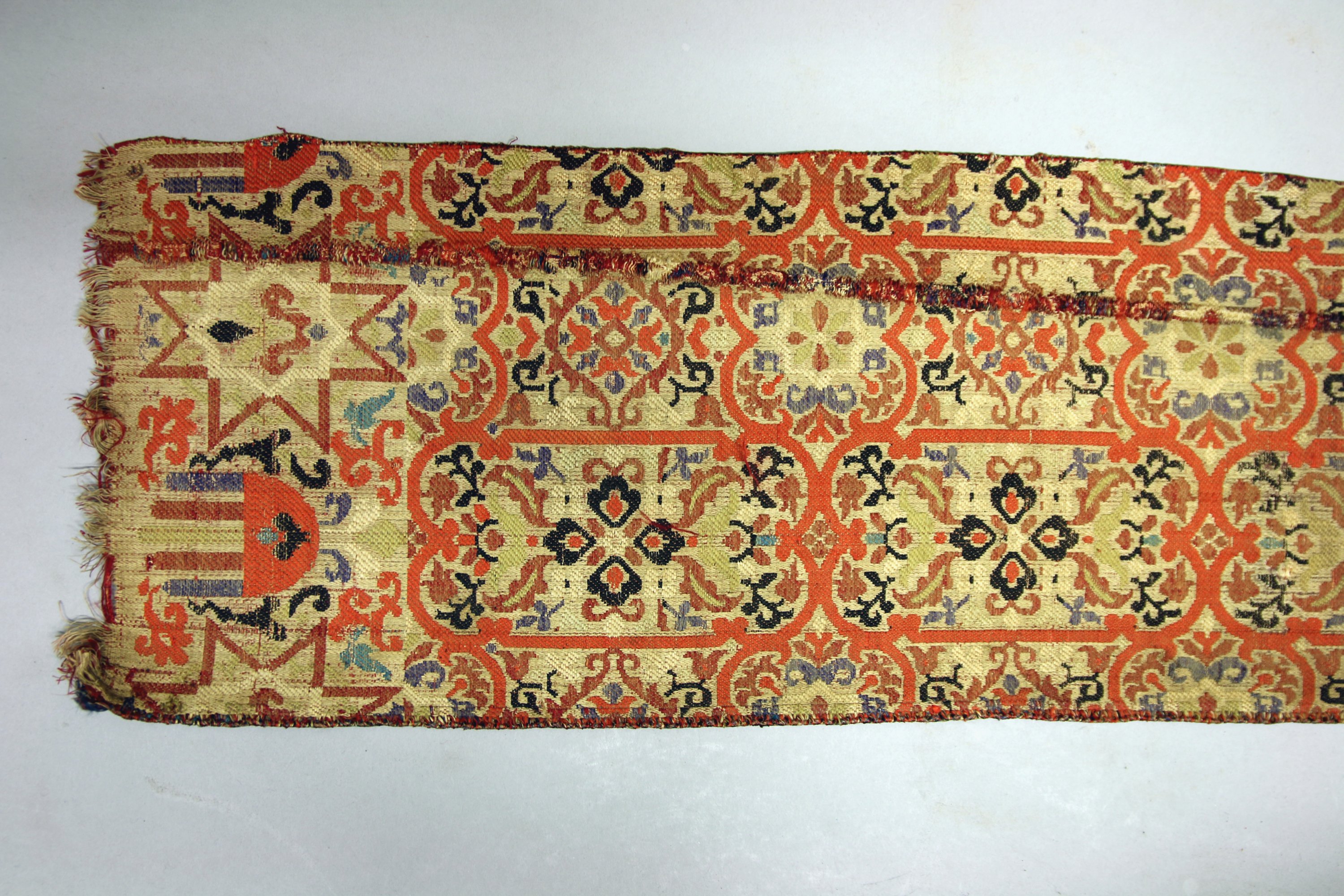 Fragment de demi ceinture de Fès, Maroc, brocatelle, fond crème décor de fleurs dans des rubans oranges (usures).