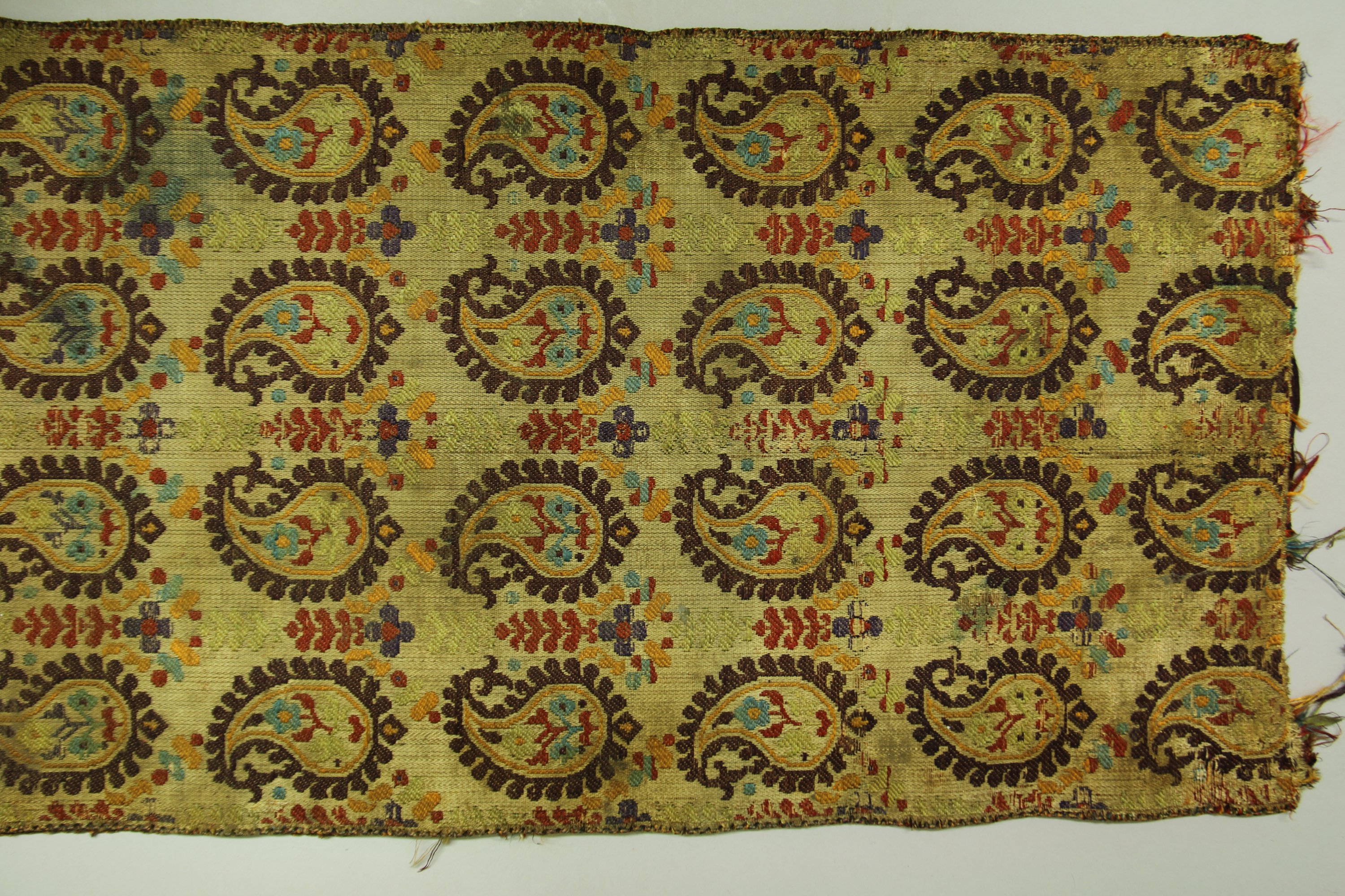 Fragment de ceinture de Fès, Maroc, brocatelle, fond crème décor de palmes mille fleurs et fond tabac décor de fleurs dans des polylobes bleus (usures).