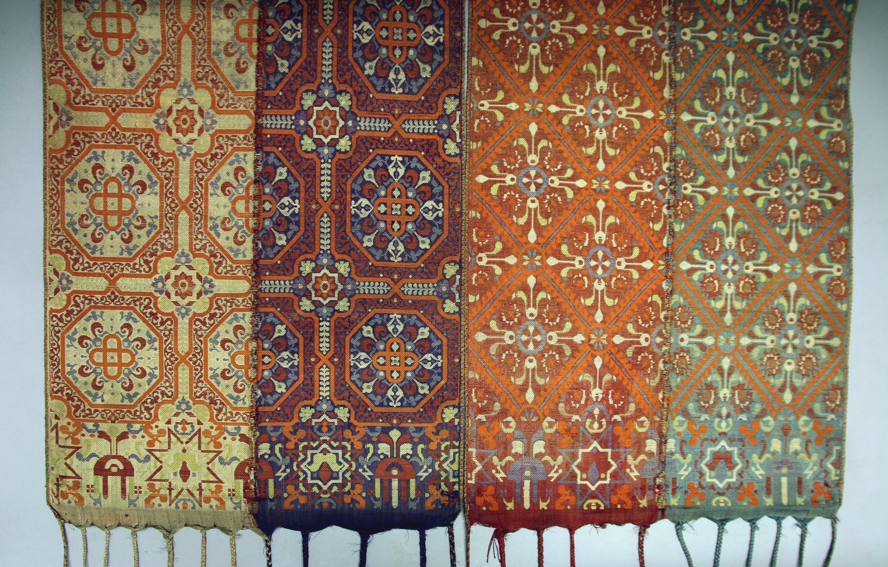Demi ceinture de Fès, Maroc, brocatelle, fond alternaticement gris ou rouge, décor de médaillons floraux dans un réseau de palmes et de rubans, mains de fatima et croix chérifiennes aux extrémités (trace de pliure au milieu).