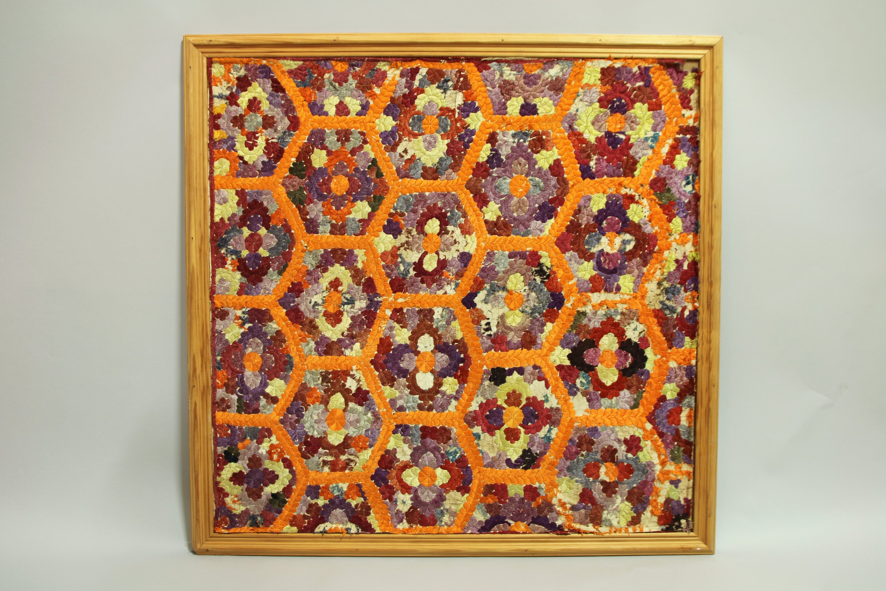 Carré, Rabat, Maroc, coton brodé en soie floche polychrome de fleurs stylisées dans un réseau losangé orange, monté dans un cadre (usures).