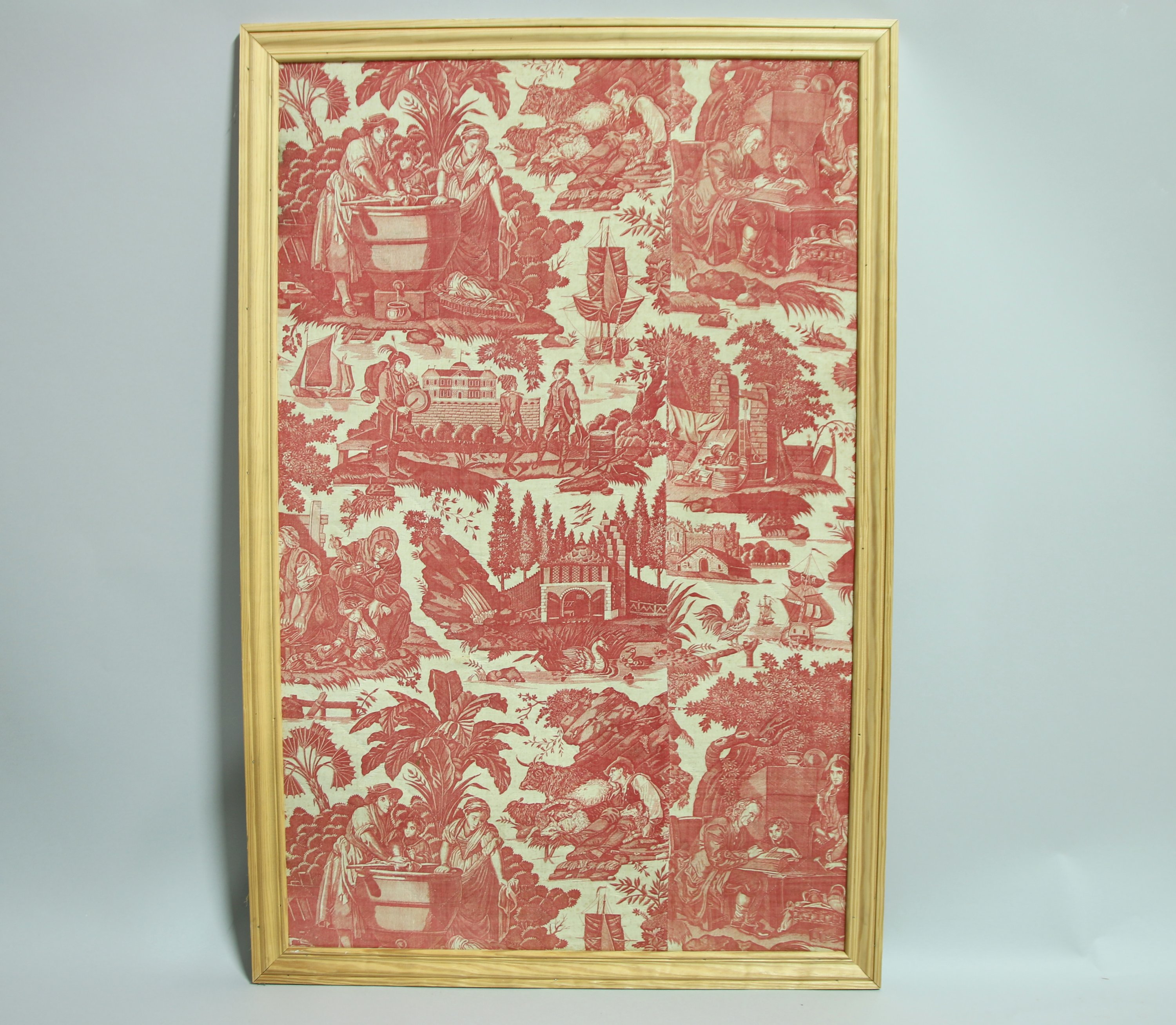 Coton imprimé en rouge à la planche « La Danse Savoyarde », Manufacture de Leclerc père et fils à Pont-de-La-Maye, vers 1790. Petits savoyards dansant, lavandière sous un palmier, vieillard faisant la lecture de la bible à un petit enfant daprès Greuze. (trous).