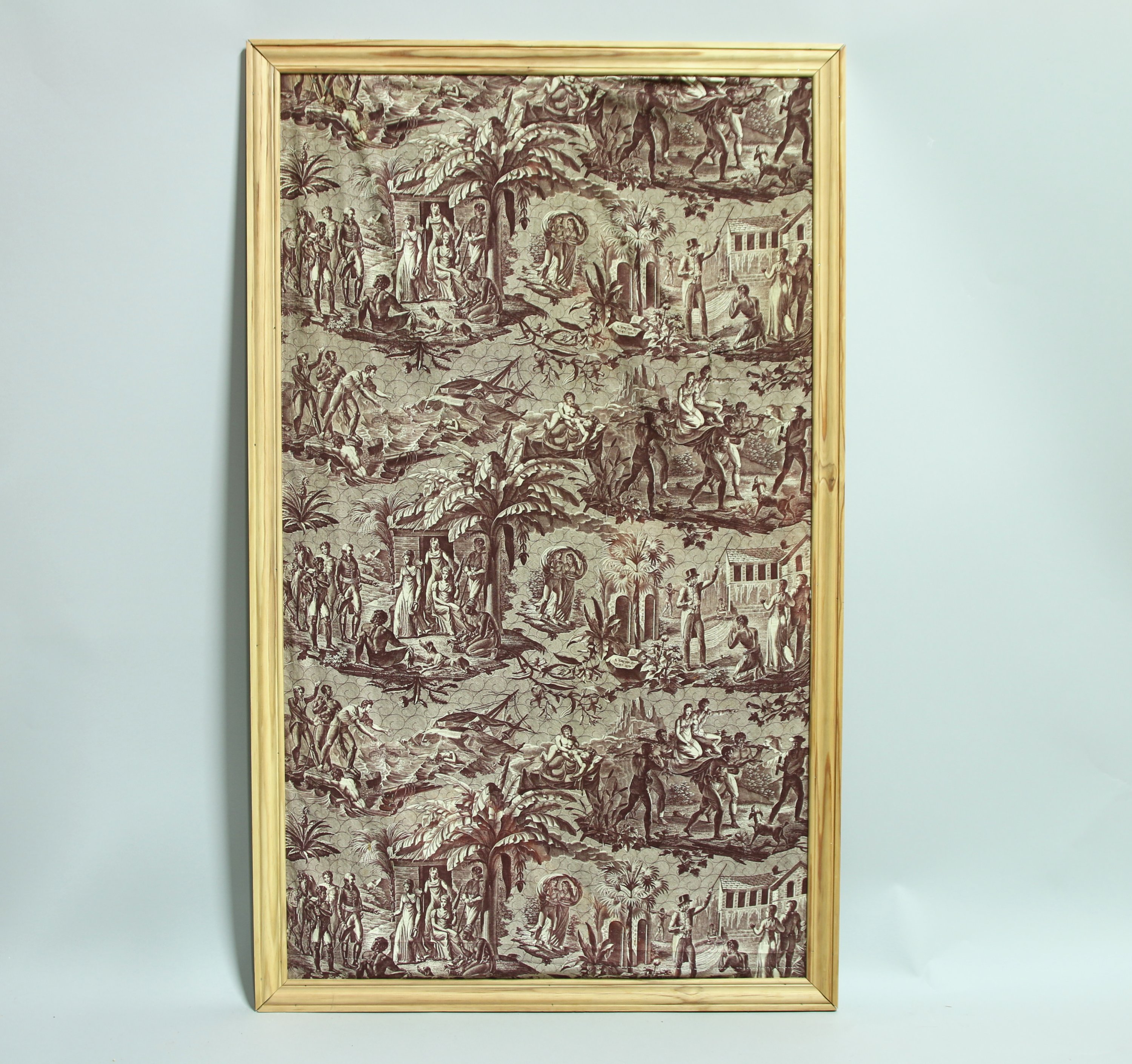 Coton imprimé en grisaille sépia, Manufacture Goutan à Lyons-la-Forêt, gravé par Jean-Louis Toussaint Caron (1790-1832), début XIXème siècle, « Paul et Virginie », naufrage, une jeune couple recueilli par des indigènes, gouverneur visitant la plantation.