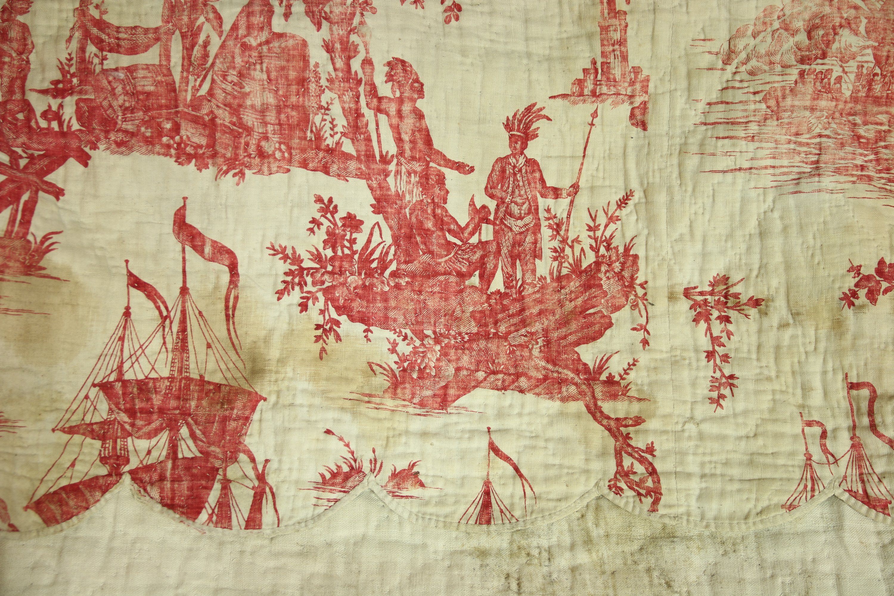 Coton imprimé « Le Combat de Trinquemale entre « Le Héros » et « Le Superbe » imprimé à la planche de bois en rouge sur coton, manufacture Favre Petit pierre, à Nantes, vers 1802, évoque le combat naval de lamiral de Suffren au large de Trinquemale du 3 septembre 1782.