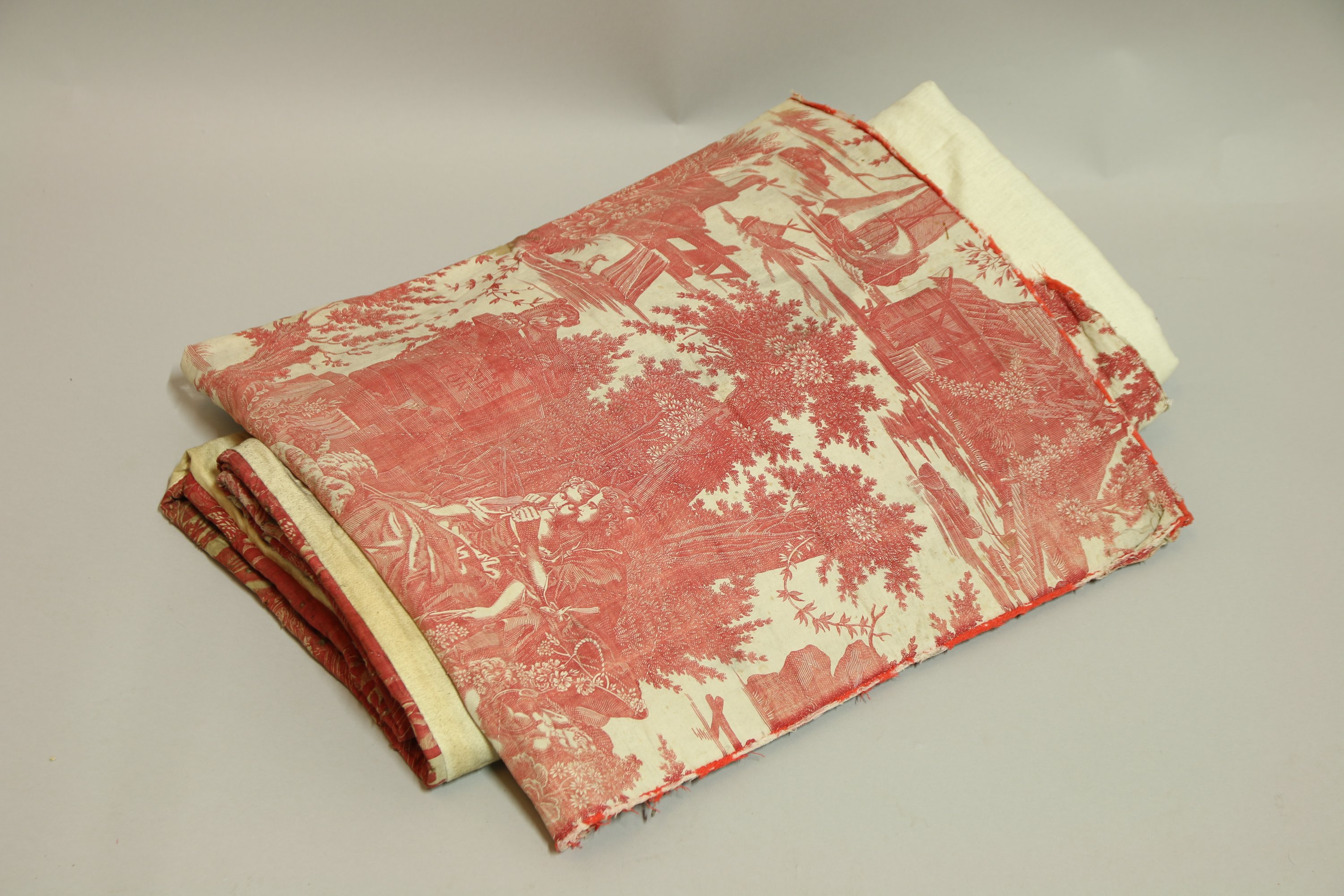 Coton imprimé « LArt dAimer ou lAgréable Leçon » imprimé à la planche de cuivre en rouge, Manufacture Favre Petitpierre à Nantes, vers 1785- 1790 et Manufacture J.P. Meillier à Beautiran, vers 1785- 1800.