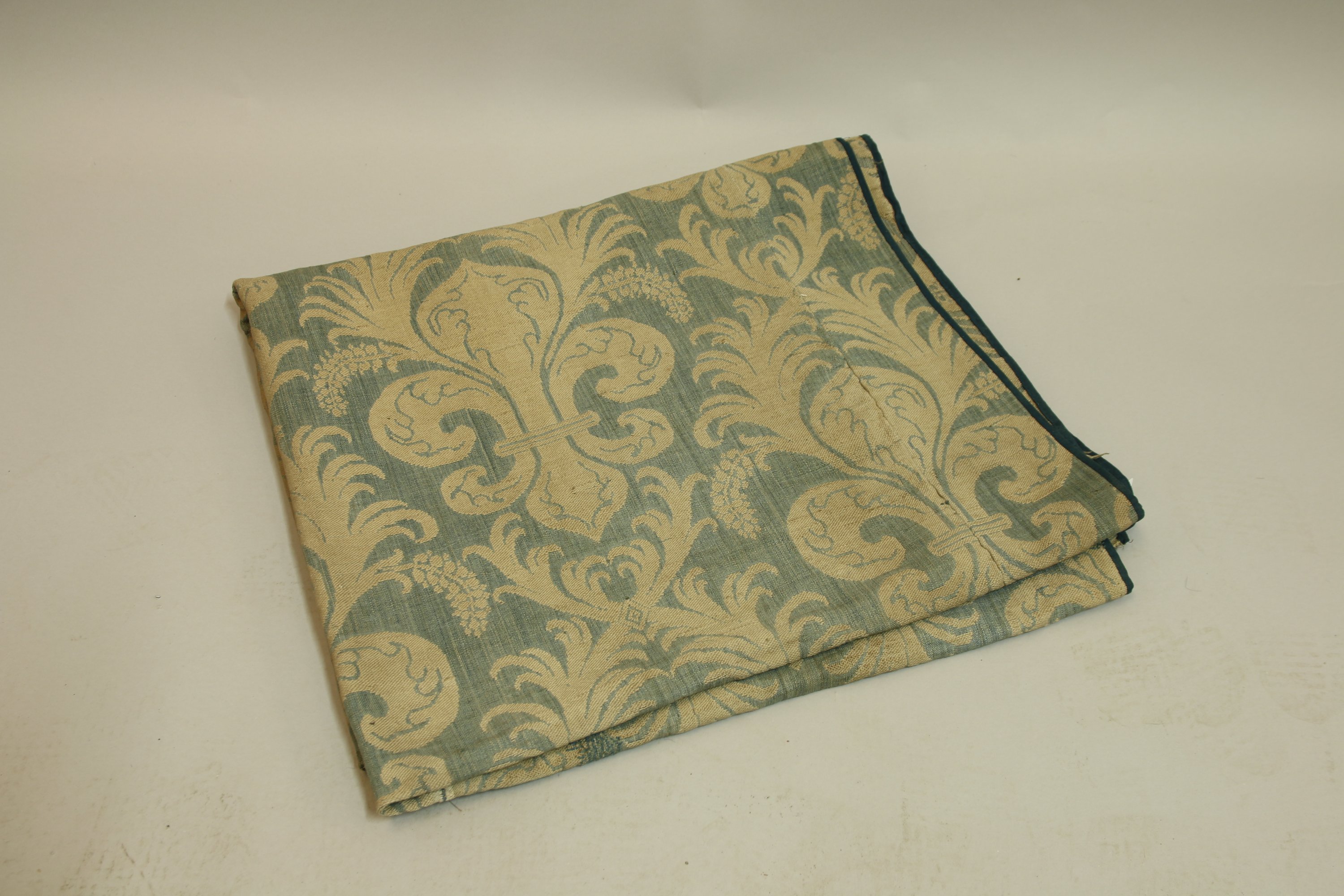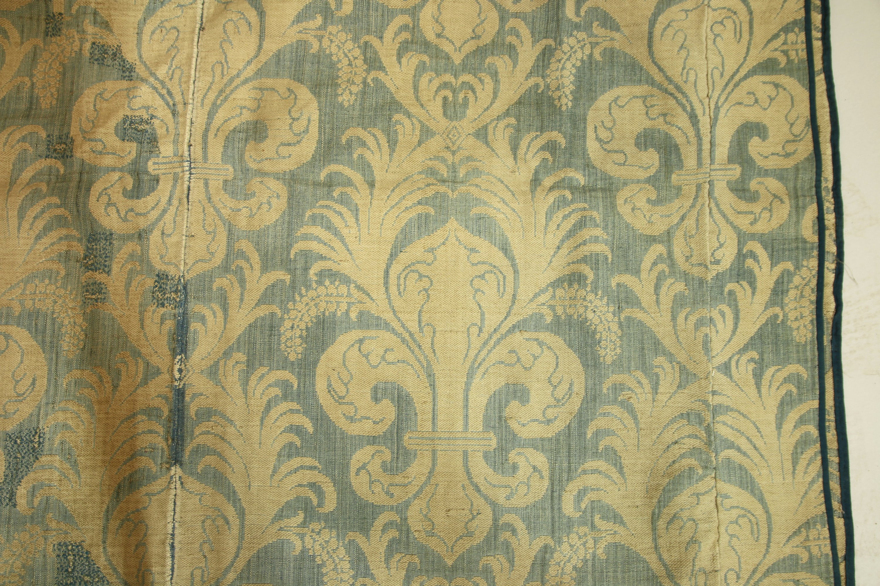 Tenture en toile de Riom, fin XVIIème - début XVIIIème siècle, fond bleu, décor crème de fleurs de lys dans des palmes (usures, reprises).