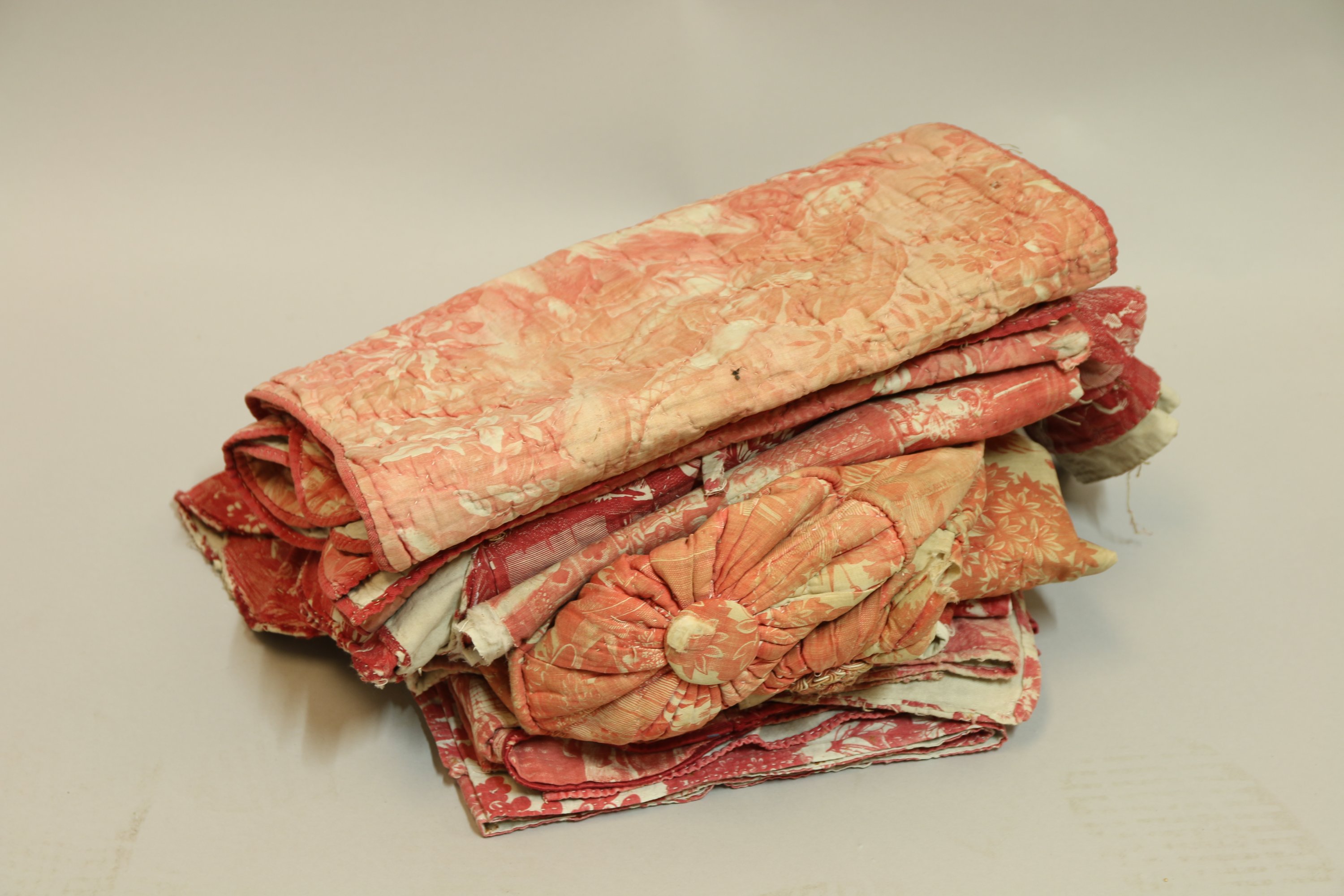 Faille brochée, XVIIIème siècle, fond bleu, décor broché et liseré polychrome et fil cordonnet de rivières de fleurs d’où s’échappent des gerbes de fleurs, habités d’oiseaux (taches).