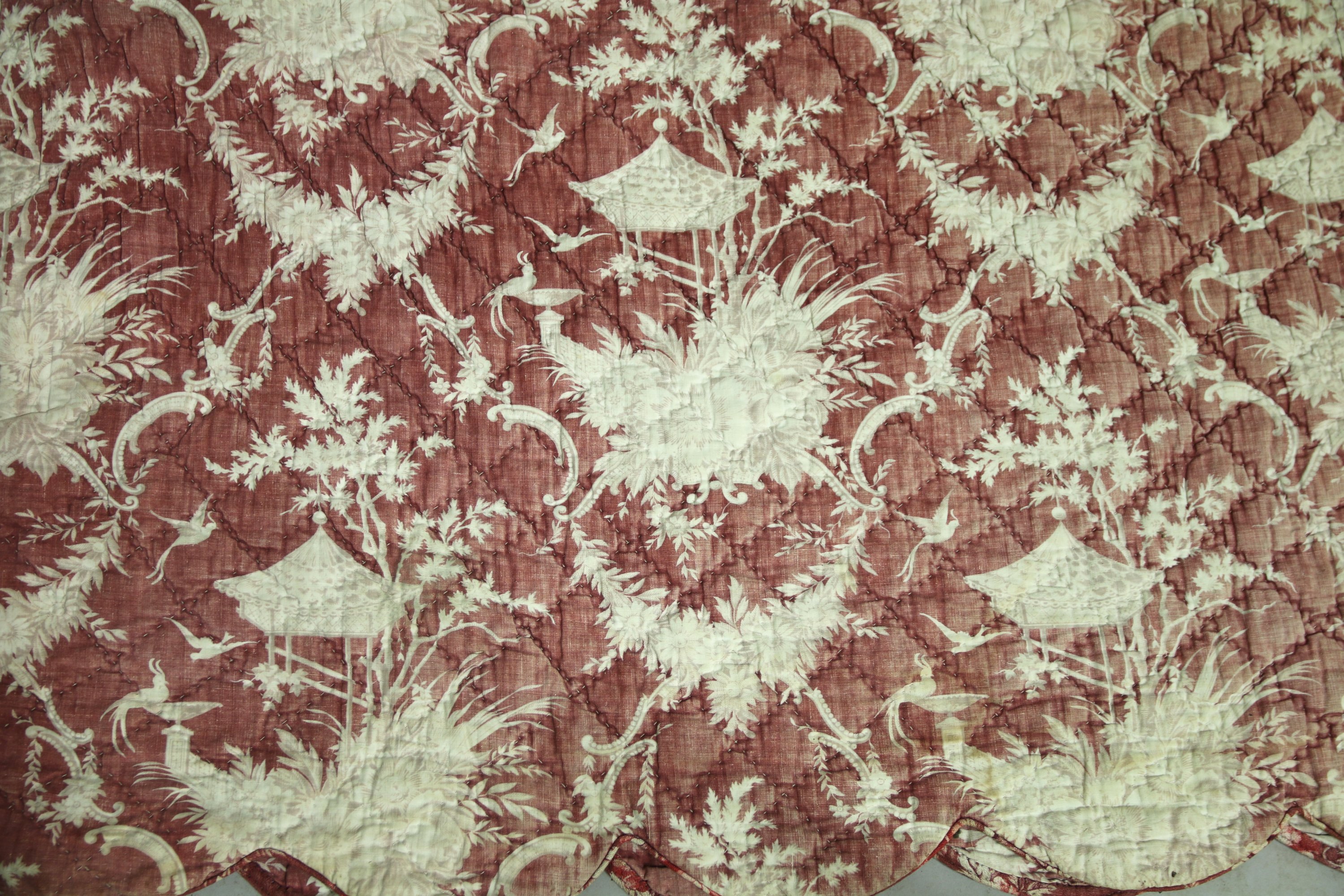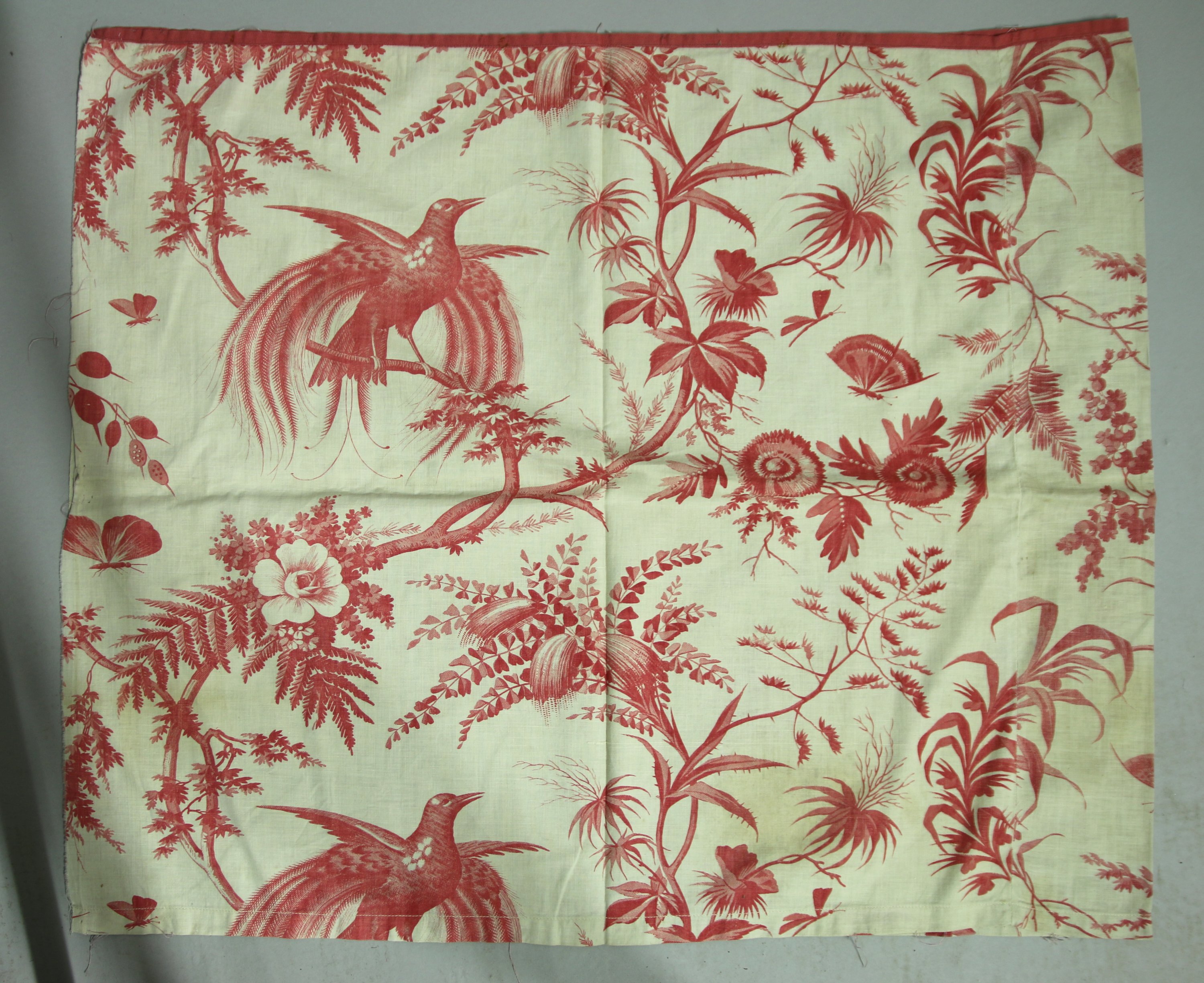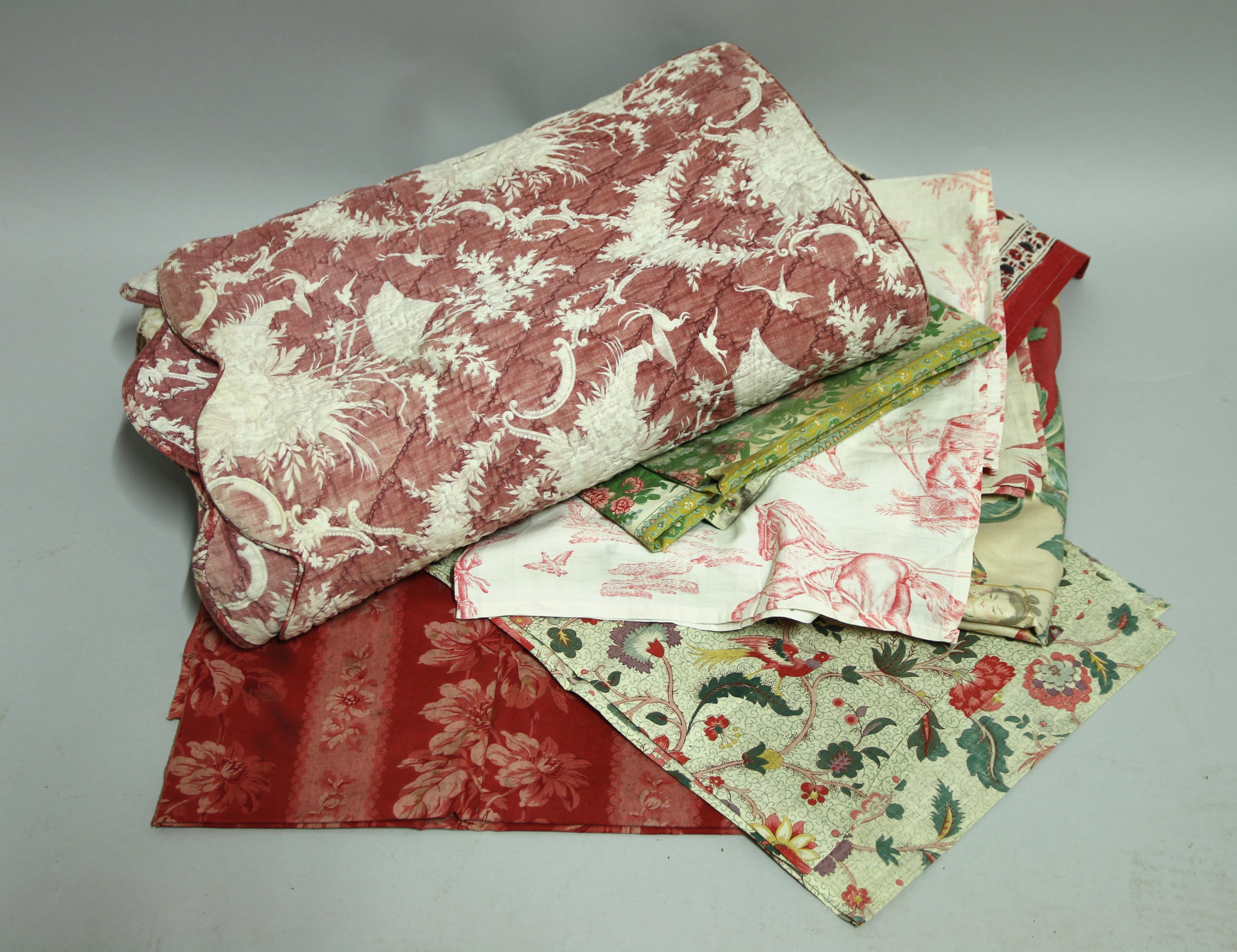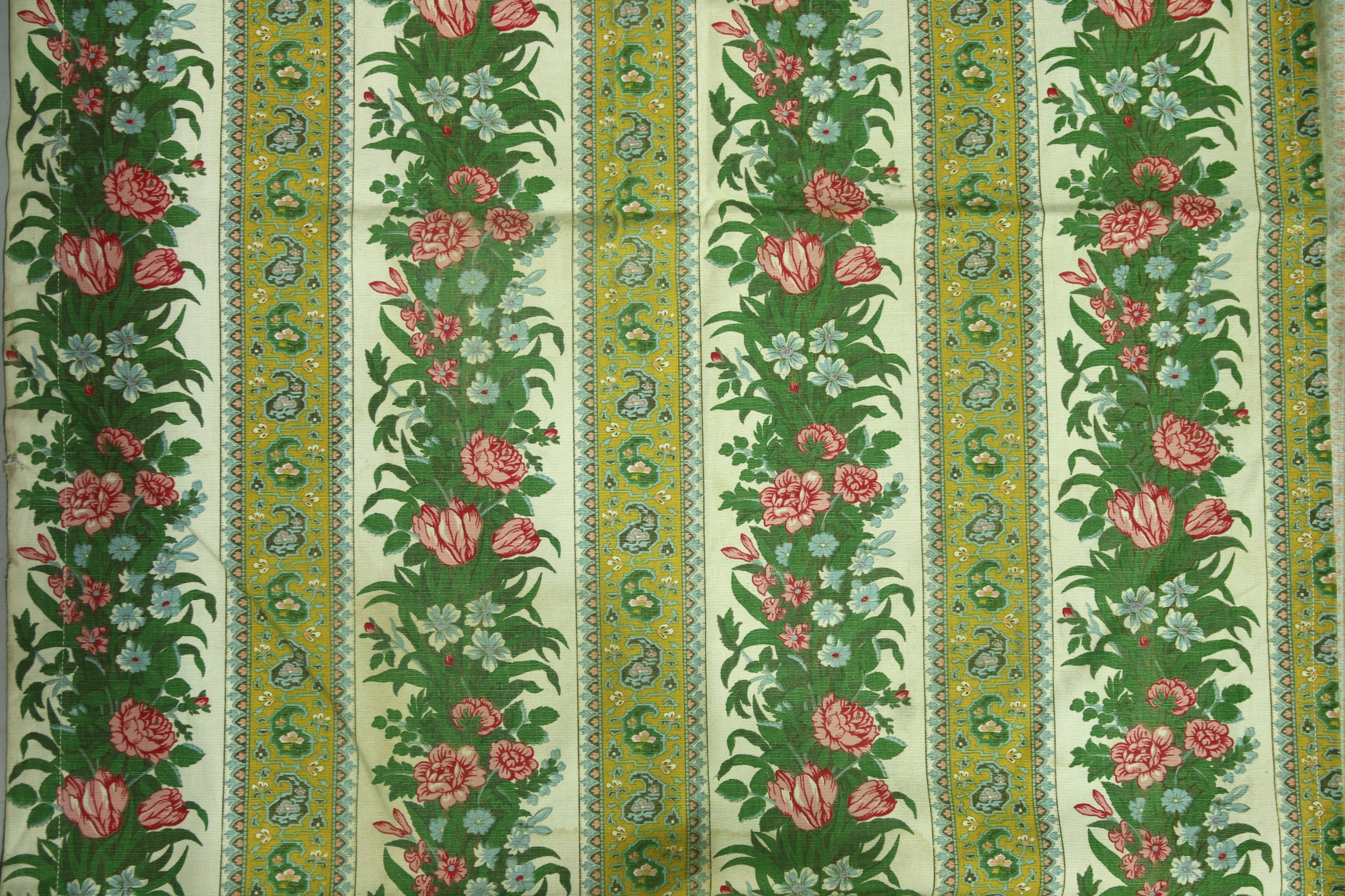 Lambrequin de tour de lit dans une courtepointe de coton imprimé, XIXème siècle, fleurs. On joint une dizaine de coton imprimé, XIX et début XXème siècle, fleurs et chinois.