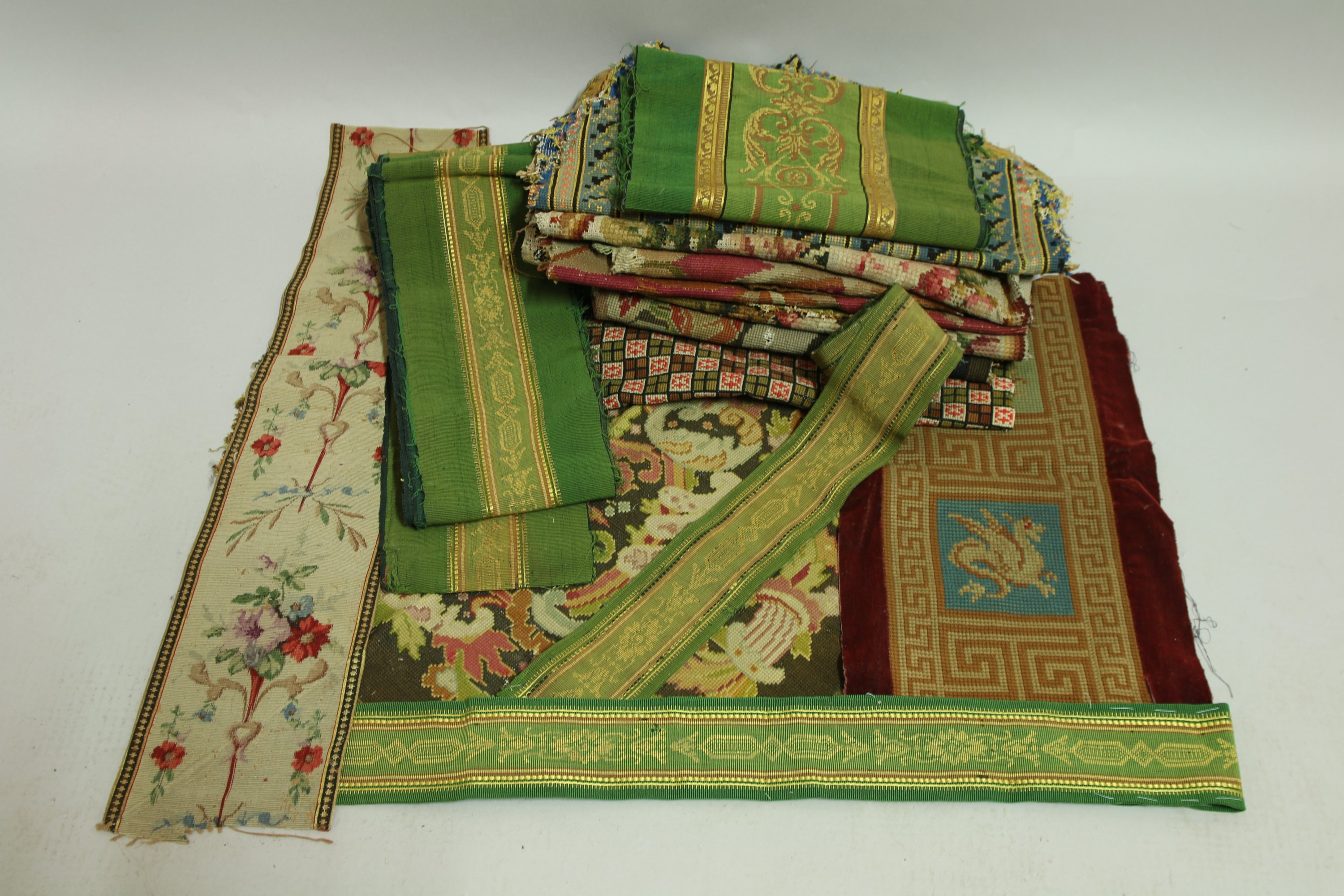 Importante réunion de fragments de tapisseries, tapisseries au point et tapisseries mécaniques, bandeau, bordure, assises et dossiers.