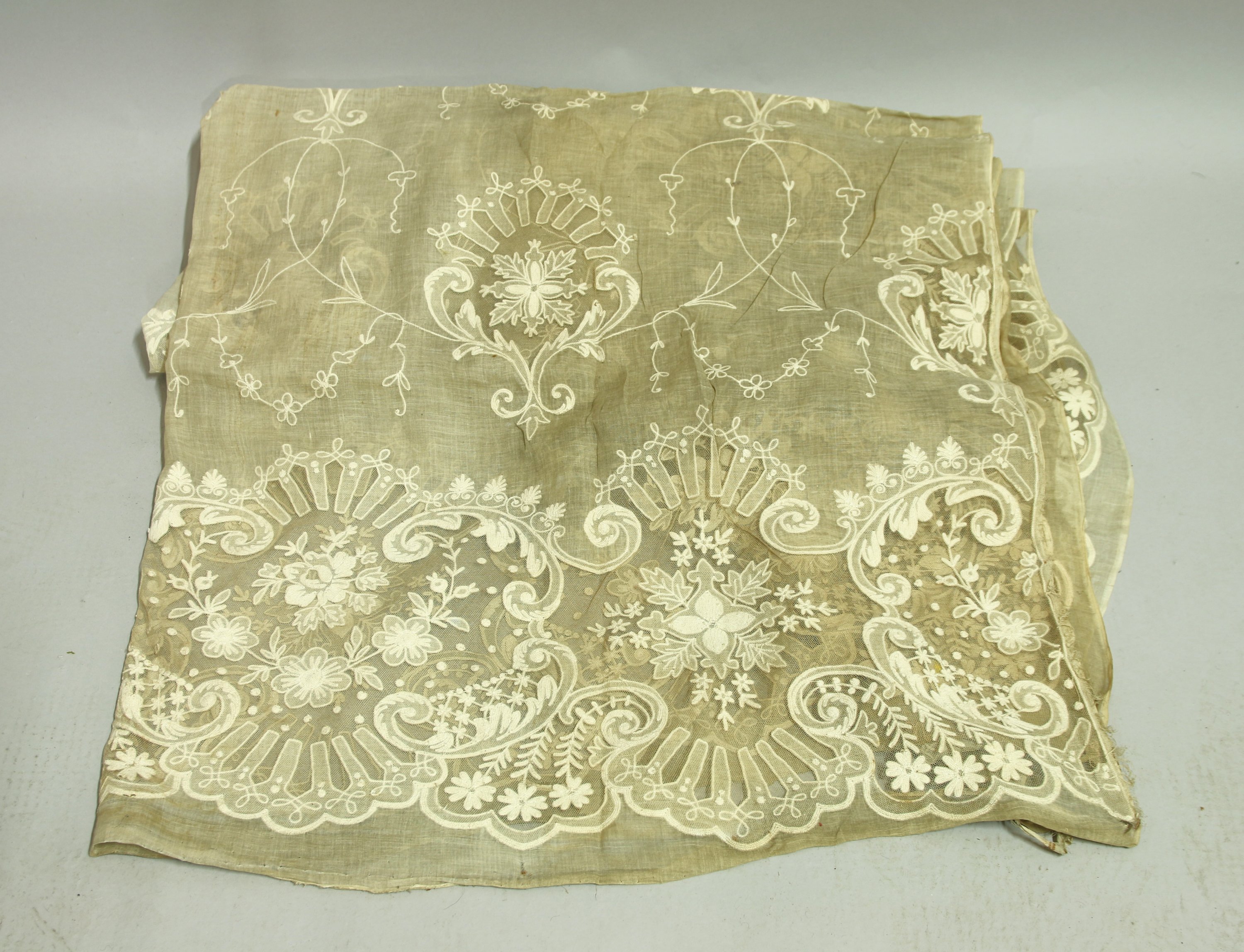 Rideau en voile ajouré et brodé cornély, décor de fleurs et rinceaux, large bordure de fleurs dans des rinceaux.