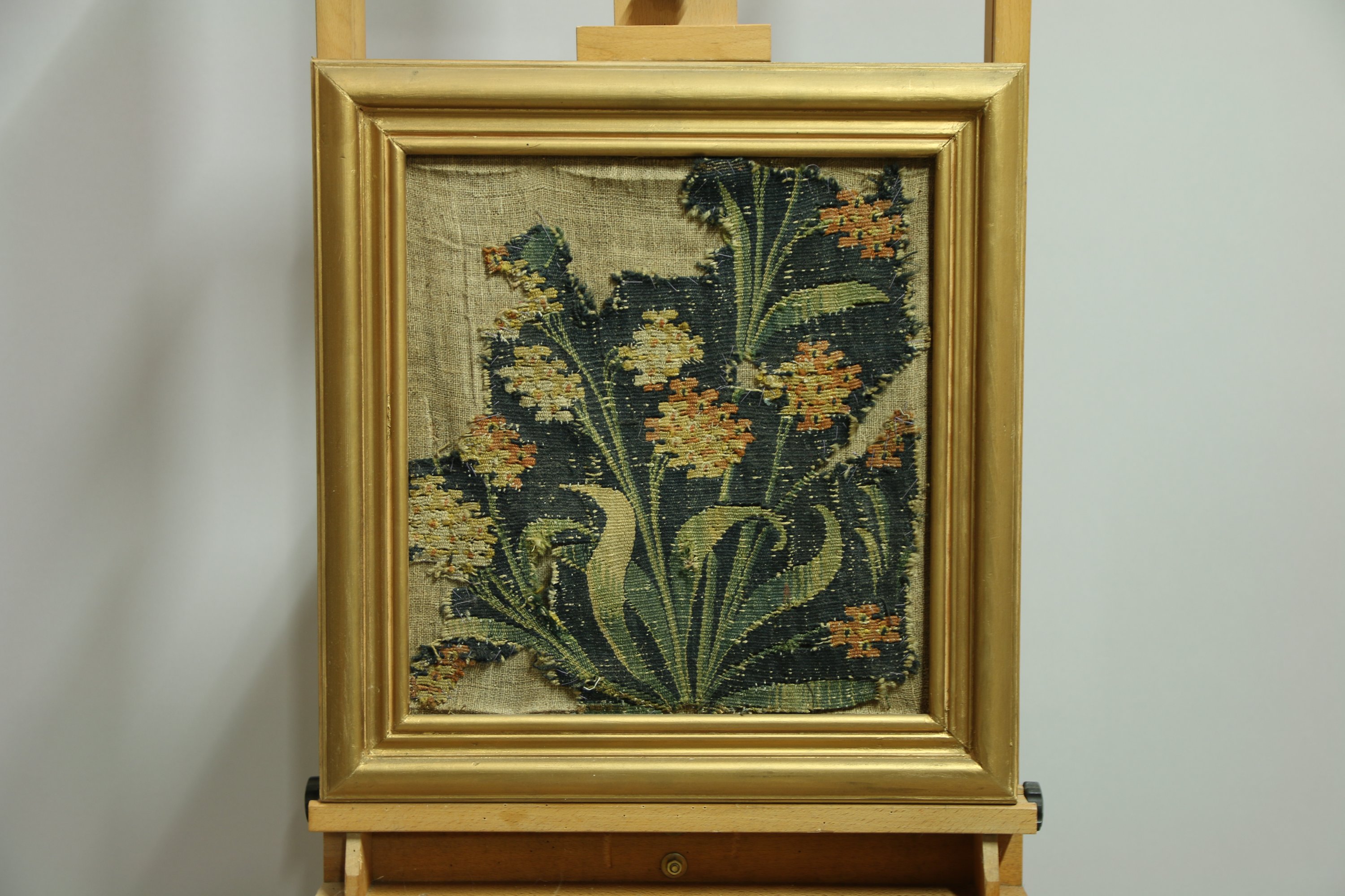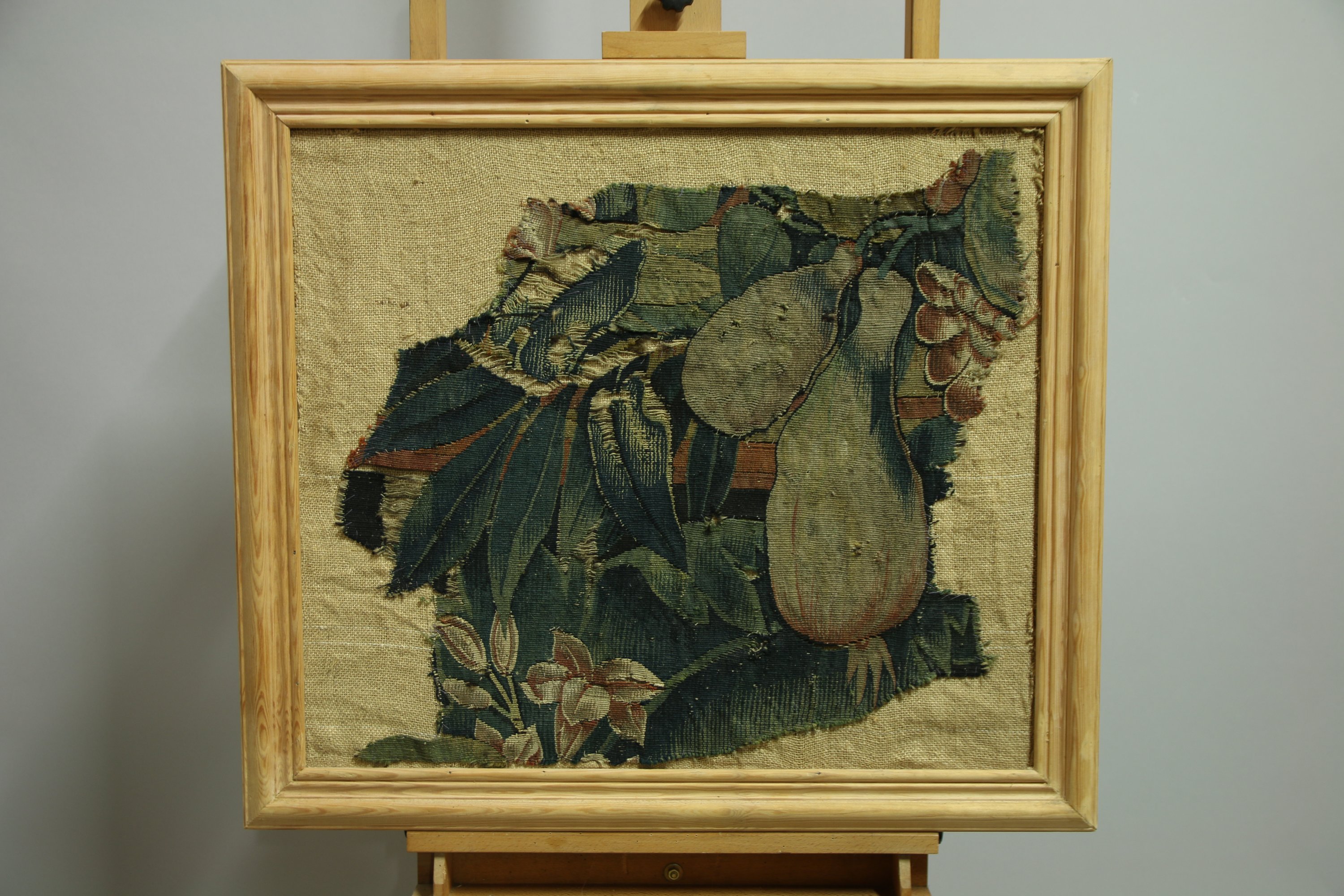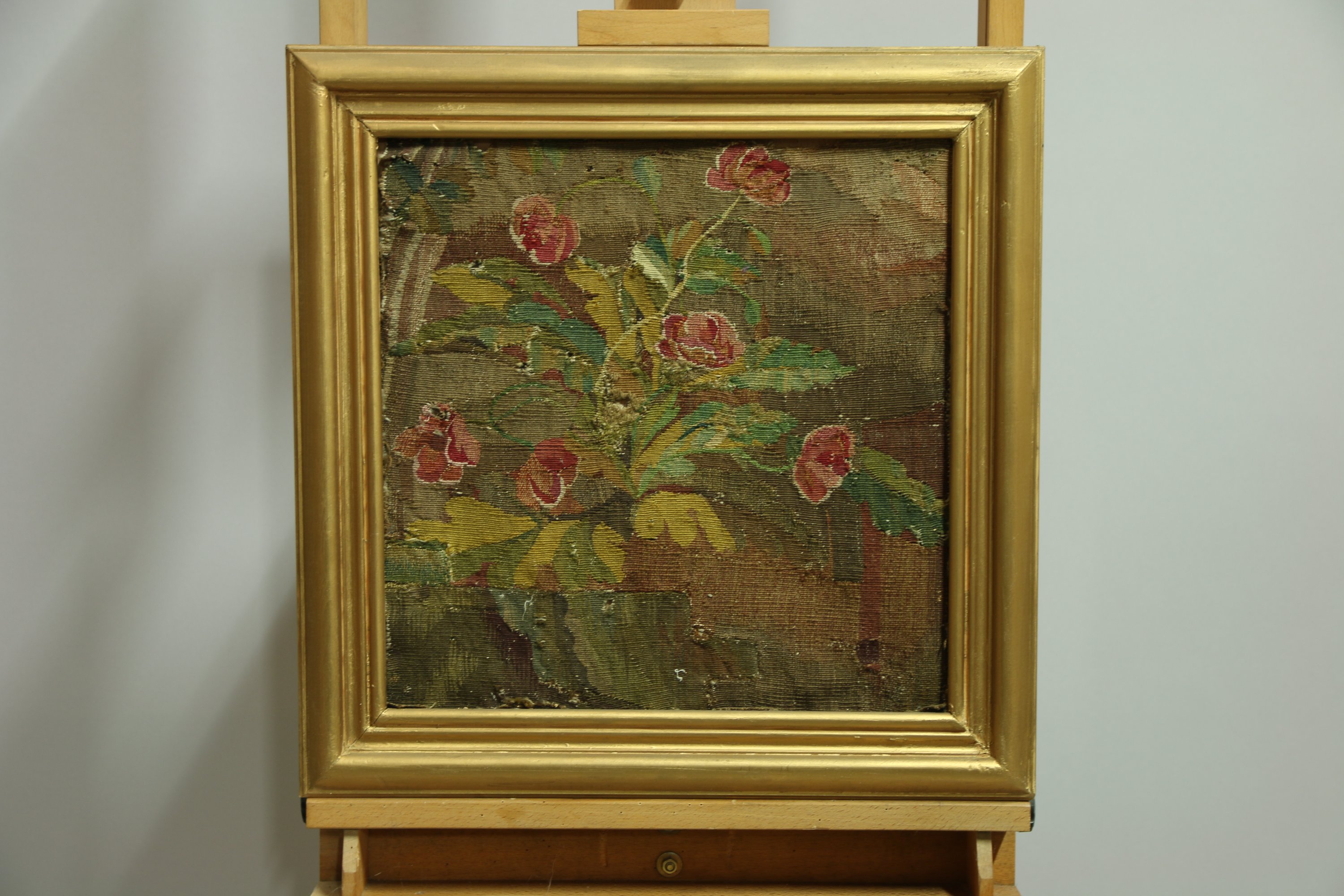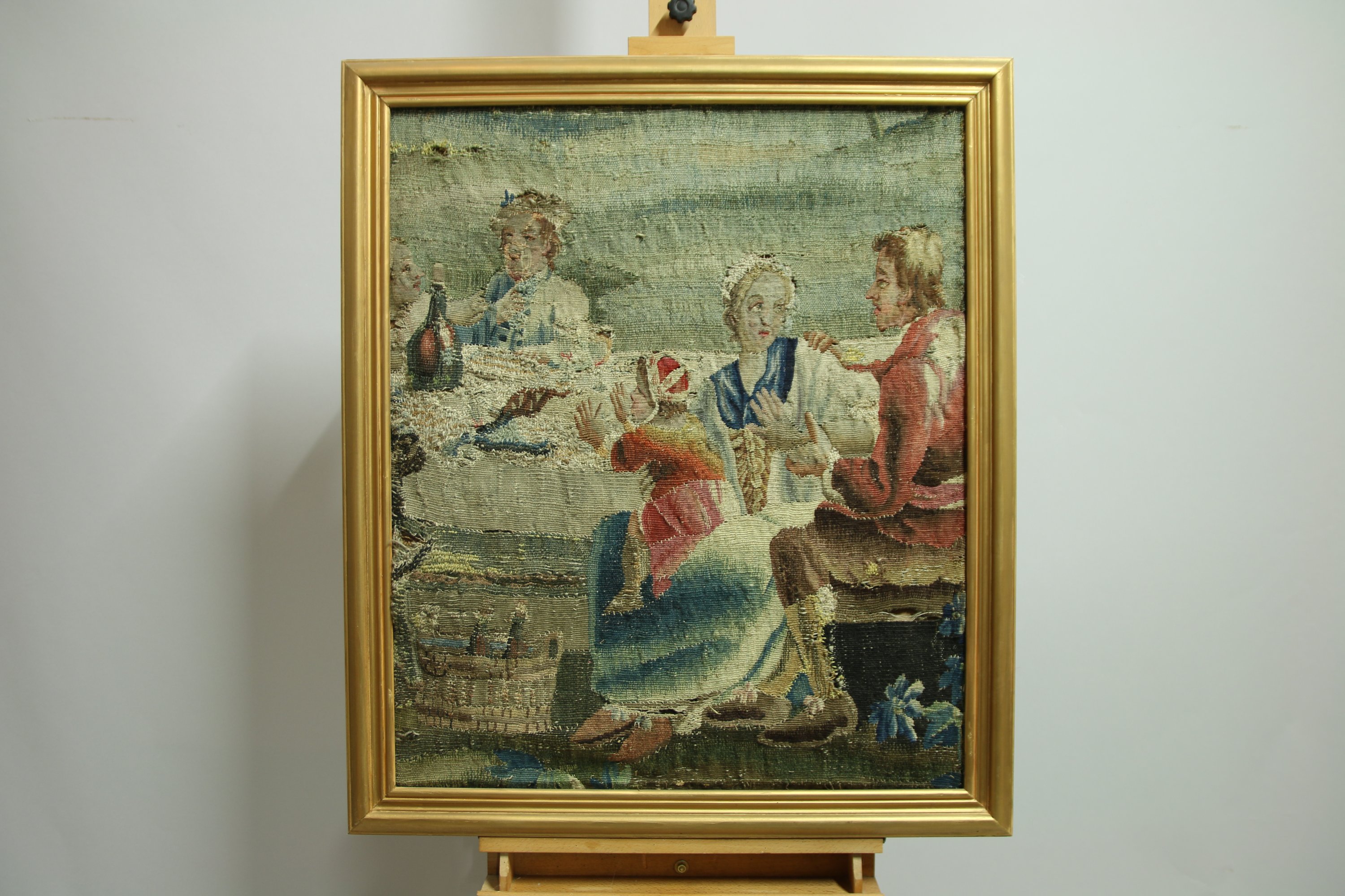 Réunion de fragments de tapisseries encadrés, Flandre, Aubusson, XVI, XVII et XVIIIème siècle, fleurs, fruits et personnages daprès Julliard dans la suite de Téniers.