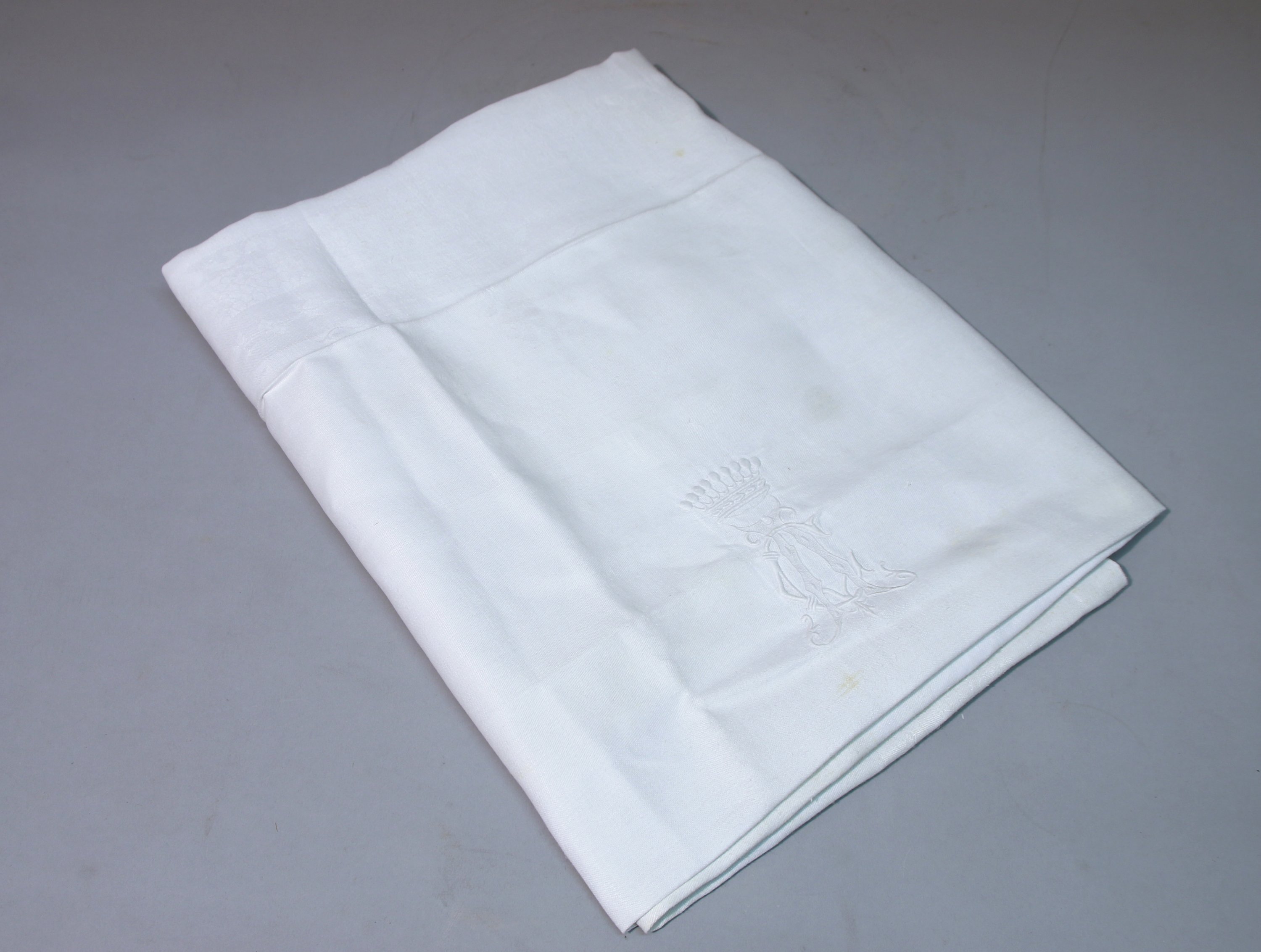 Nappe damassée, brodée du chiffre AC sous une couronne de comte.