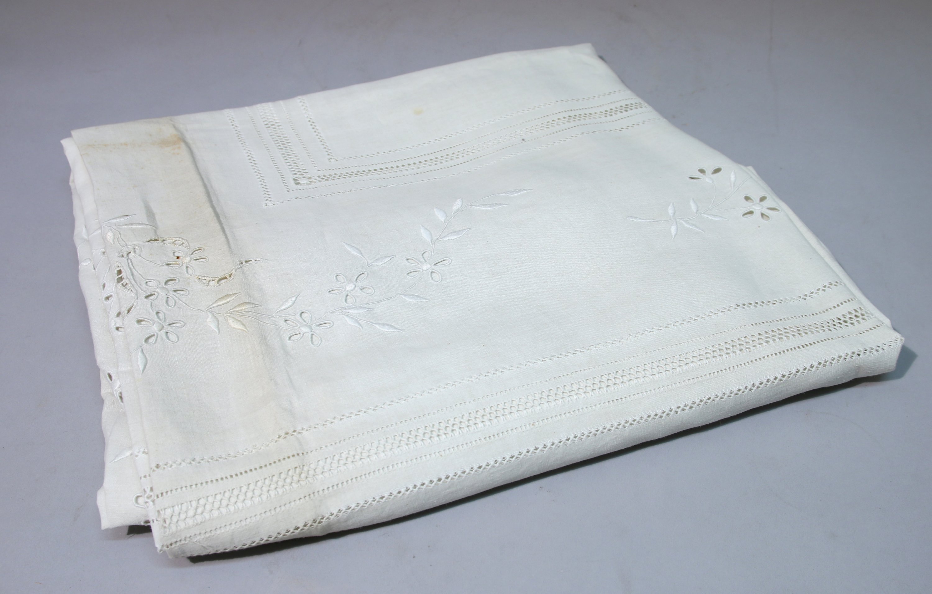 Drap en fil, ajouré et brodé de fleurs et d’un chiffre (usures, taches).