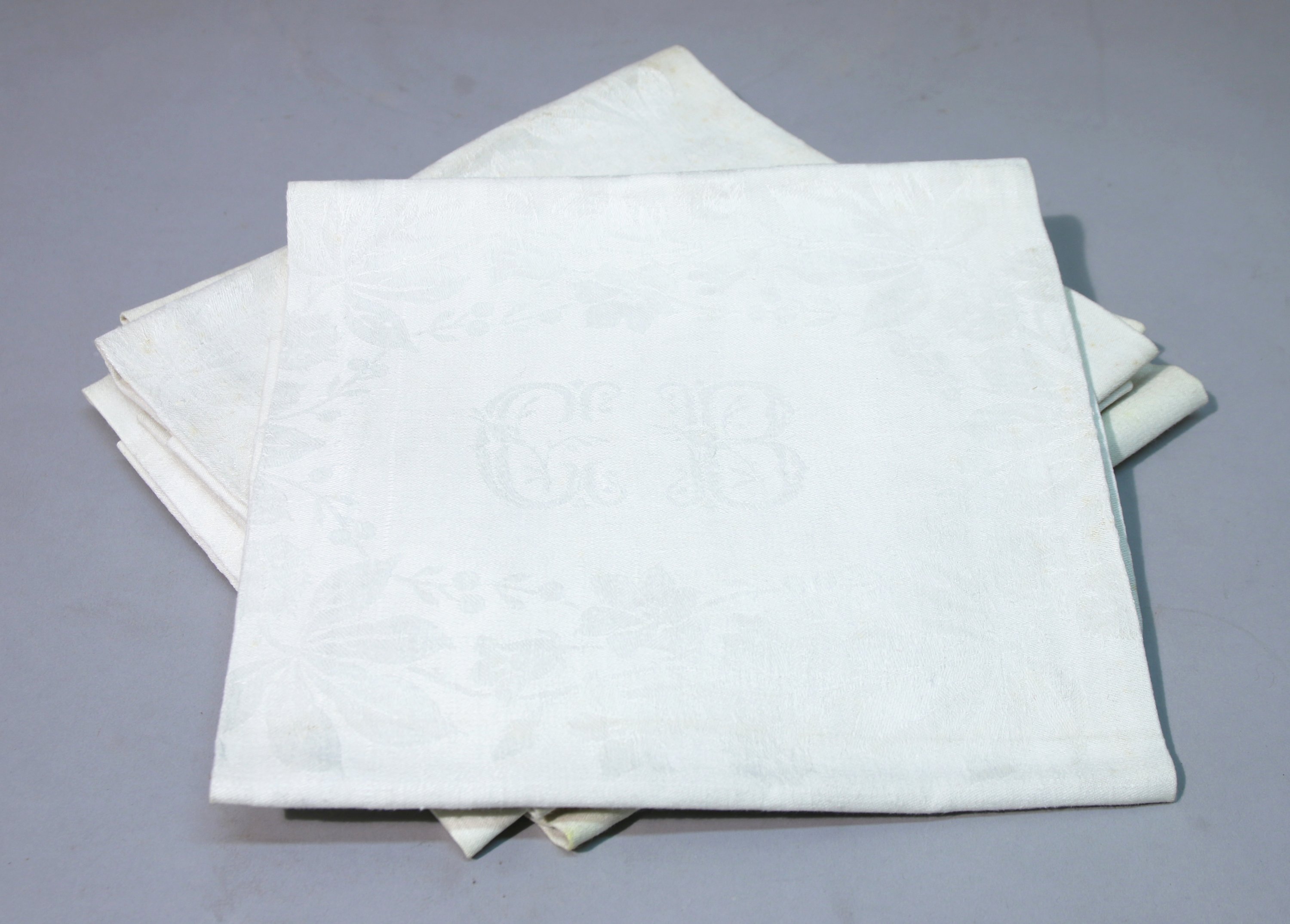 Six serviettes damassées d’une double couronne laurée autour du chiffre CB.