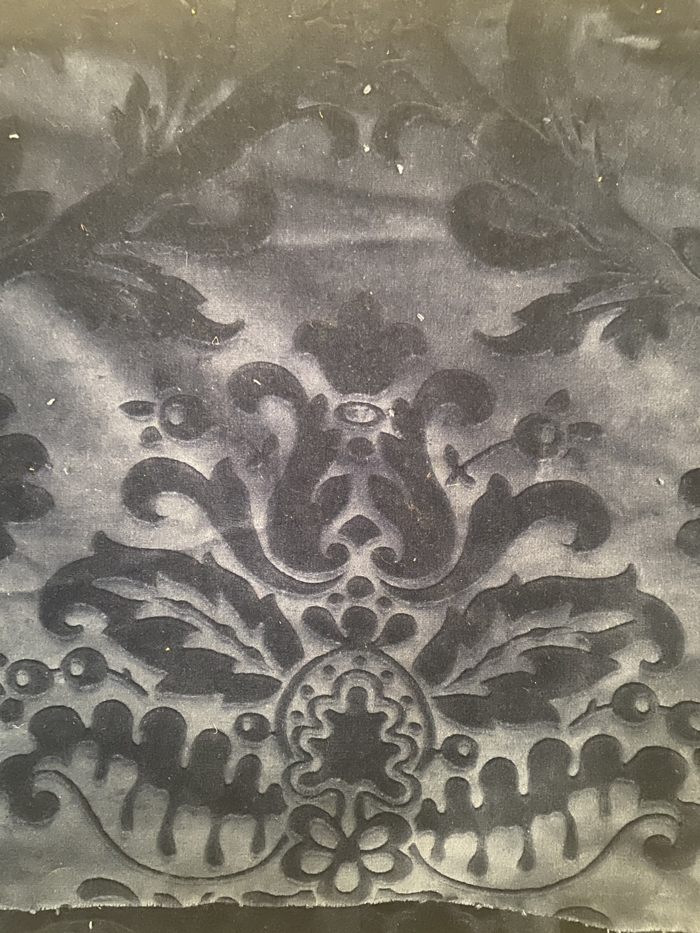 Bande de velours gaufré bleu roi, style du XVIIIème siècle, rinceaux de fleurs et grenades.