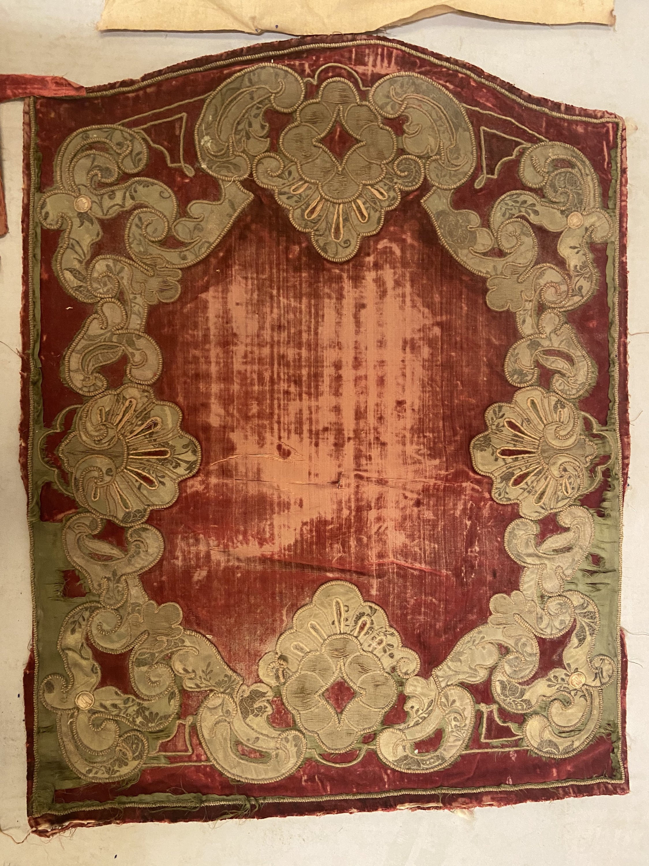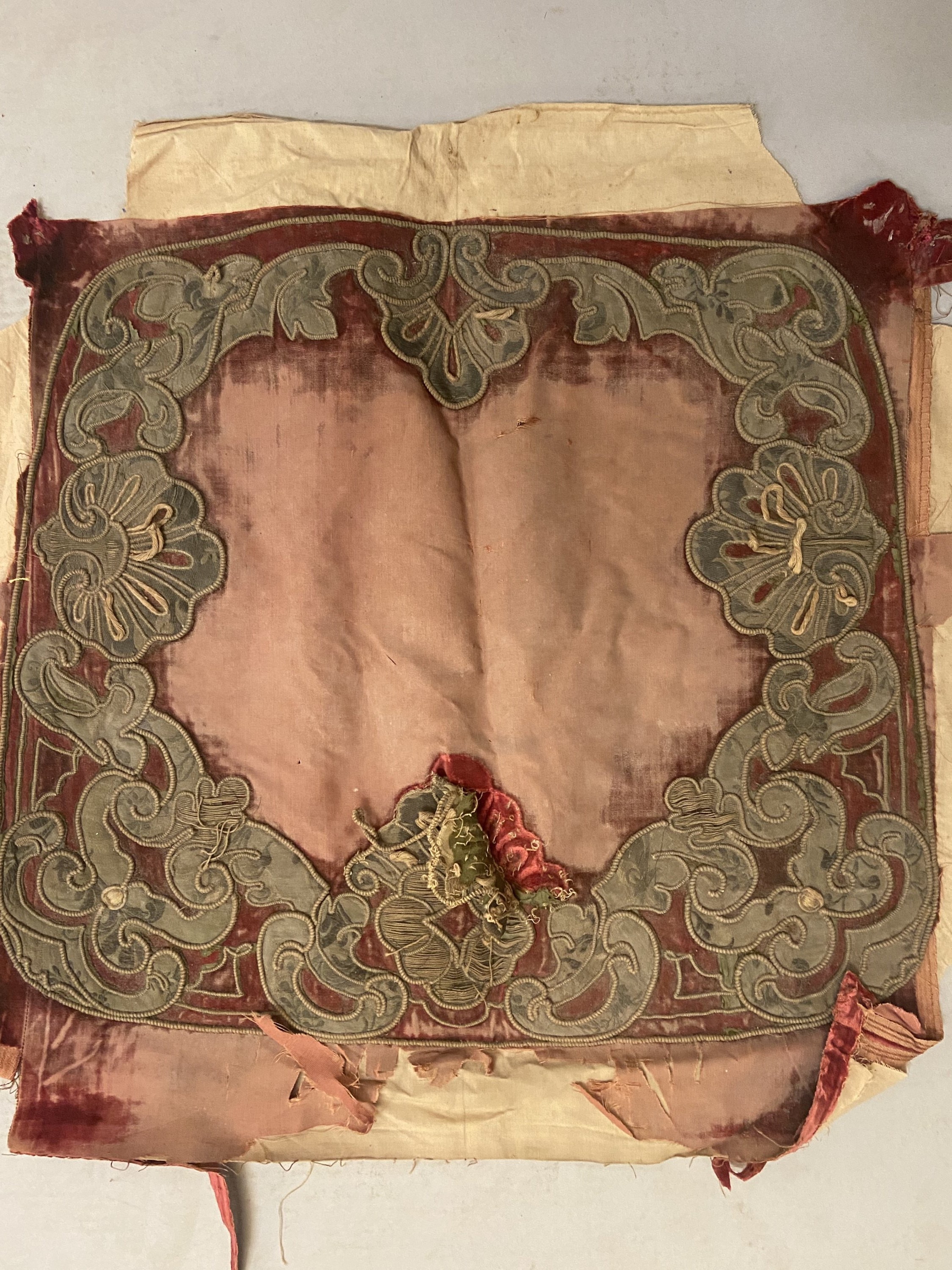 Trois panneaux, style Louis XIV, fond de velours cramoisi, décor en application de satin et fil cordonnet de fleurs et rinceaux (usures, coupures).