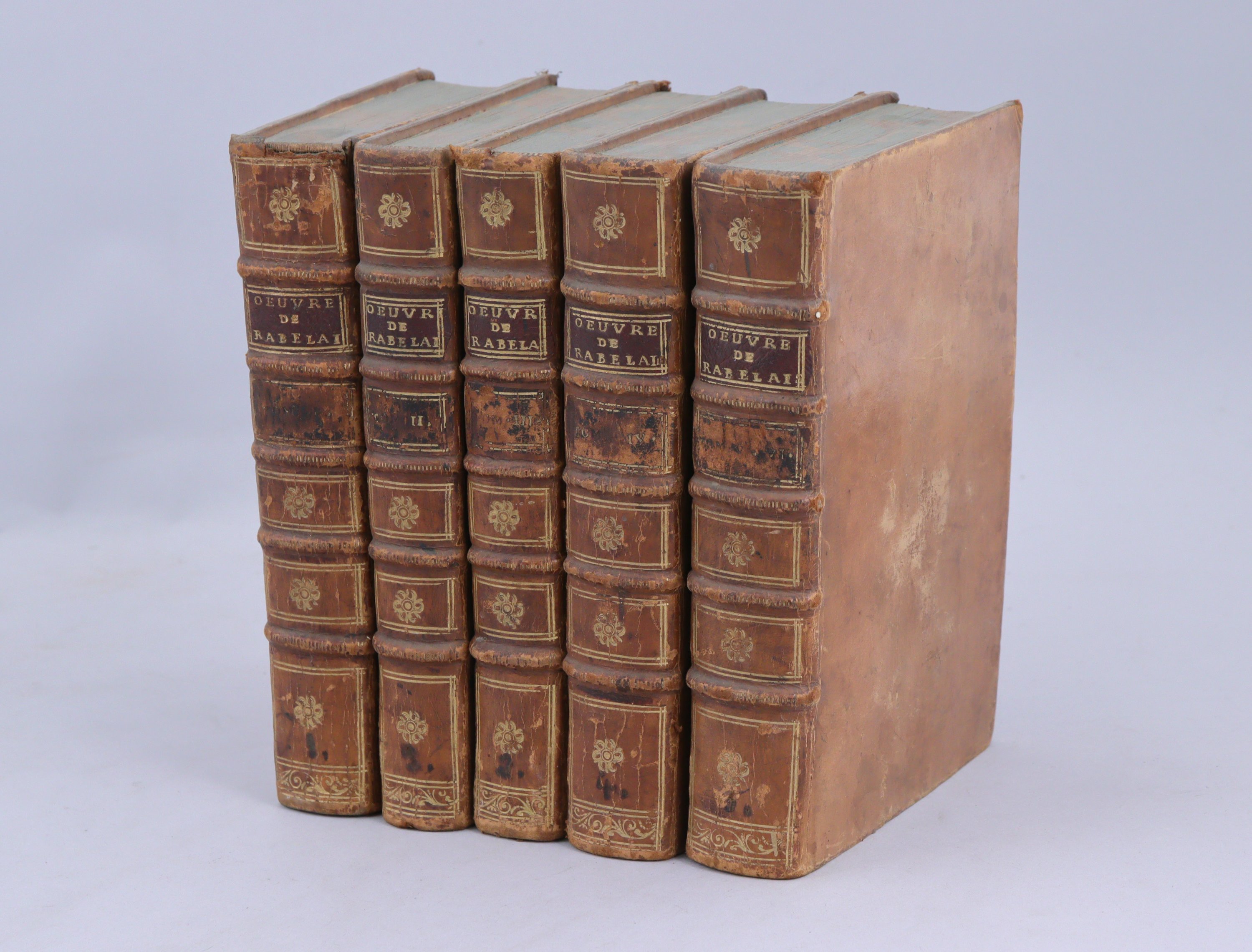 5 volumes in-8, plein veau fauve du temps, tranches marbrées. (Les pièces de tomaison sont effacées.. Légères usures à 3 coiffes et à 2 coins).