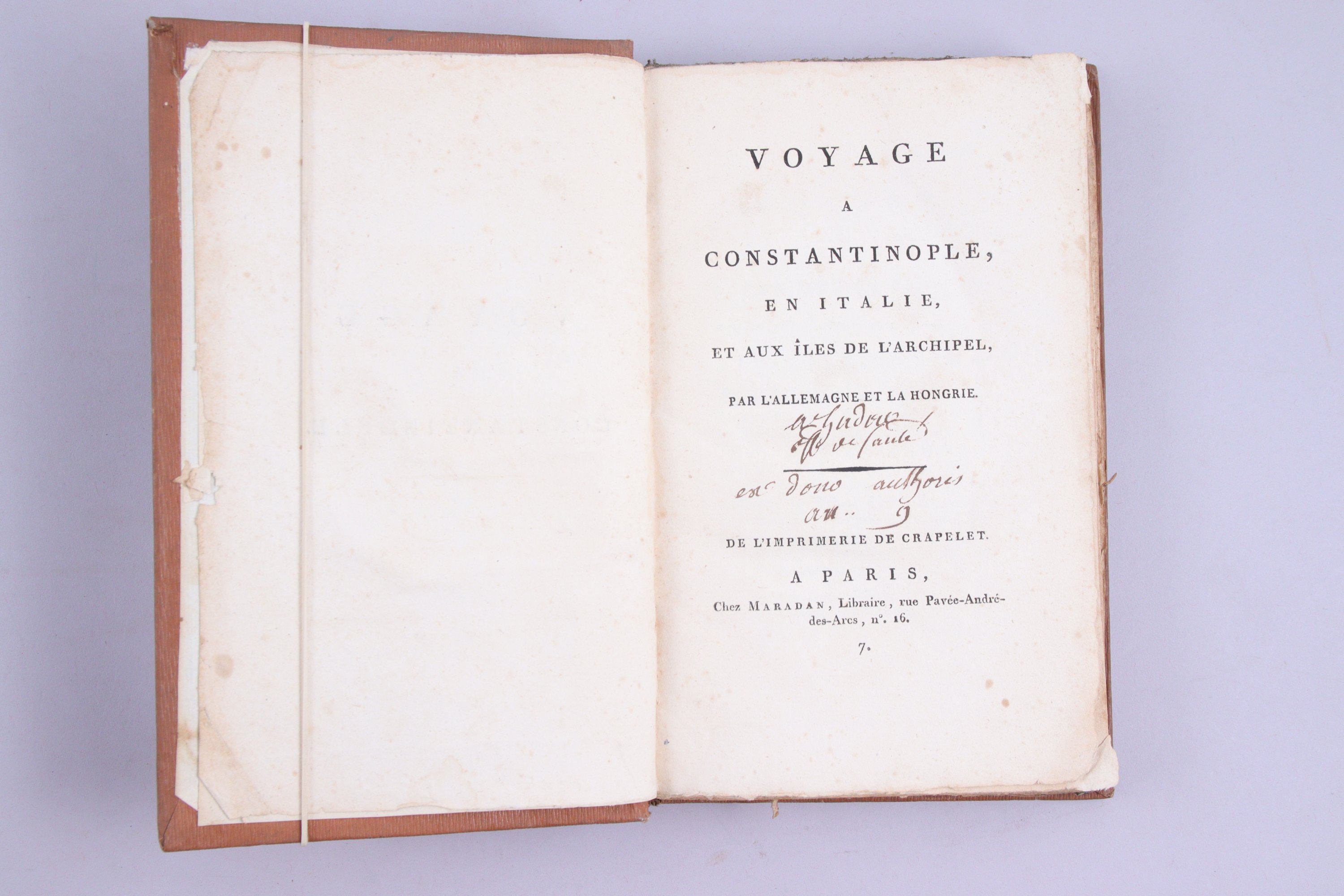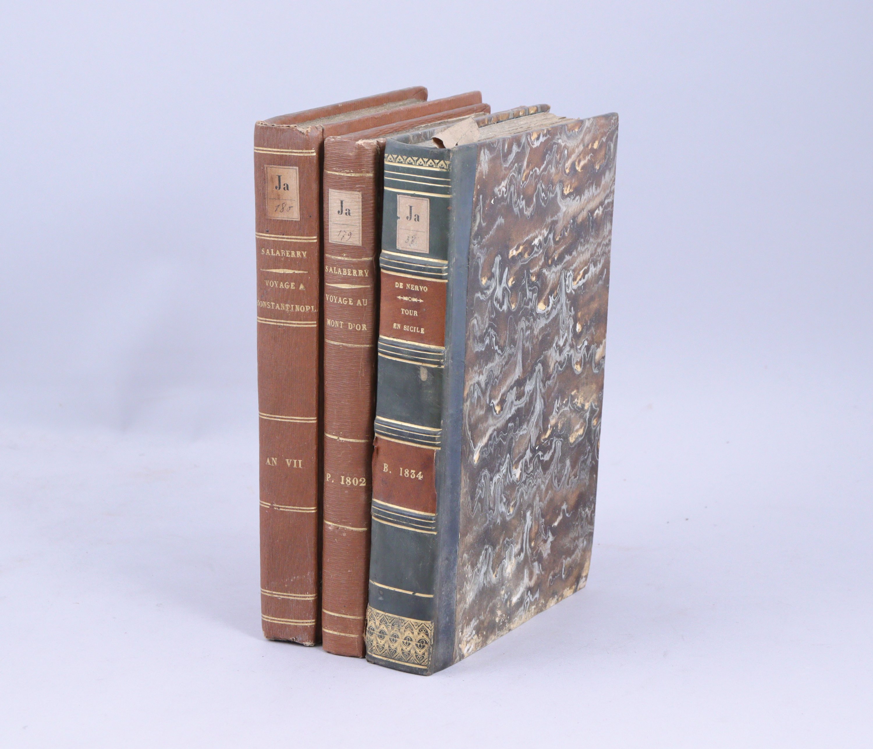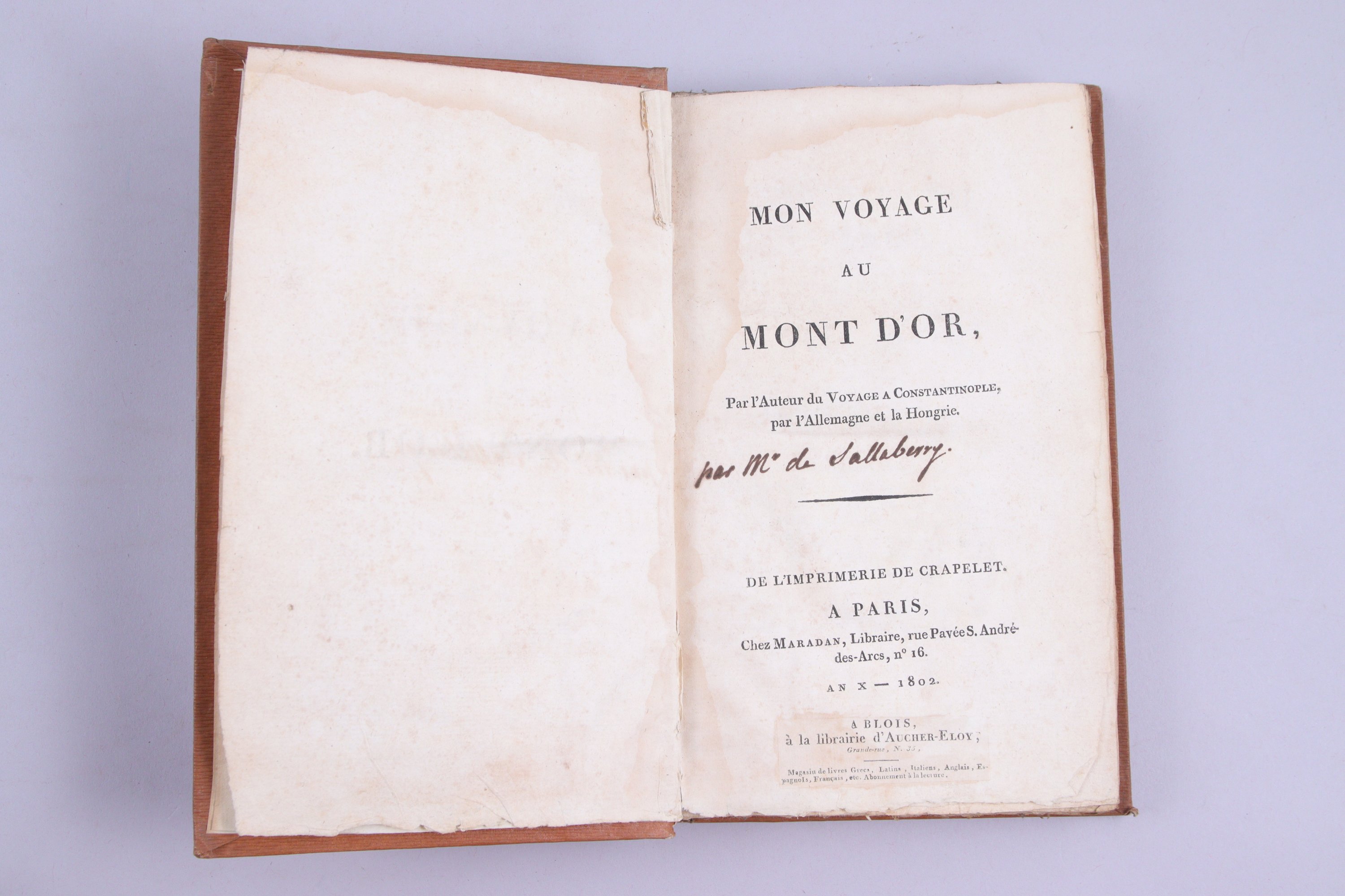 - ( Charles Marie d'Irumberry de Sallaberry): Mon voyage au Mont d'Or. Par l'auteur du Voyage à Constantinople. Paris, Crapelet et Maradan, an X (1802). In-8, cartonnage du temps. Etiquette d'Aucher-Eloy. (Mouillures saines dans les marges de tête)