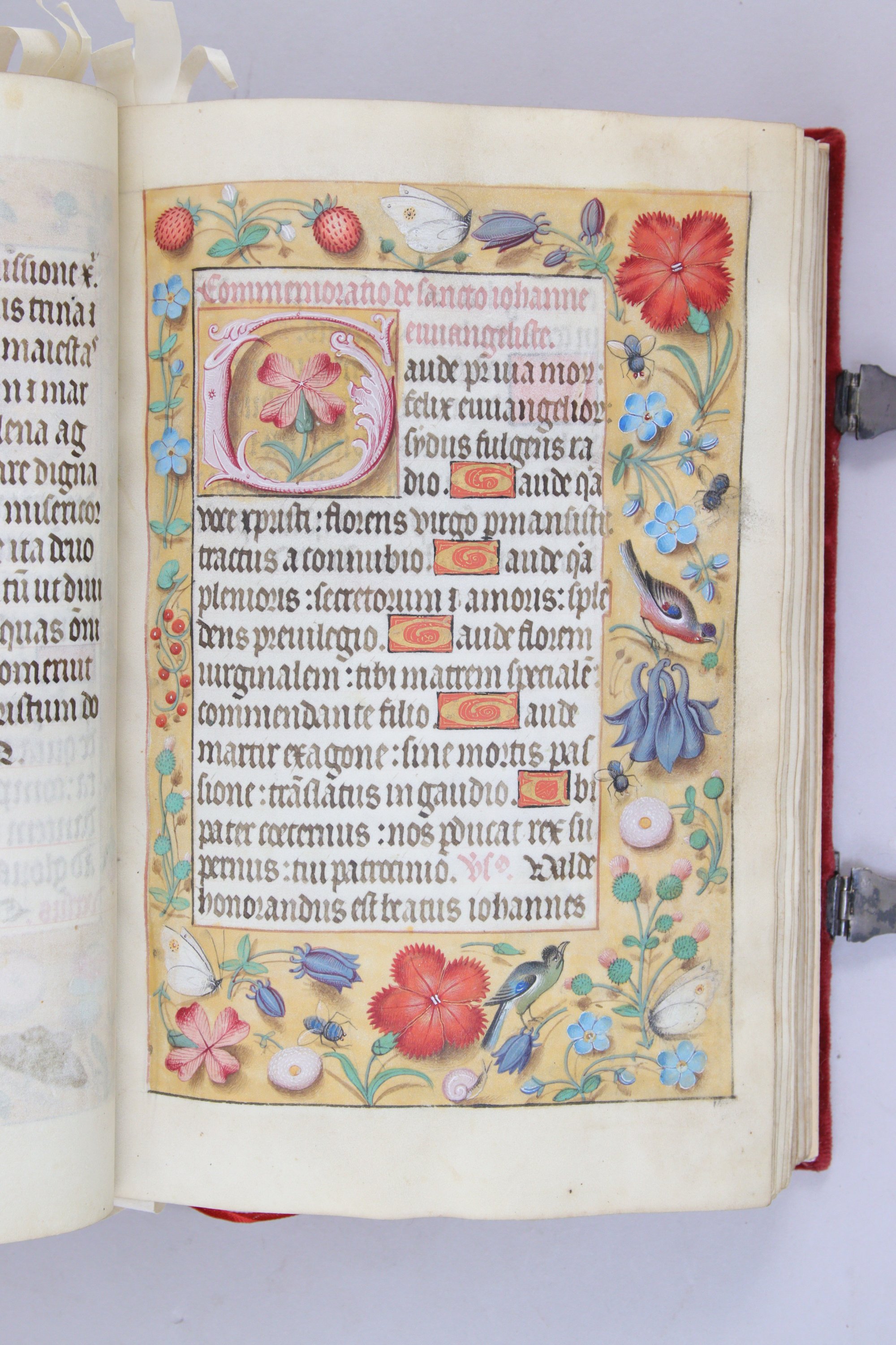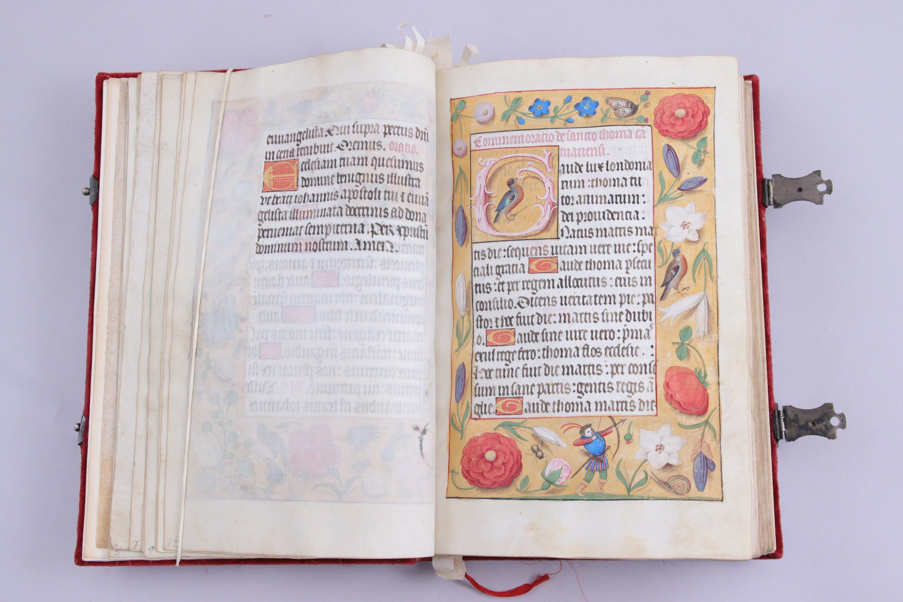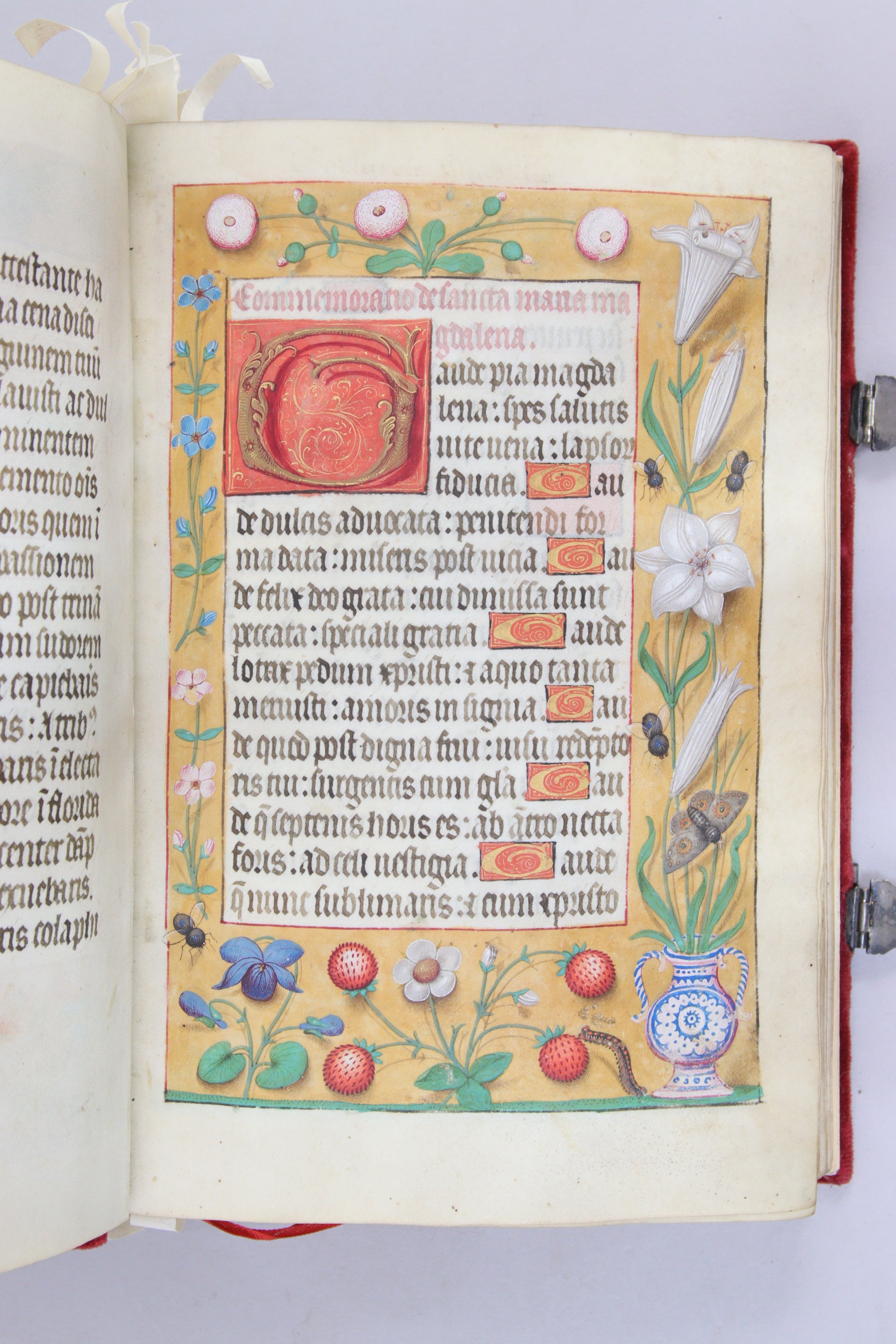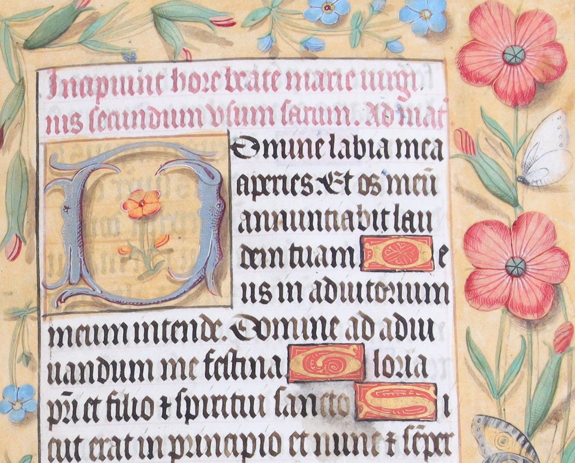 Dune très grande qualité, mais malheureusement amputées dune douzaine de feuillets, ces Heures appartiennent à lEcole dite Ganto-Brugeoise, qui renouvelle lart de la miniature au tournant des XV et XVIème siècles. La variété des motifs, issus directement de la peinture flamande ; l'exceptionnelle maîtrise du travail de l'or, aussi bien dans les à-plats des bordures que dans les innombrables initiales, petites ou grandes, peintes à l'or sur fond au minium (certains des maîtres enlumineurs étaient aussi orfèvres) ; la riche symbolique des sujets évoquant l'éternité ou la réincarnation (paons, oiseaux de Paradis, chenilles et papillons, fleurs épanouies, archer décochant une flèche vers le ciel) ou simplement le travail de l'enlumineur itinérant de ville en ville avec son bagage sur le dos (escargot) ; la douceur des coloris traités au pastel ; tous ces éléments permettent de rapprocher l'artiste de celui qui a peint les bordures, les lettrines et les initiales, petites et grandes, du Livre de prières du Cardinal Albert de Brandebourg, du Livre dHeures provenant dInce Blundell Hall (vendu chez Christie's à Londres le 23 novembre 1998), et même du célèbre Bréviaire Grimani conservé à la Biblioteca Marciana de Venise.