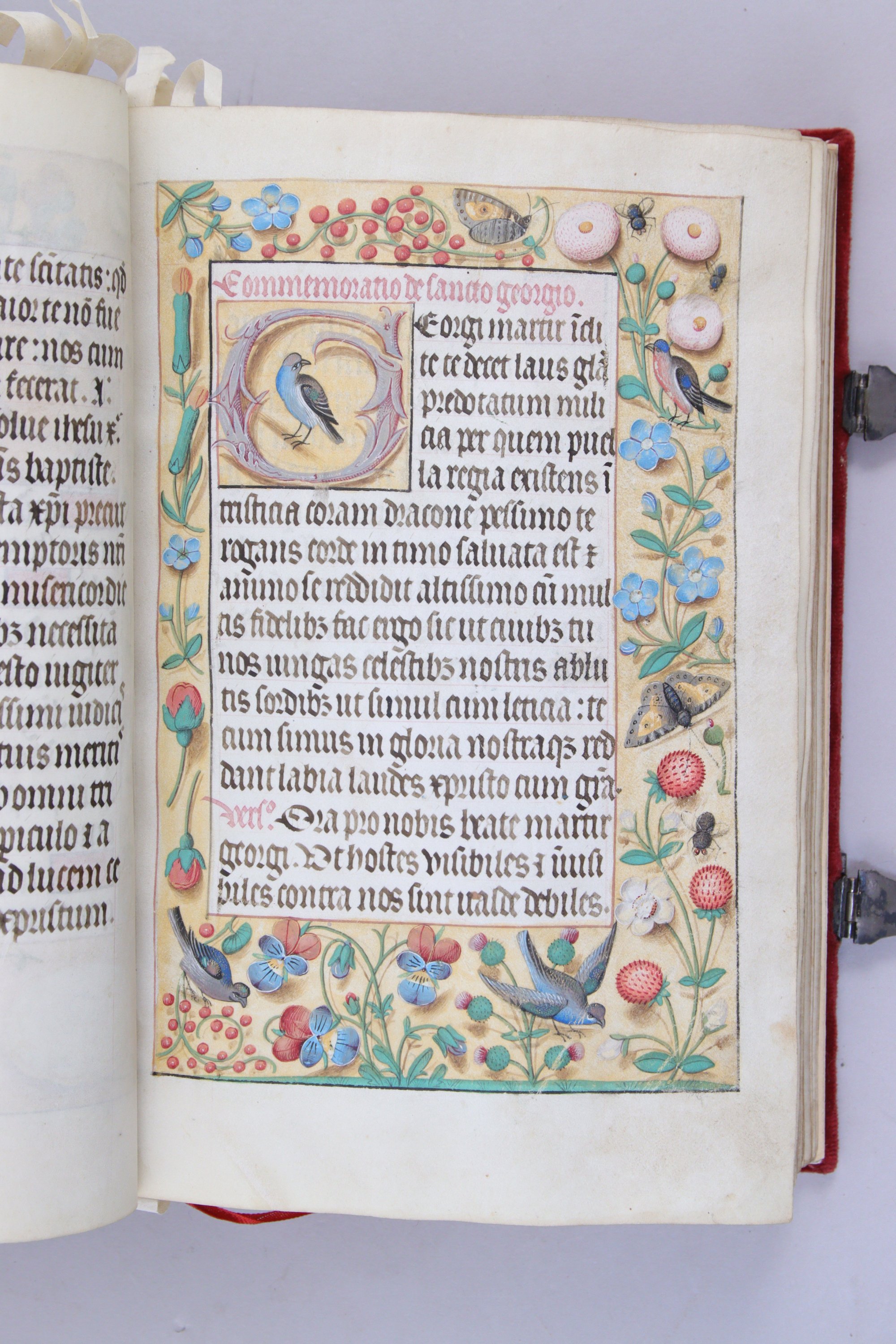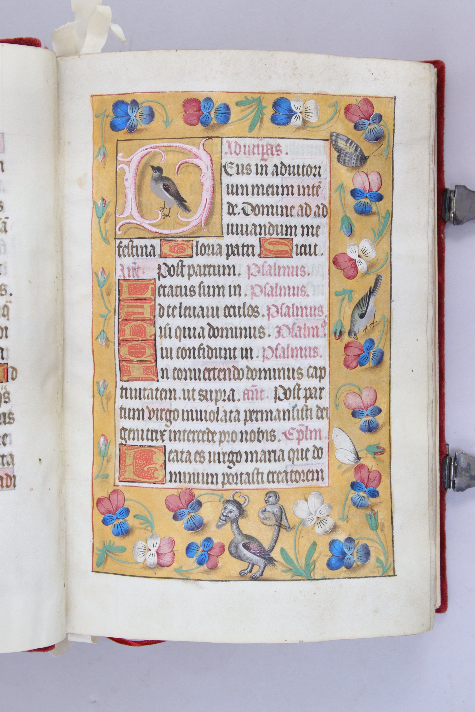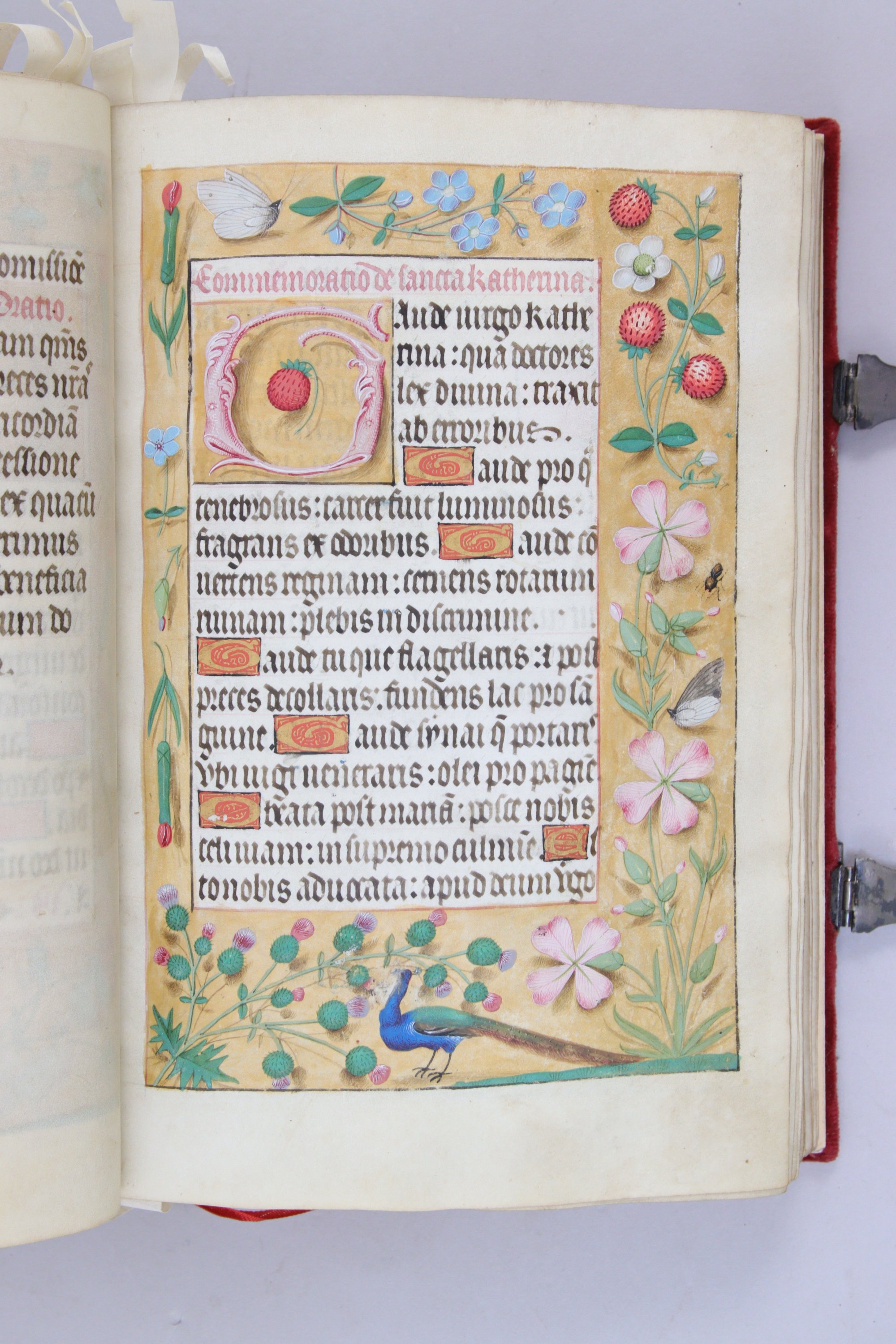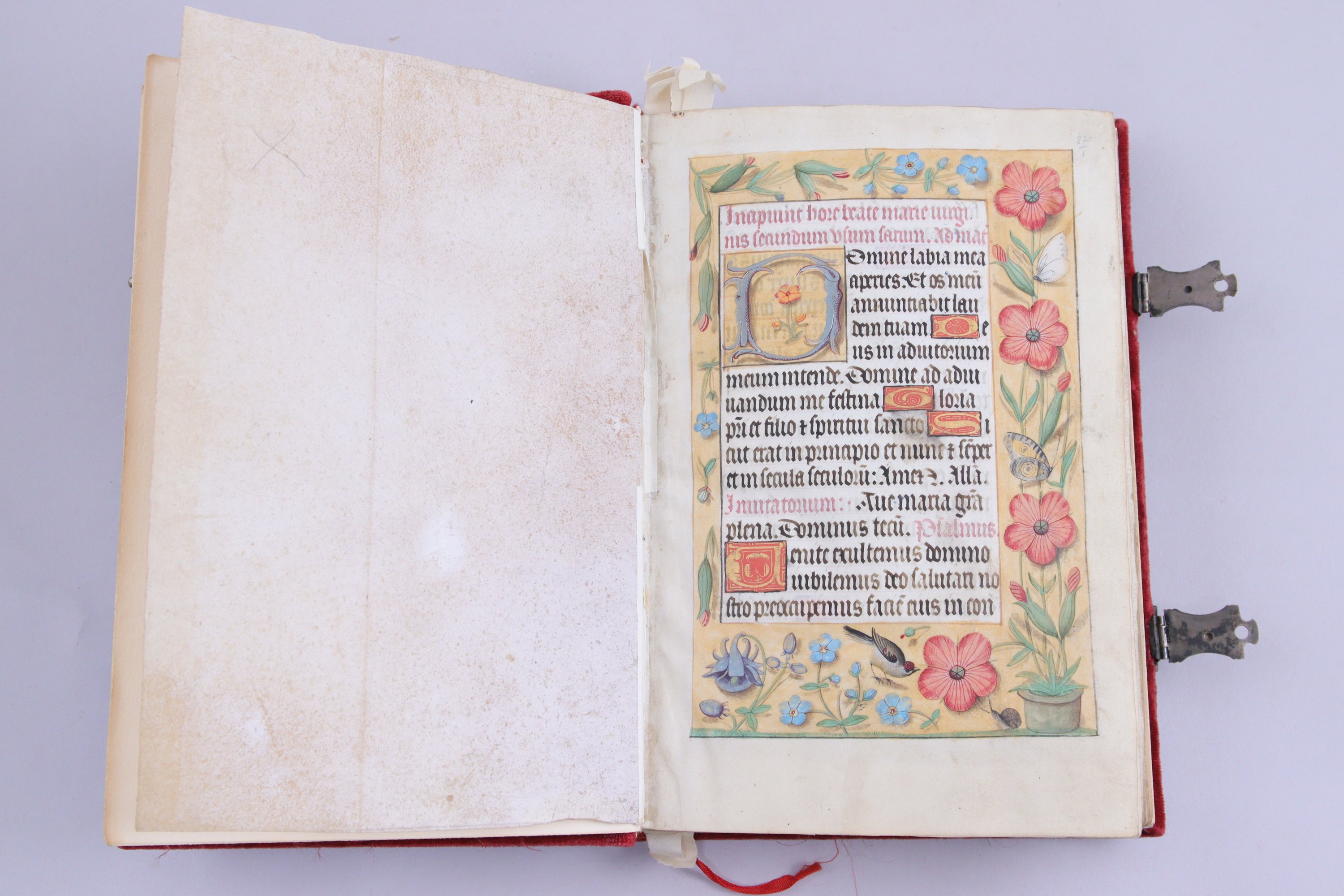 Dune très grande qualité, mais malheureusement amputées dune douzaine de feuillets, ces Heures appartiennent à lEcole dite Ganto-Brugeoise, qui renouvelle lart de la miniature au tournant des XV et XVIème siècles. La variété des motifs, issus directement de la peinture flamande ; l'exceptionnelle maîtrise du travail de l'or, aussi bien dans les à-plats des bordures que dans les innombrables initiales, petites ou grandes, peintes à l'or sur fond au minium (certains des maîtres enlumineurs étaient aussi orfèvres) ; la riche symbolique des sujets évoquant l'éternité ou la réincarnation (paons, oiseaux de Paradis, chenilles et papillons, fleurs épanouies, archer décochant une flèche vers le ciel) ou simplement le travail de l'enlumineur itinérant de ville en ville avec son bagage sur le dos (escargot) ; la douceur des coloris traités au pastel ; tous ces éléments permettent de rapprocher l'artiste de celui qui a peint les bordures, les lettrines et les initiales, petites et grandes, du Livre de prières du Cardinal Albert de Brandebourg, du Livre dHeures provenant dInce Blundell Hall (vendu chez Christie's à Londres le 23 novembre 1998), et même du célèbre Bréviaire Grimani conservé à la Biblioteca Marciana de Venise.