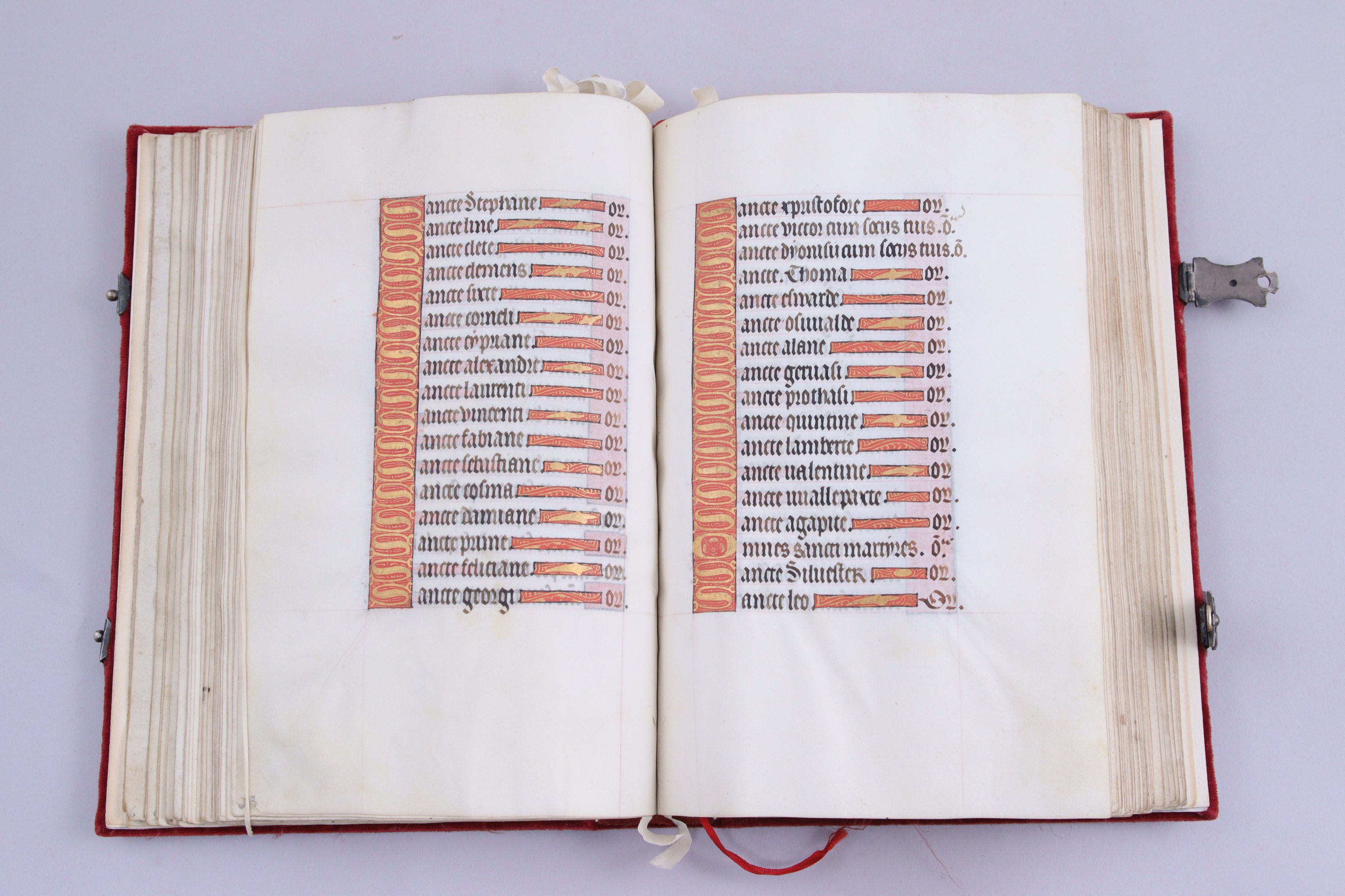 Le texte, à lencre noire avec quelques passages en rouge, est rehaussé de plus de 1000 initiales dune grande finesse, peintes à lor sur fond rouge minium, la plupart de la hauteur dune ligne et demie (6 X 12 mm), mais souvent de deux lignes et demie (15 X 15 mm) ou 3 lignes et demie (20 X 28 mm). Les initiales des litanies des saints sont particulièrement saisissantes.