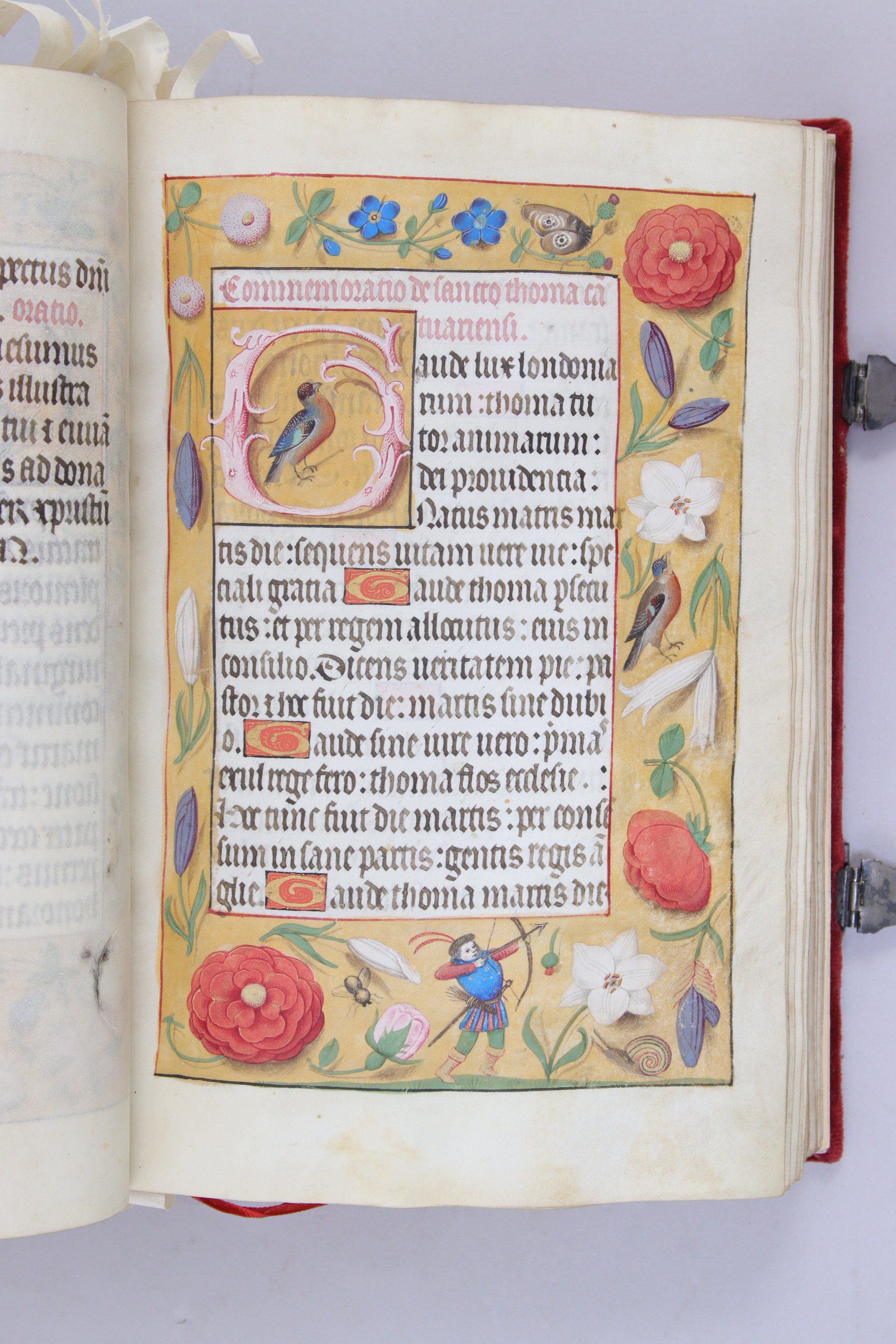 Seize feuillets sont ornés au recto dune grande initiale à fond dor (circa 33 X 34 mm), dans laquelle sinscrit une fleur, une pierre précieuse, un oiseau ou un fruit. Larges bordures dencadrement sur fond dor, avec fleurs variées (parfois dans un vase), fraises et groseilles, oiseaux, escargots, chenilles et papillons, mouches, joyaux et pierres précieuses. Sur le feuillet 4 (dont le texte commence par le premier verset du psaume 70) est peint un oiseau fantastique à tête humaine portant des cornes, la queue se transformant en joueur de luth. Sur le feuillet 13 (Commémoration de Thomas Becket) au milieu du décor de fleurs et danimaux, un archer décoche une flèche (33 X 25 mm): cest la seule figure humaine présente sur ces 16 feuillets enluminés.